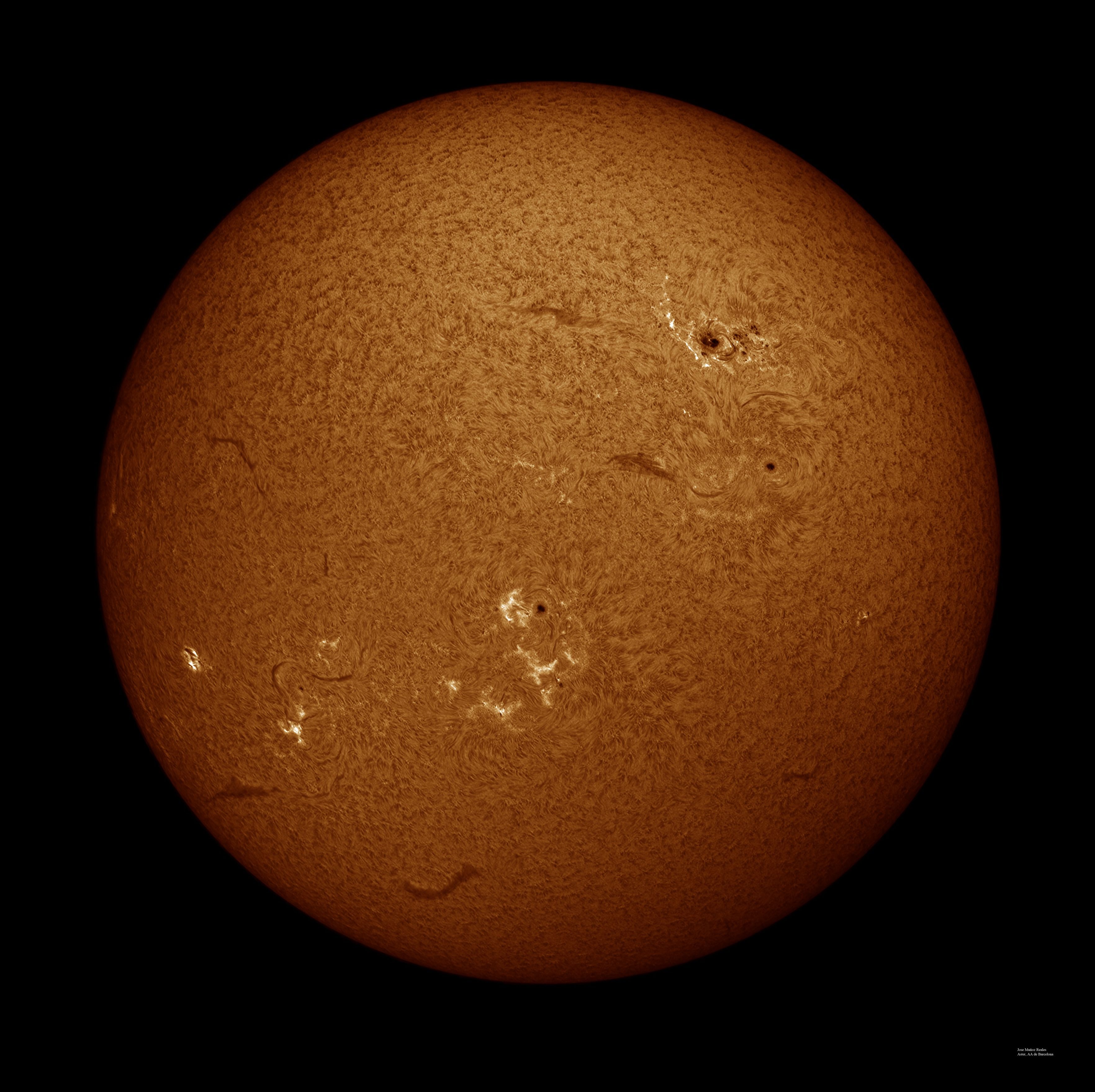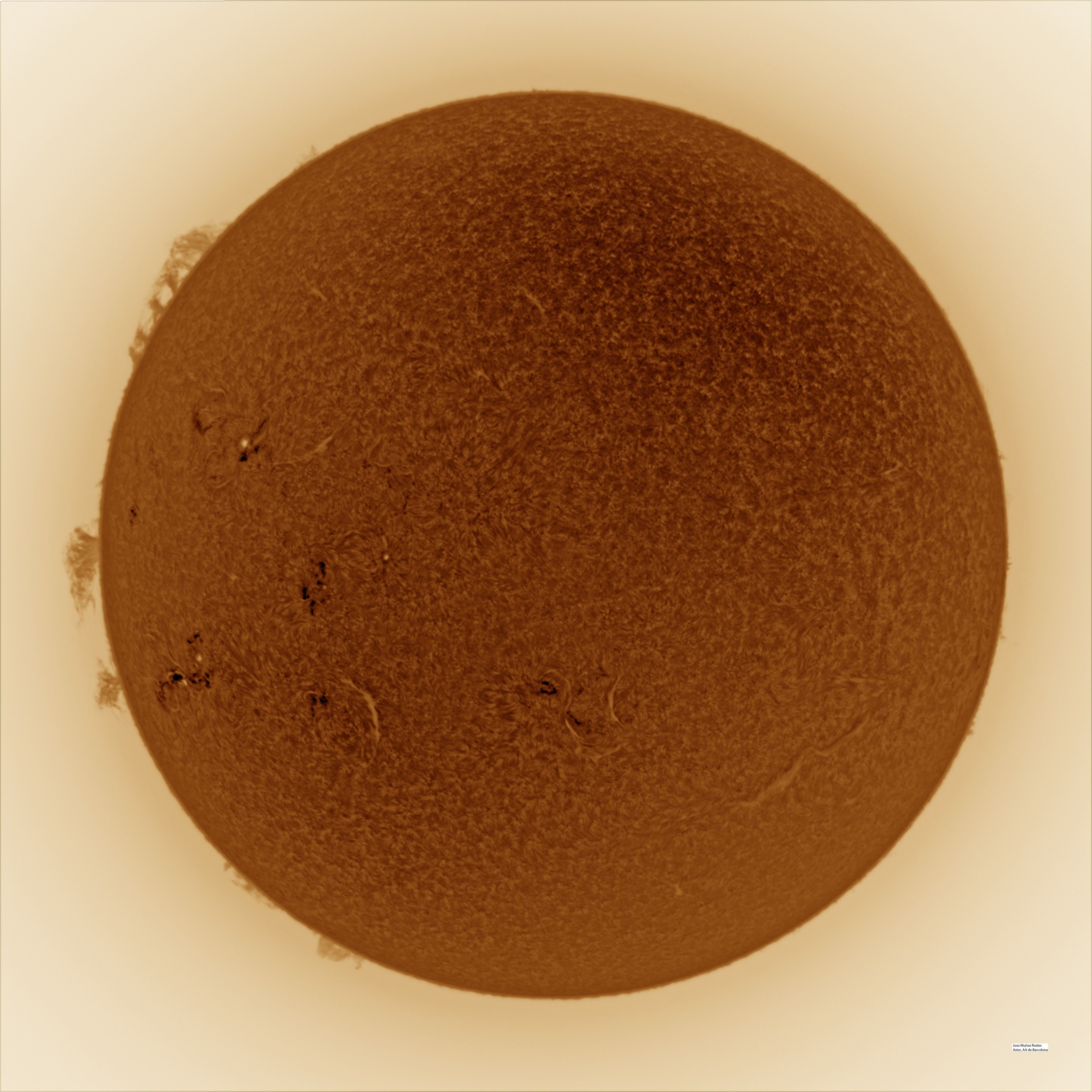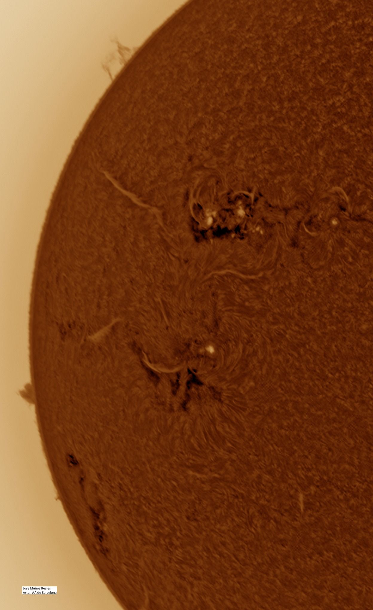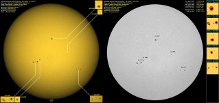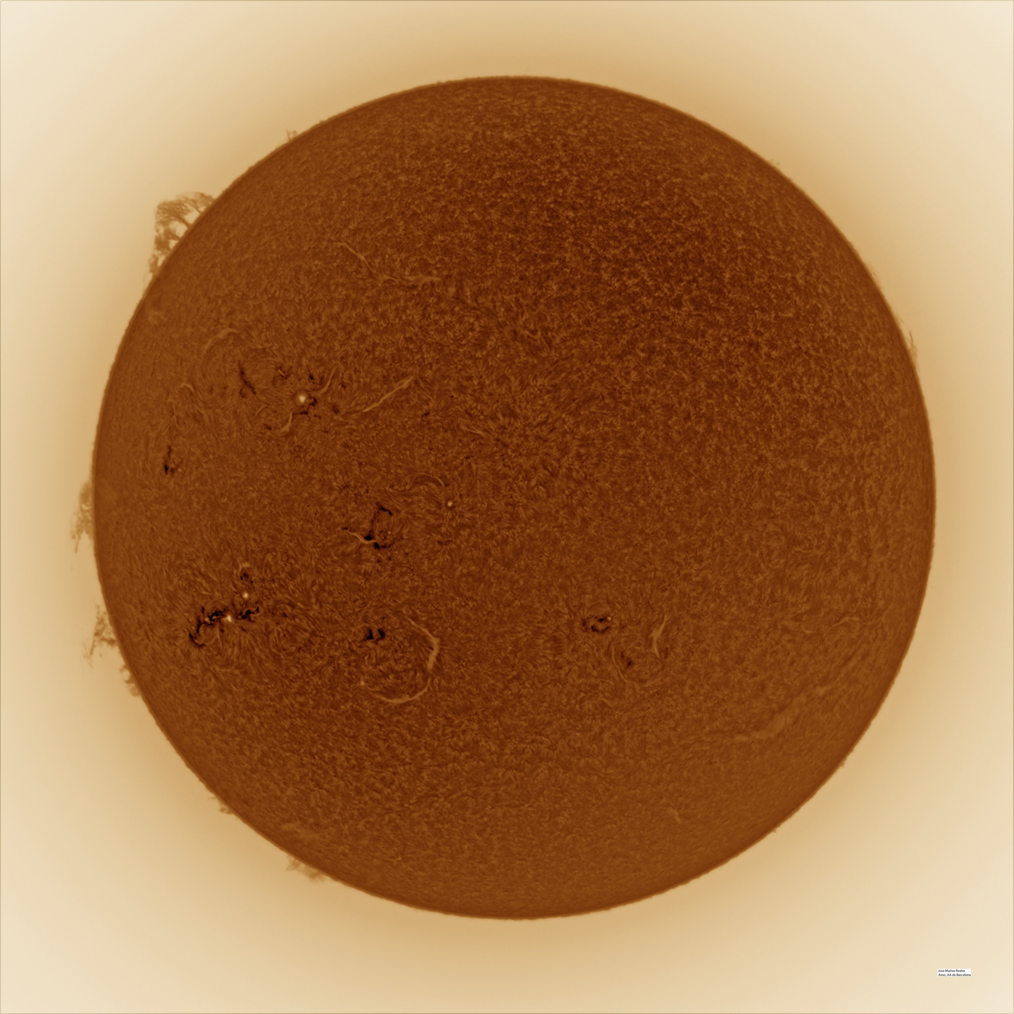 | Autor: José Muñoz Reales Disco: - Coronado SM60 + R90/600 + BF30 + ASI1600 Regiones: - Lunt 100mm/0.7A + R102/1000 + BF12 + barlow 2.5x + ASI174 Luz blanca: - R140/800 + barlow 3x + solar continuum + prisma Herschel + ASI290 |