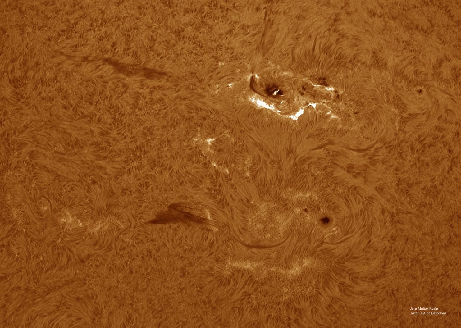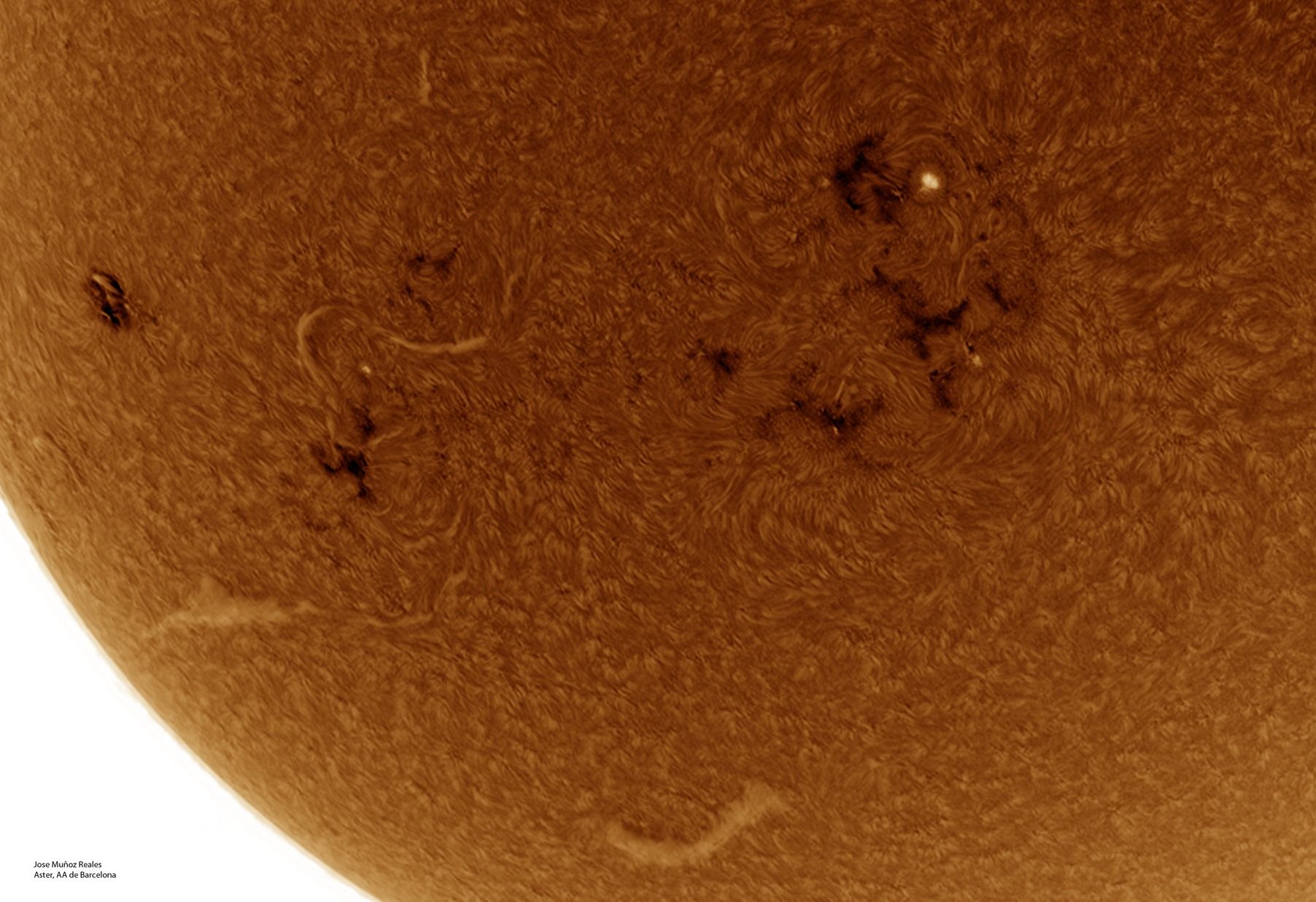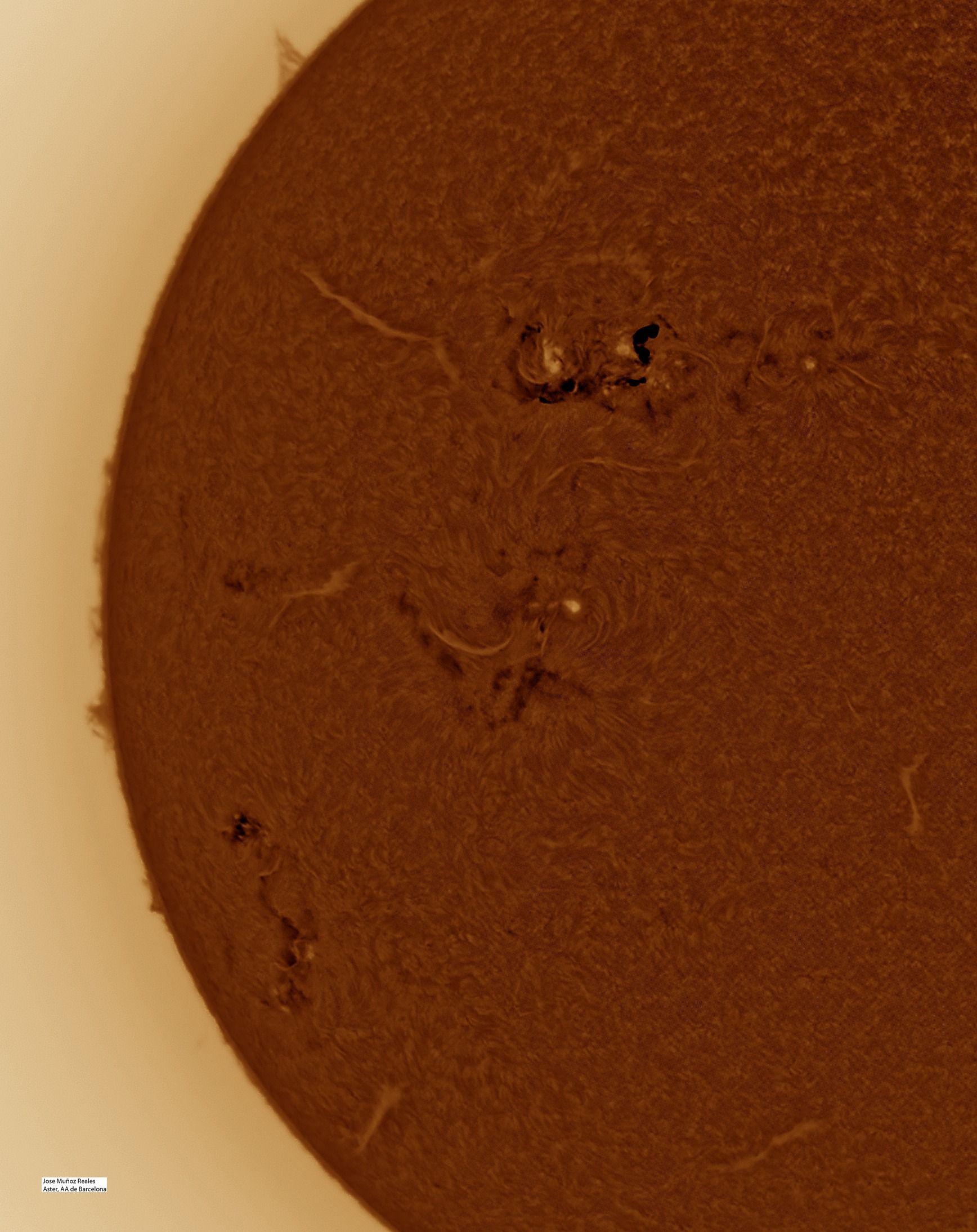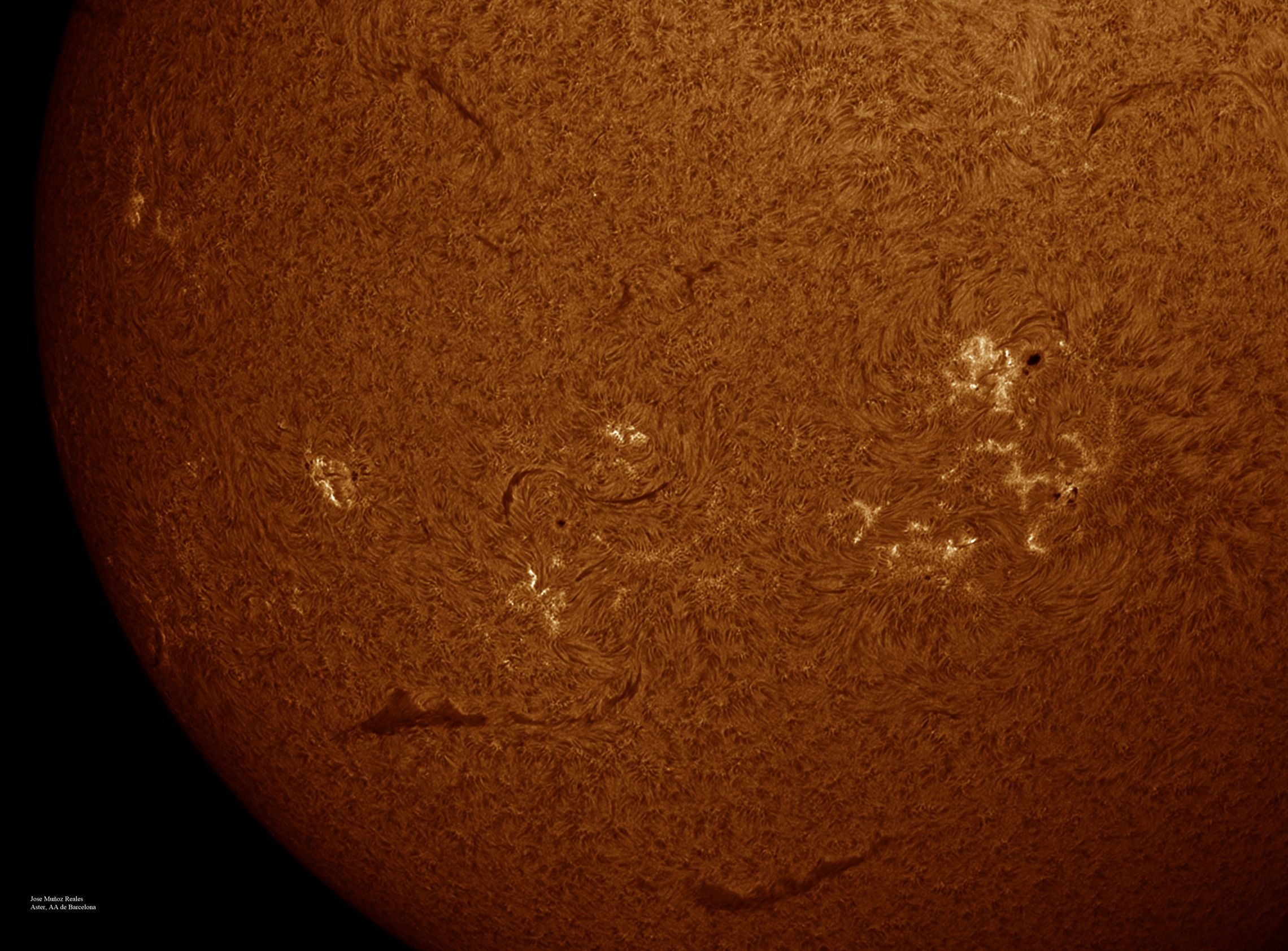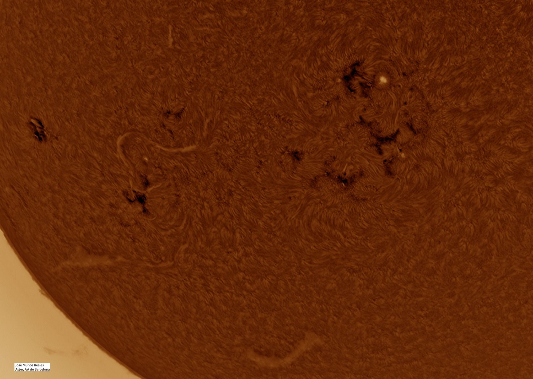 | Autor: Albert Sánchez Instrumento: - Ha: ED120 f-38 + ASI183MM + Quark H alpha - Ca: Baader K-Line - Visible: Filtro Calcio y Baader Astrosolar |