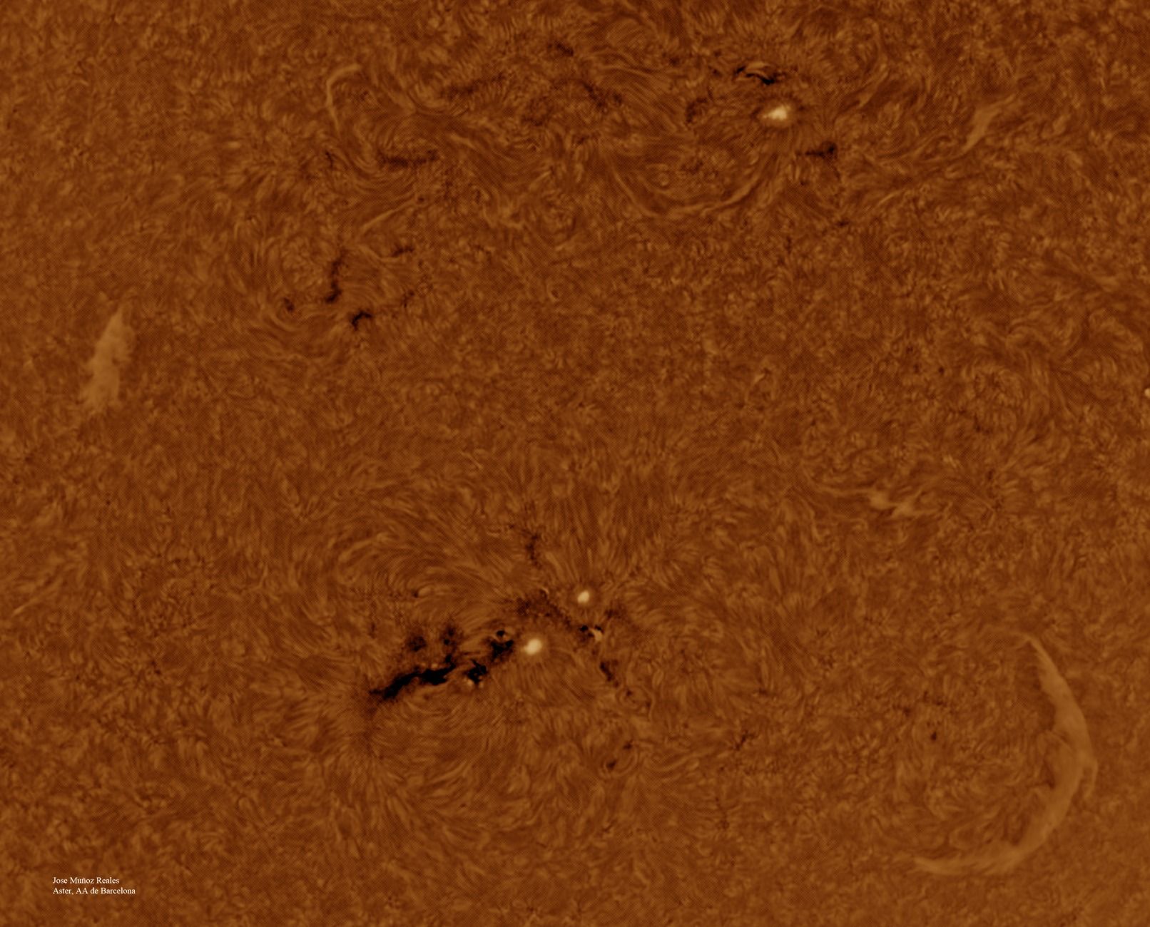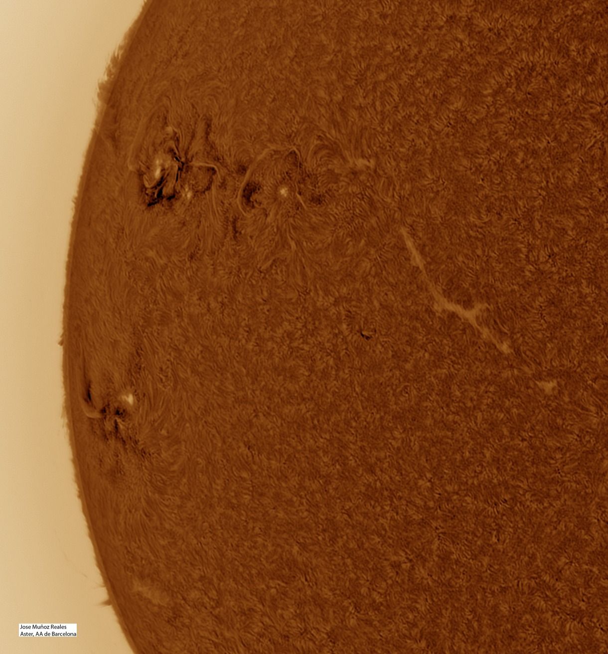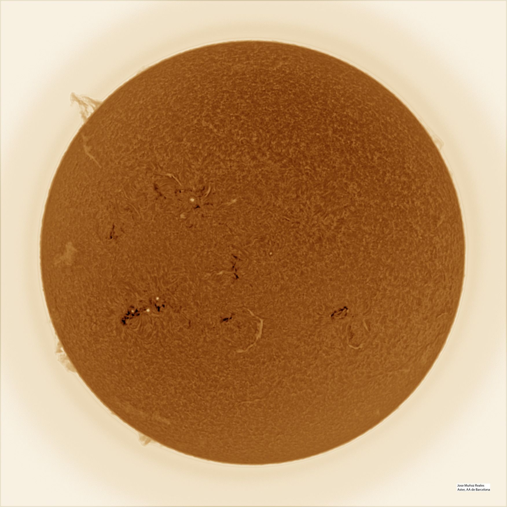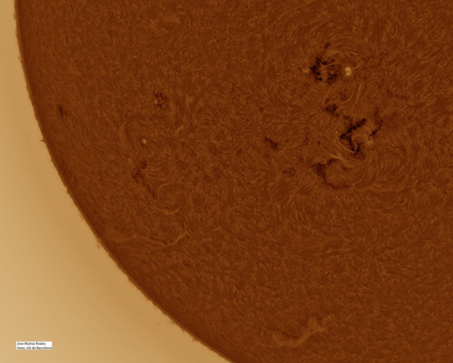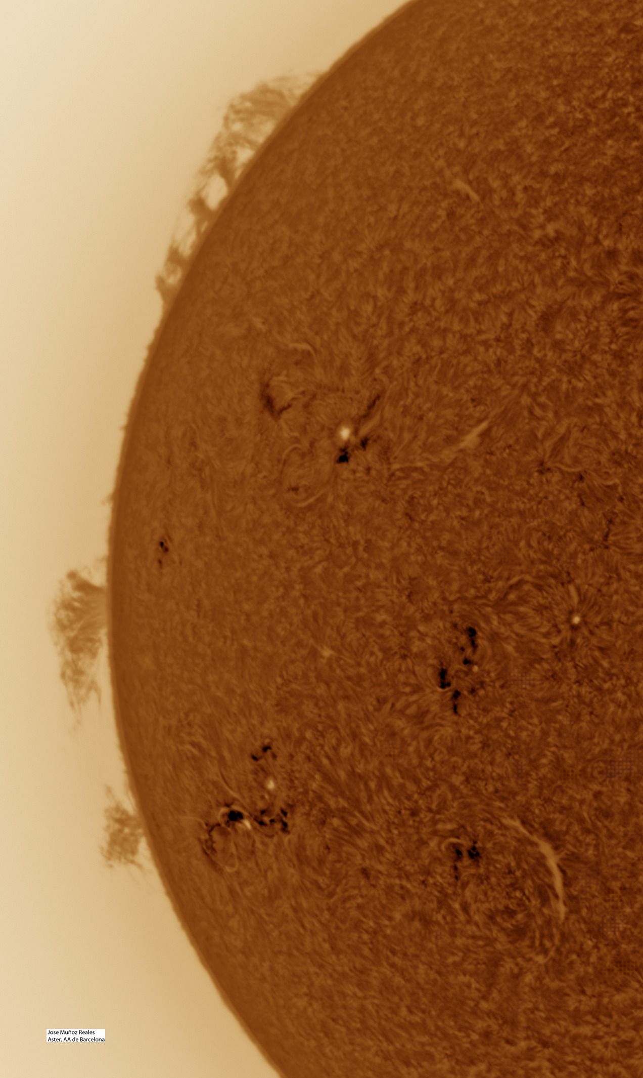 | Autor: Albert Sánchez Instrumento: - Ha: ED120 f-38 + ASI183MM + Quark H alpha - Ca: Baader K-Line - Visible: Filtro Calcio y Baader Astrosolar |