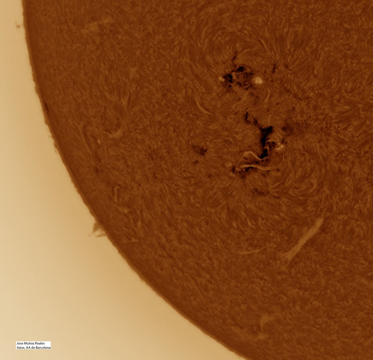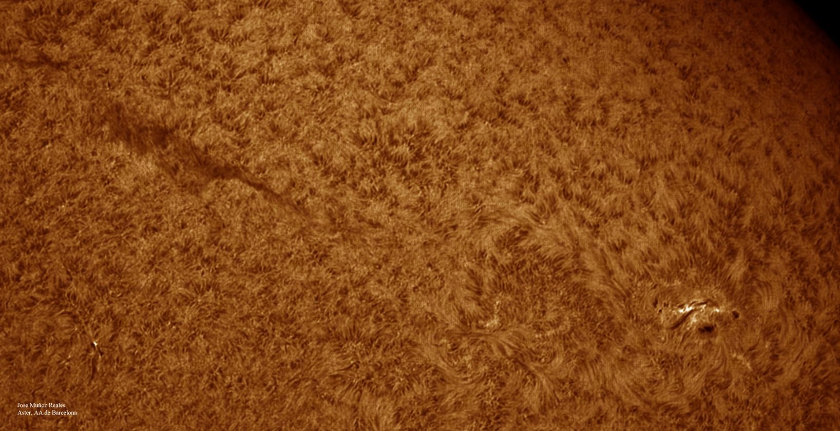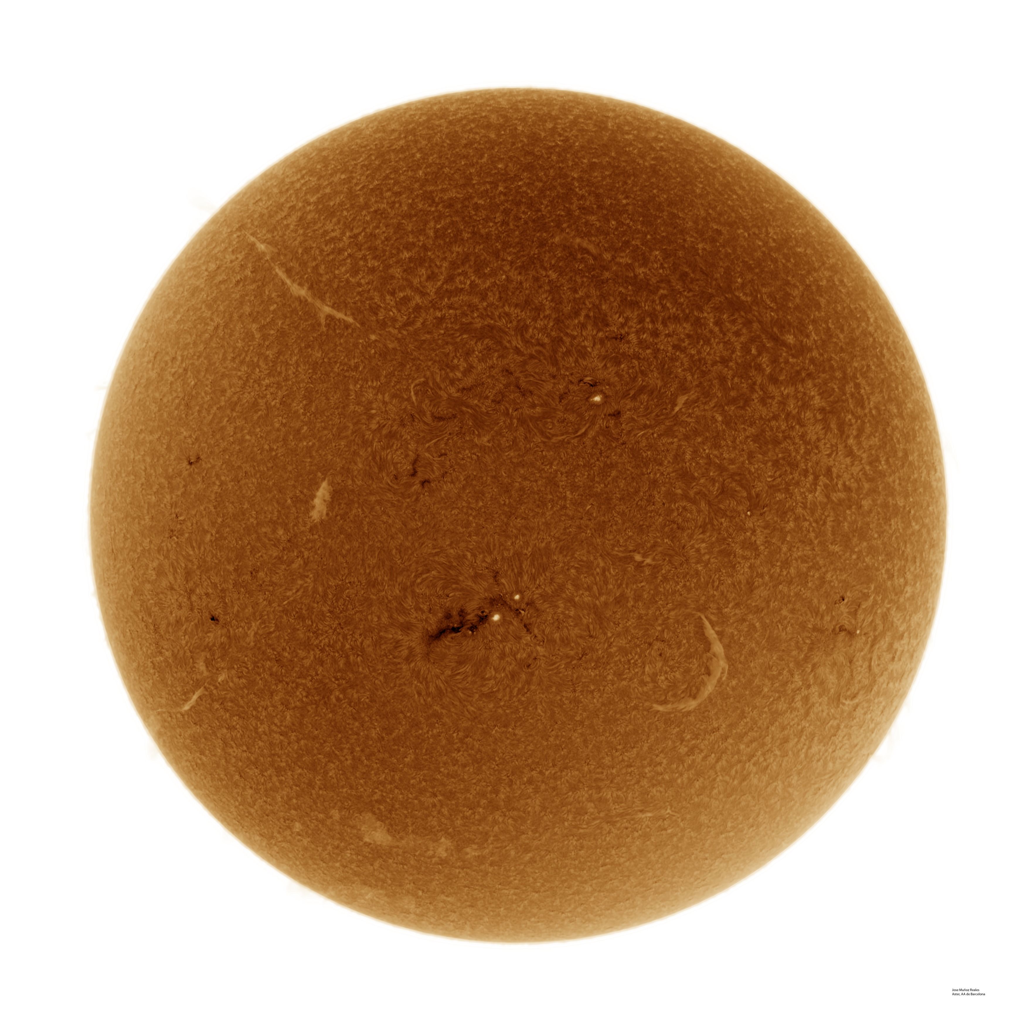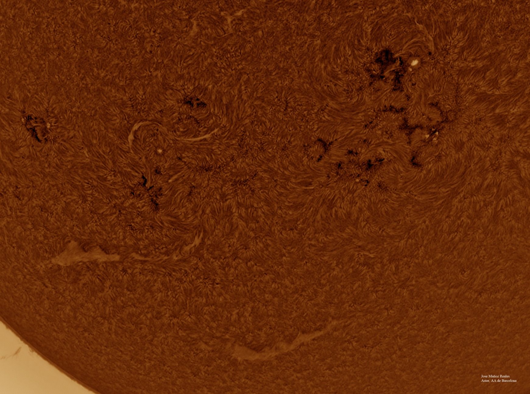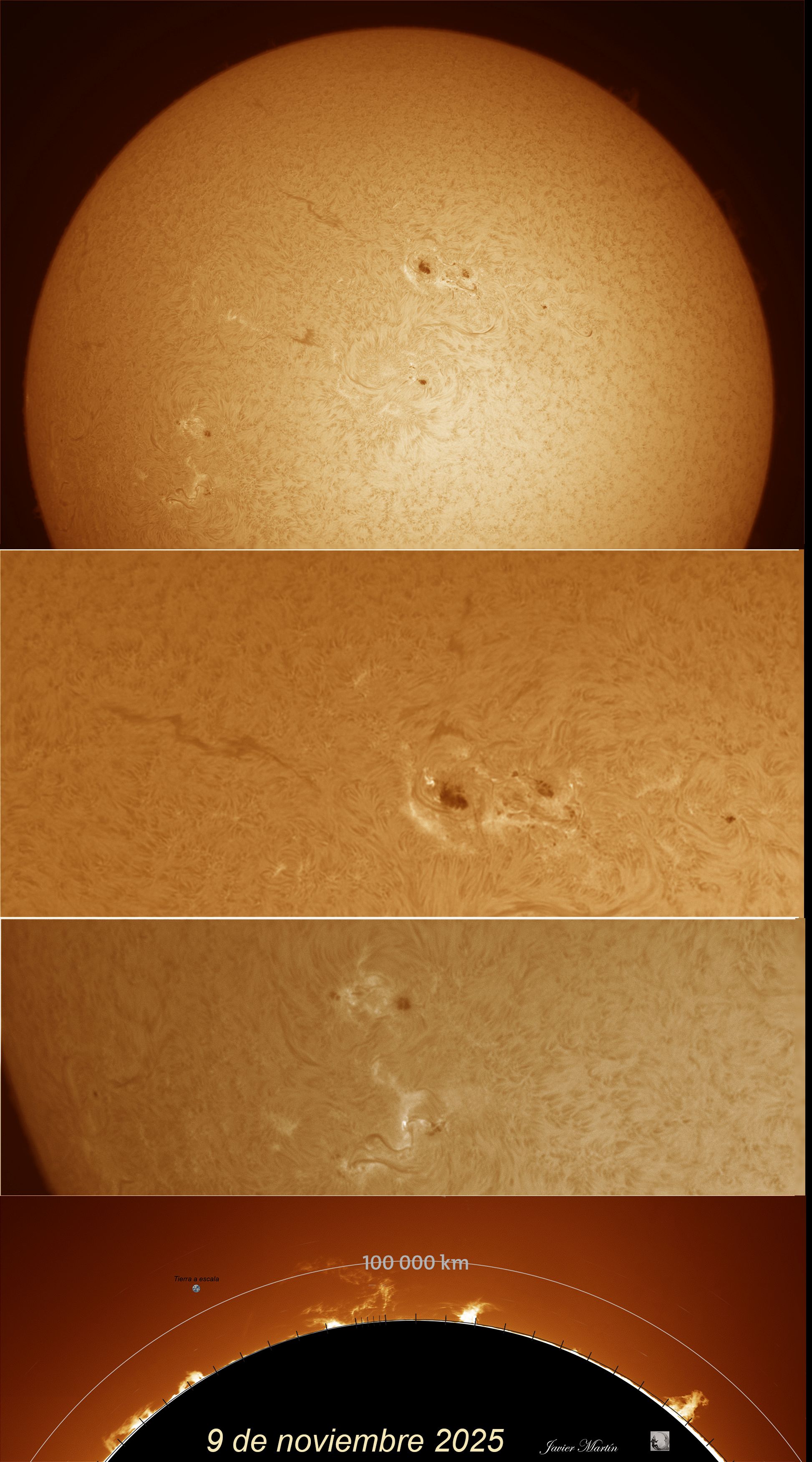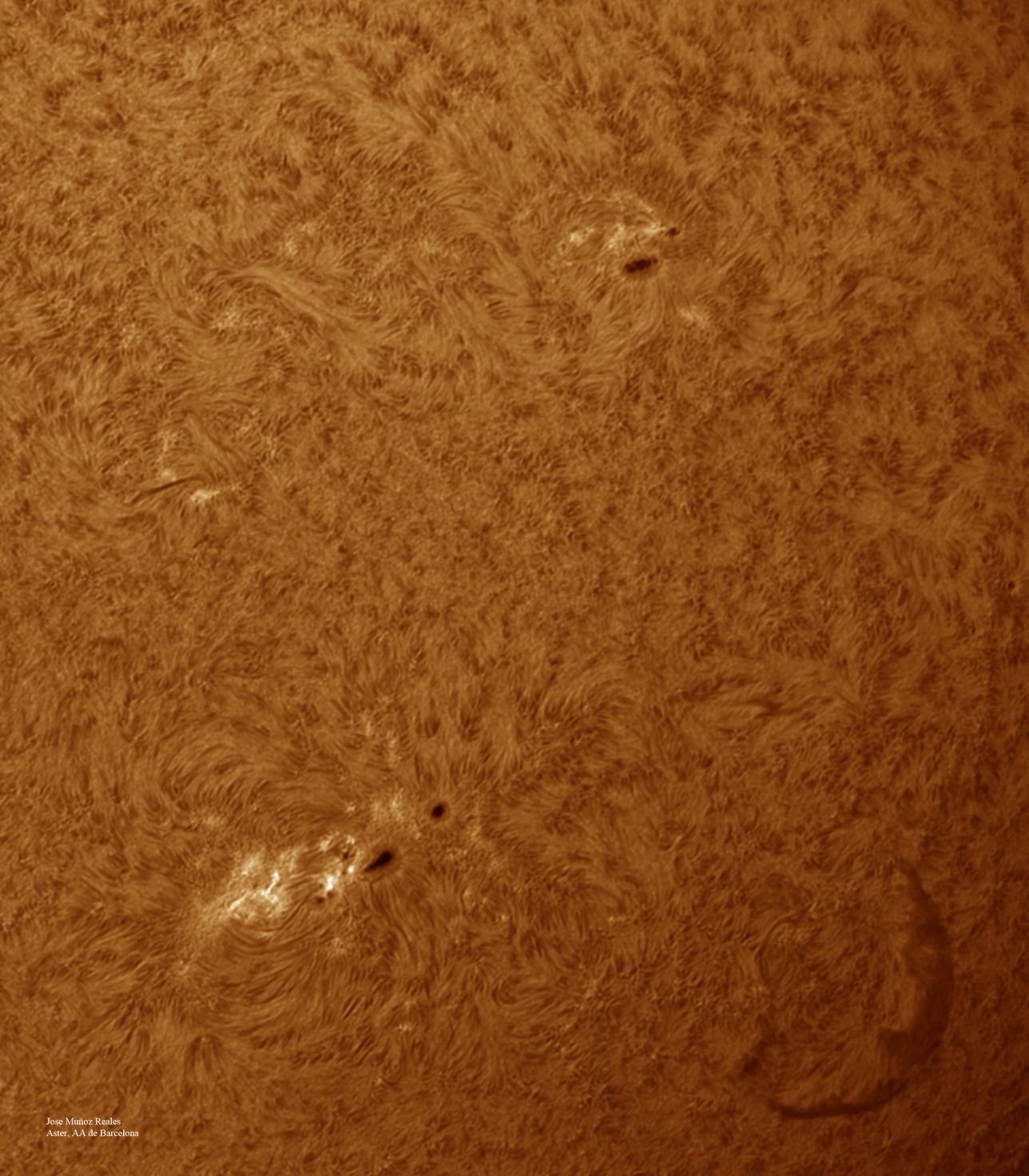 | Autor: Albert Sánchez Instrumento: - Ha: ED120 f-38 + ASI183MM + Quark H alpha - Ca: Baader K-Line - Visible: Filtro Calcio y Baader Astrosolar |