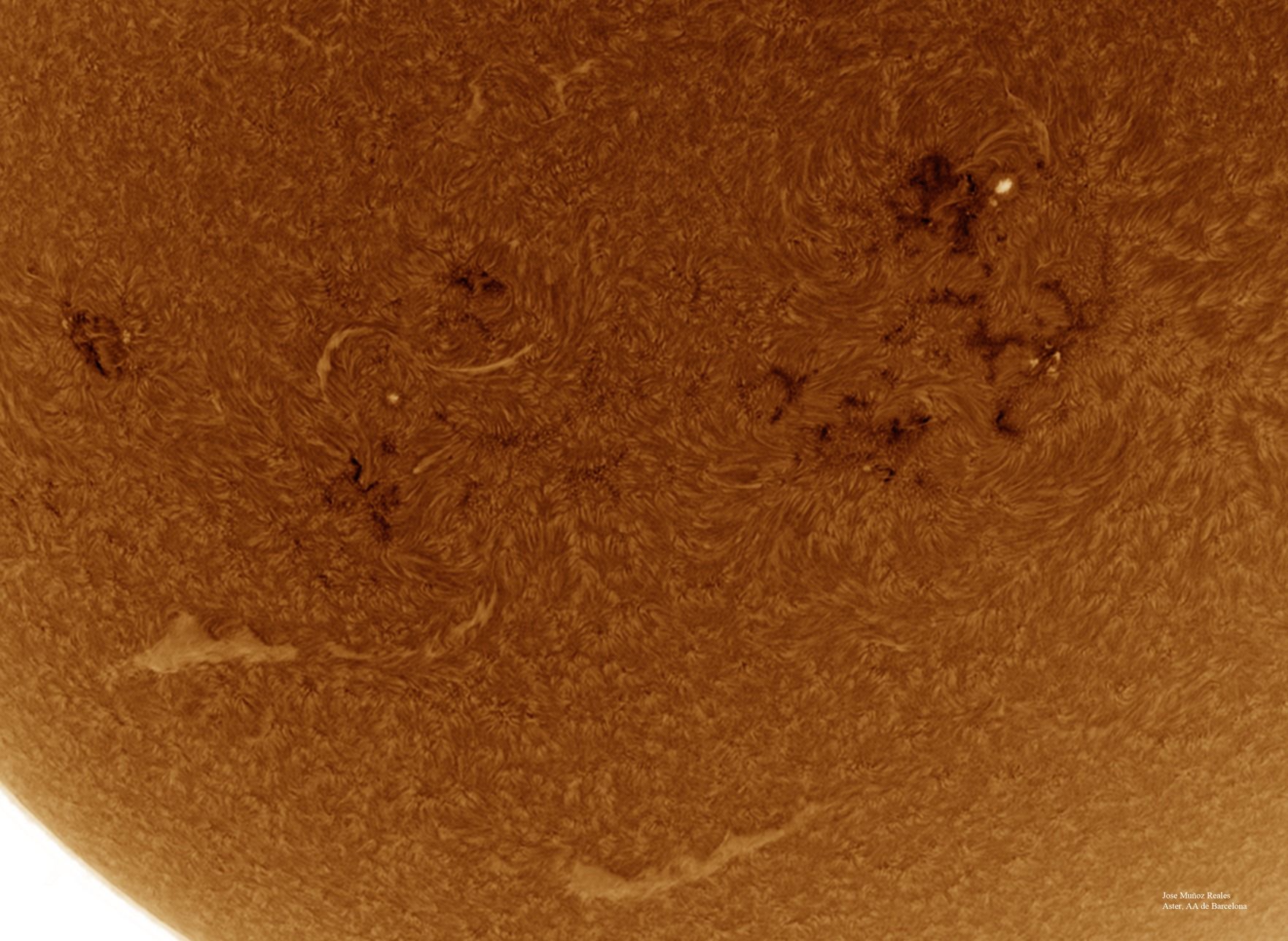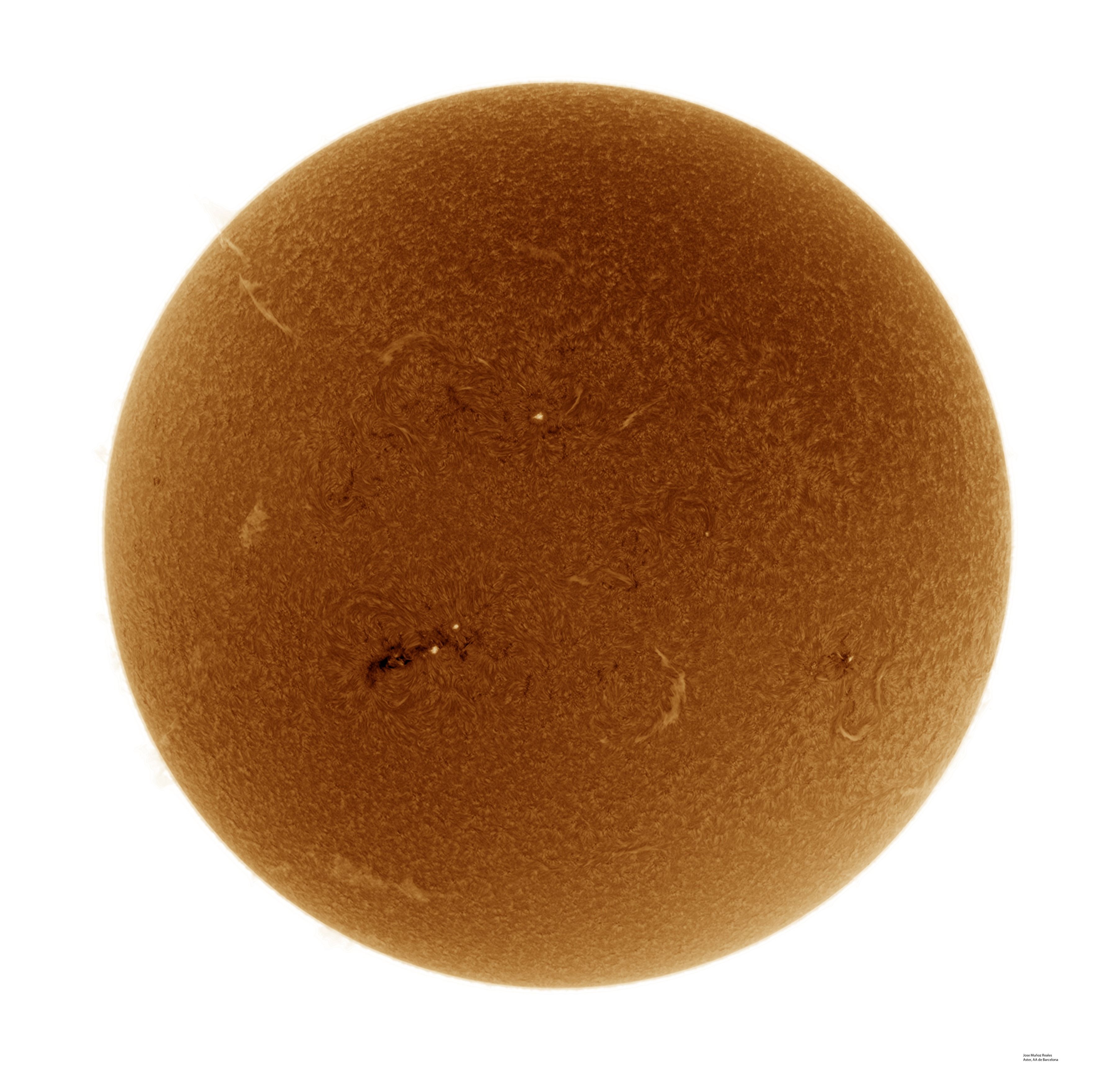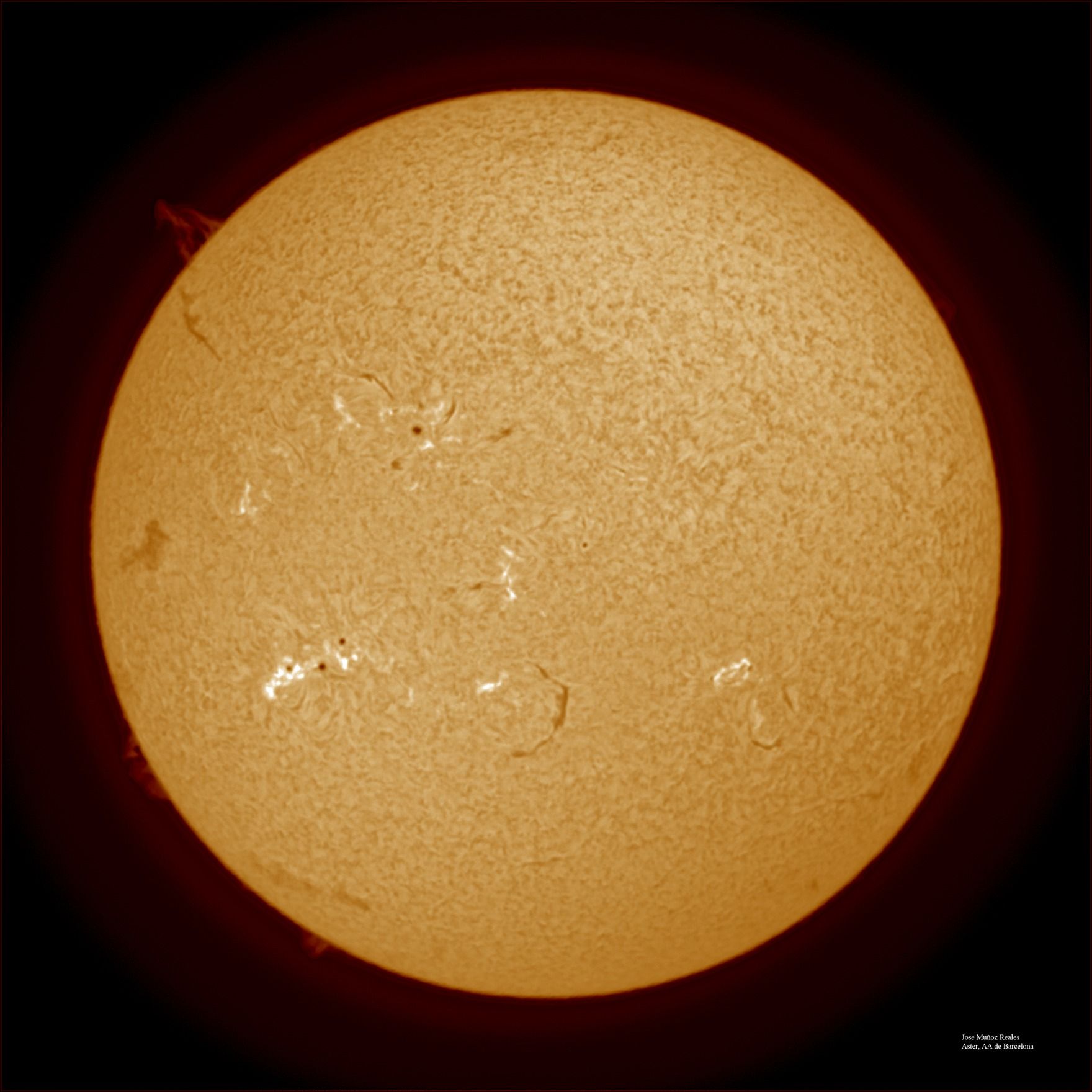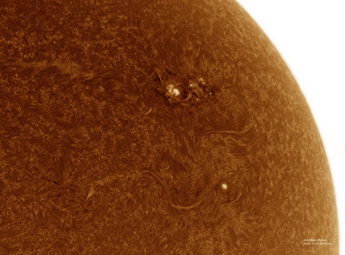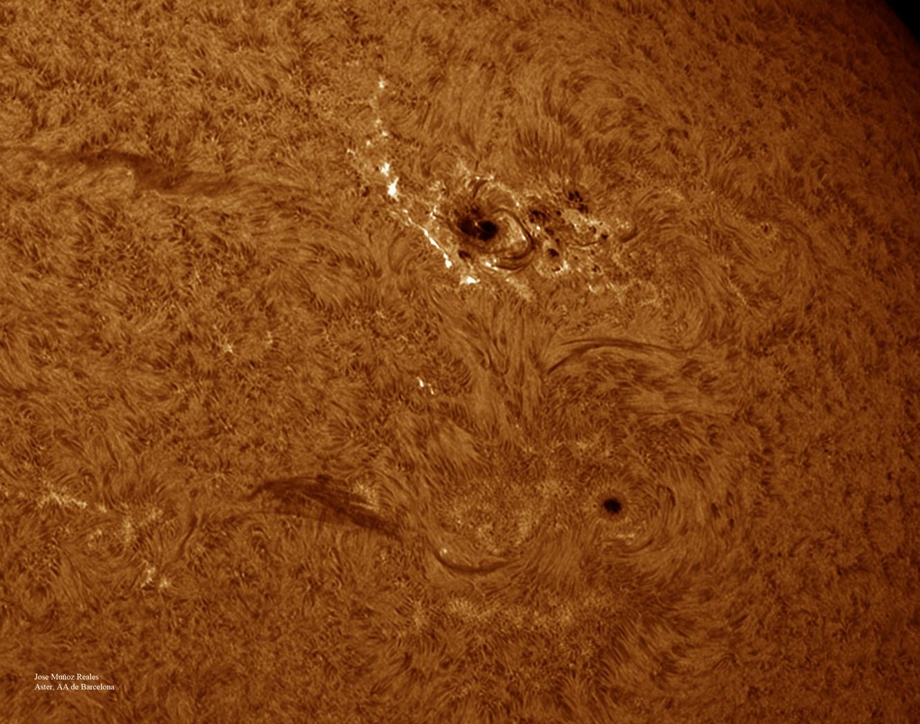 | Autor: Albert Sánchez Instrumento: - Ha: ED120 f-38 + ASI183MM + Quark H alpha - Ca: Baader K-Line - Visible: Filtro Calcio y Baader Astrosolar |