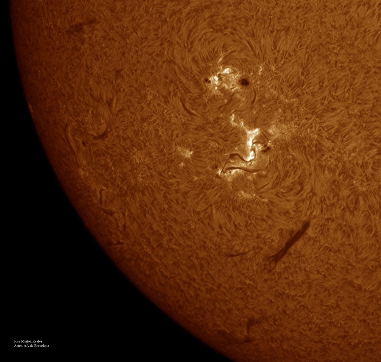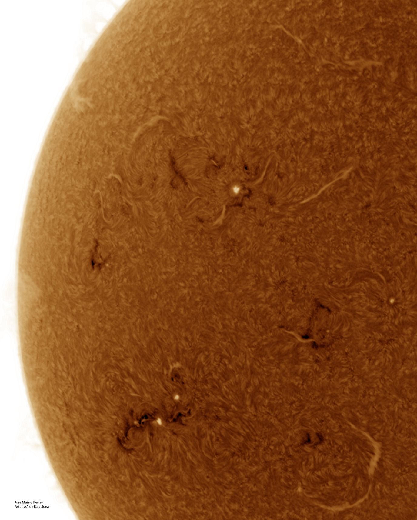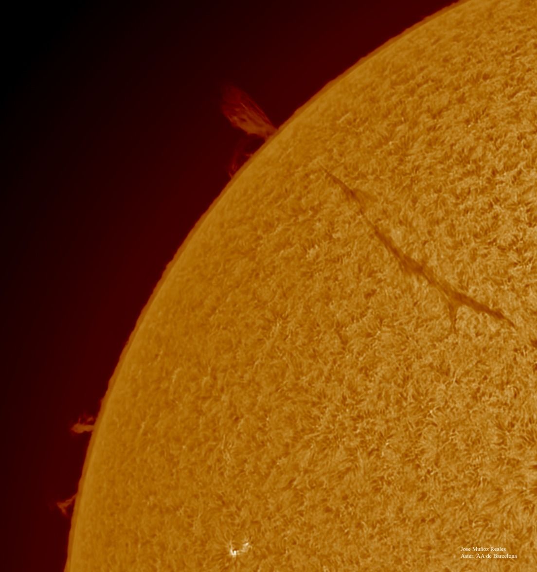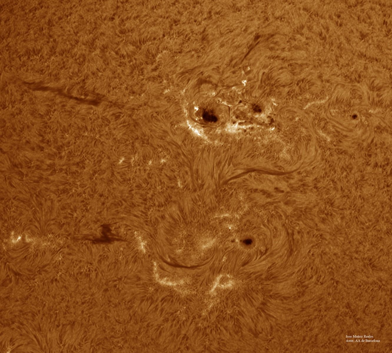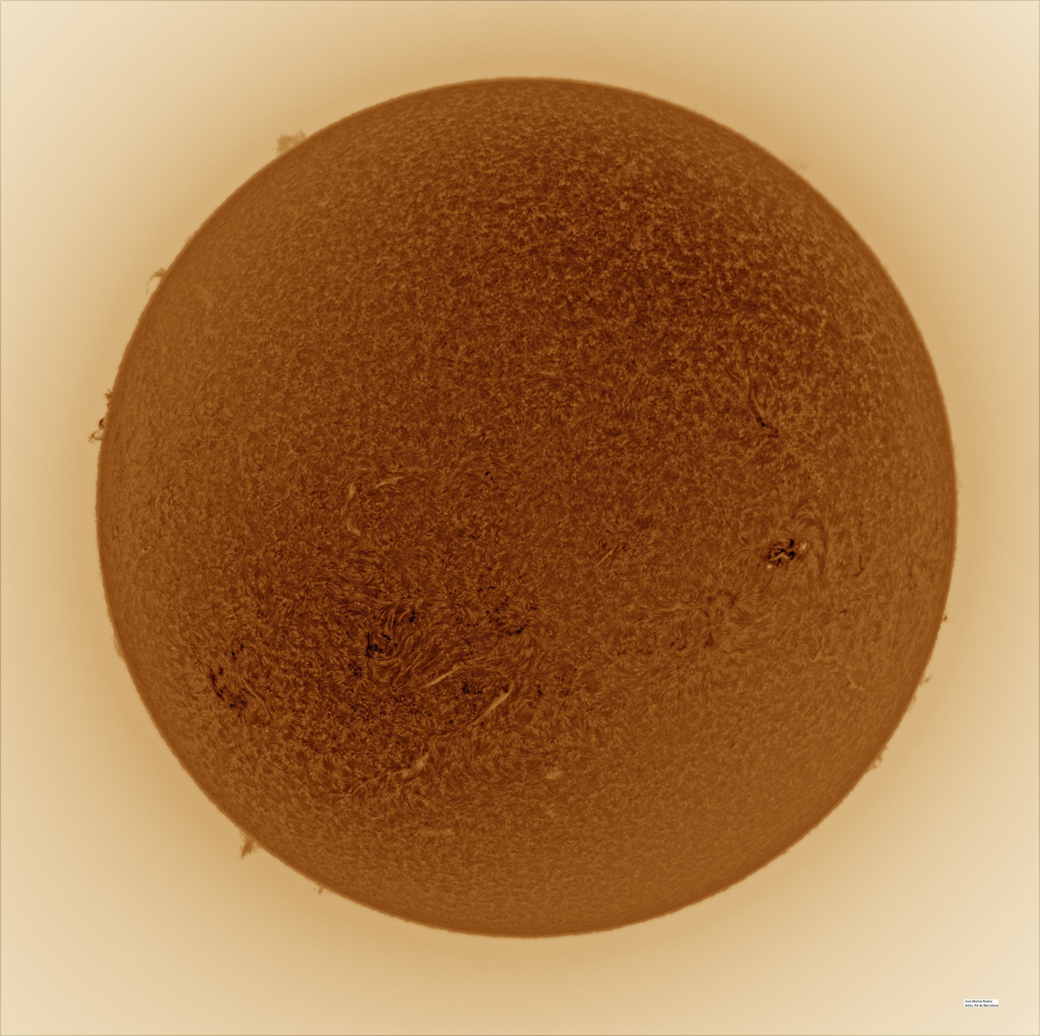 | Autor: Albert Sánchez Instrumento: - Ha: ED120 f-38 + ASI183MM + Quark H alpha - Ca: Baader K-Line - Visible: Filtro Calcio y Baader Astrosolar |