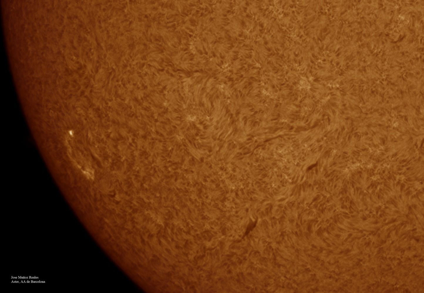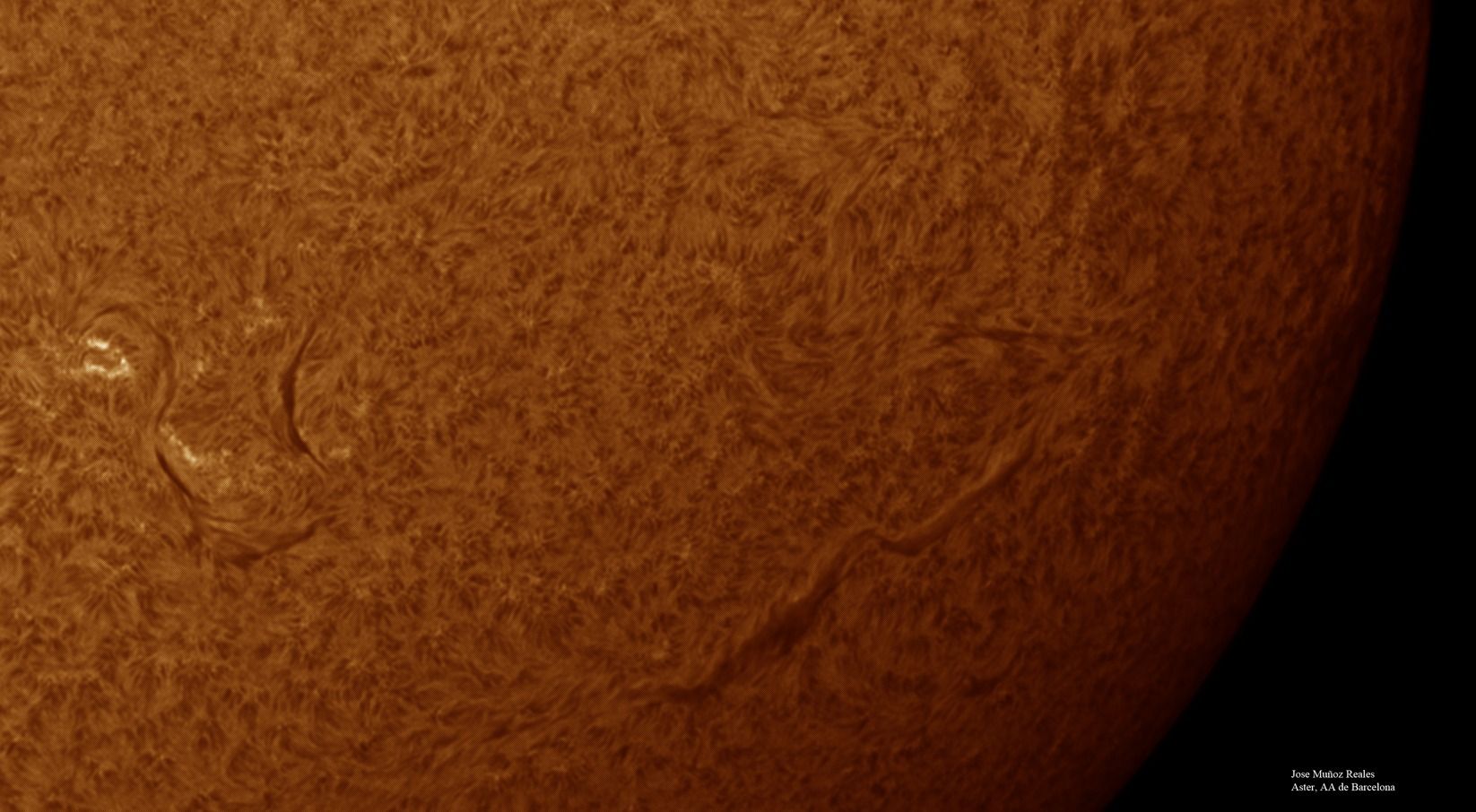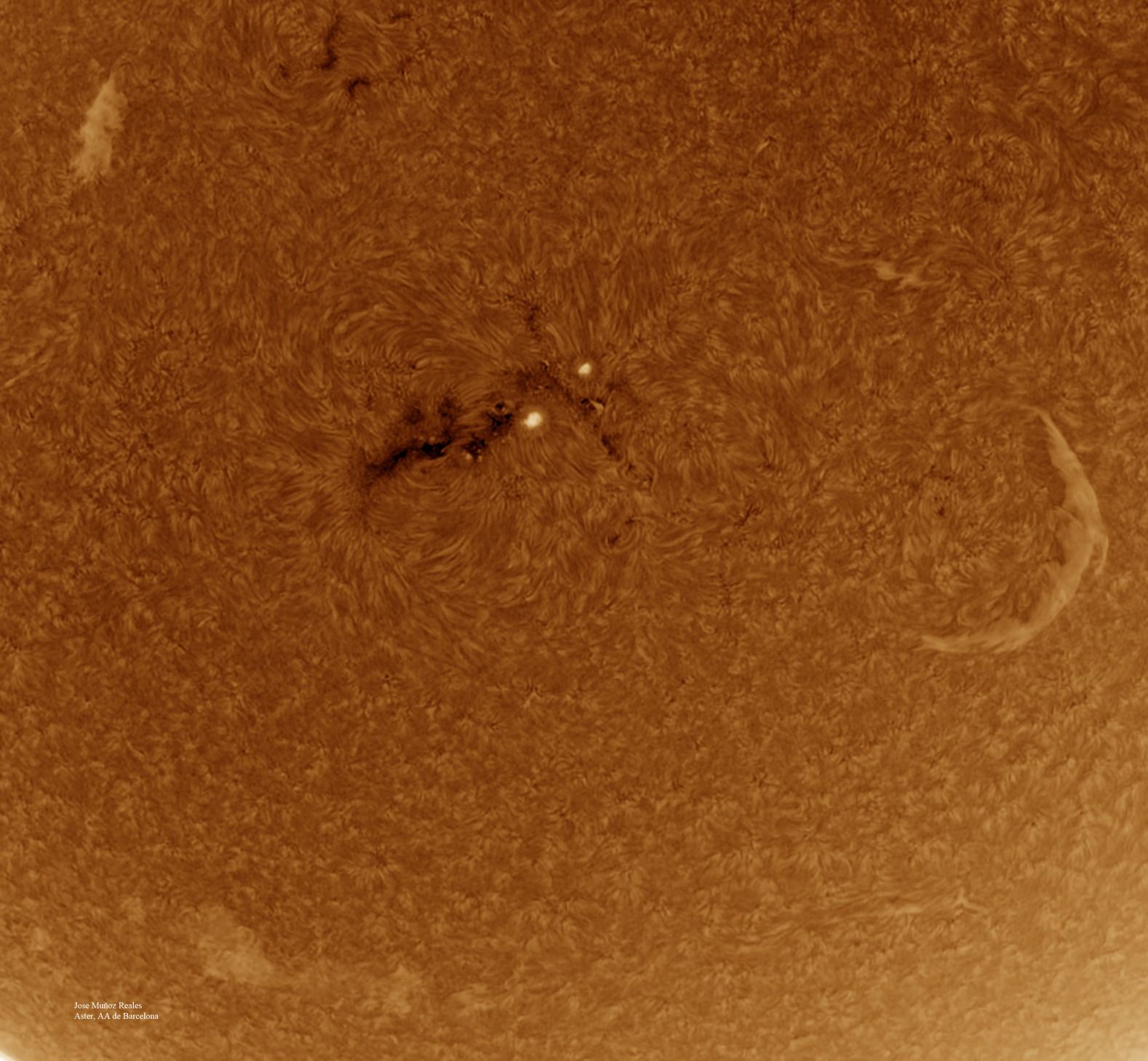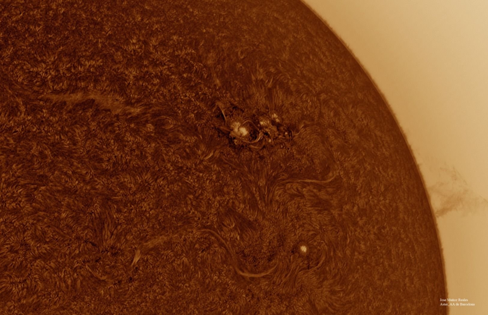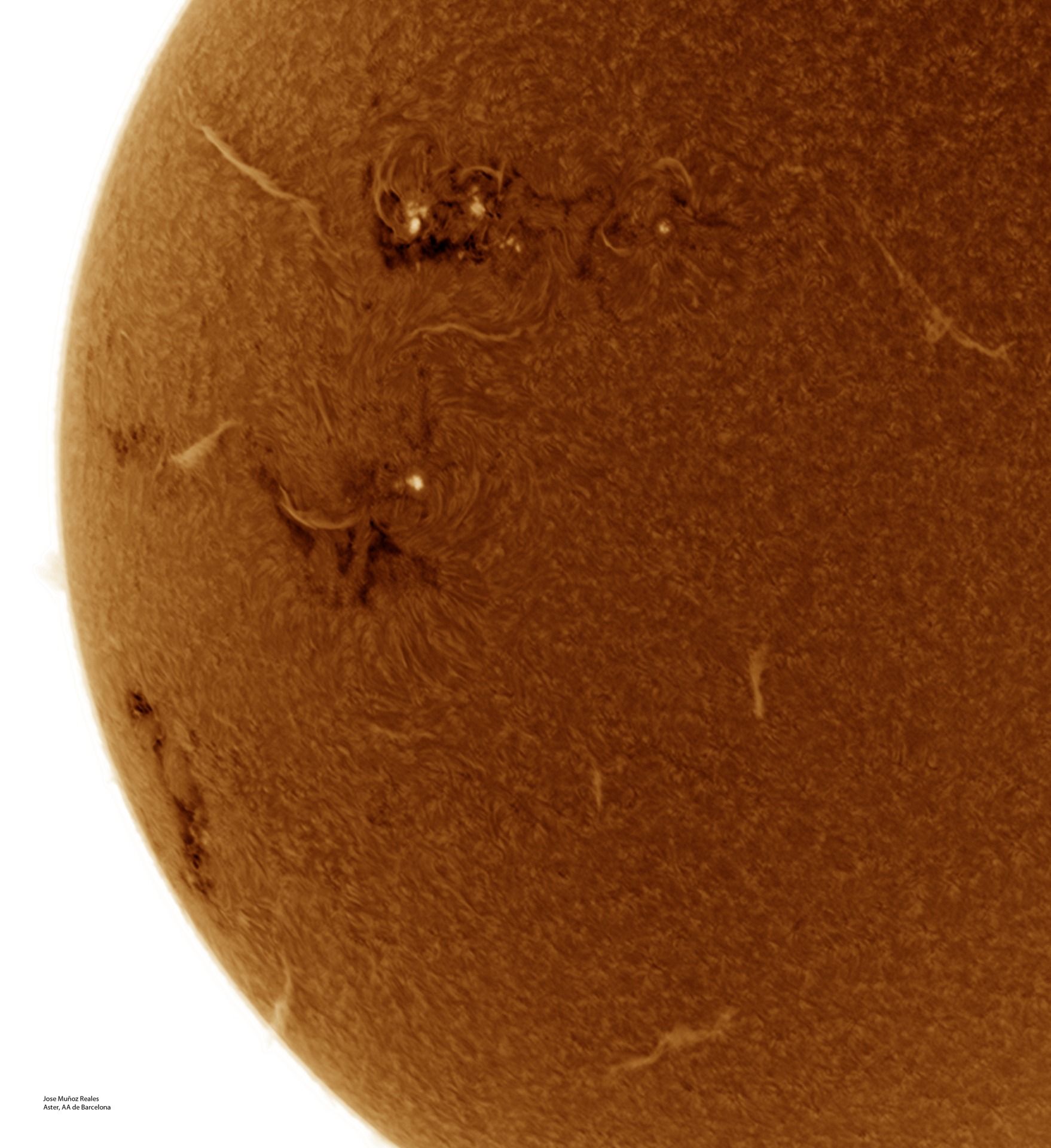 | Autor: Albert Sánchez Instrumento: - Ha: ED120 f-38 + ASI183MM + Quark H alpha - Ca: Baader K-Line - Visible: Filtro Calcio y Baader Astrosolar |
