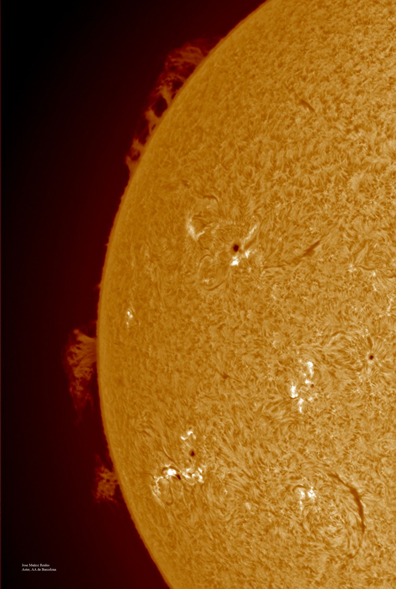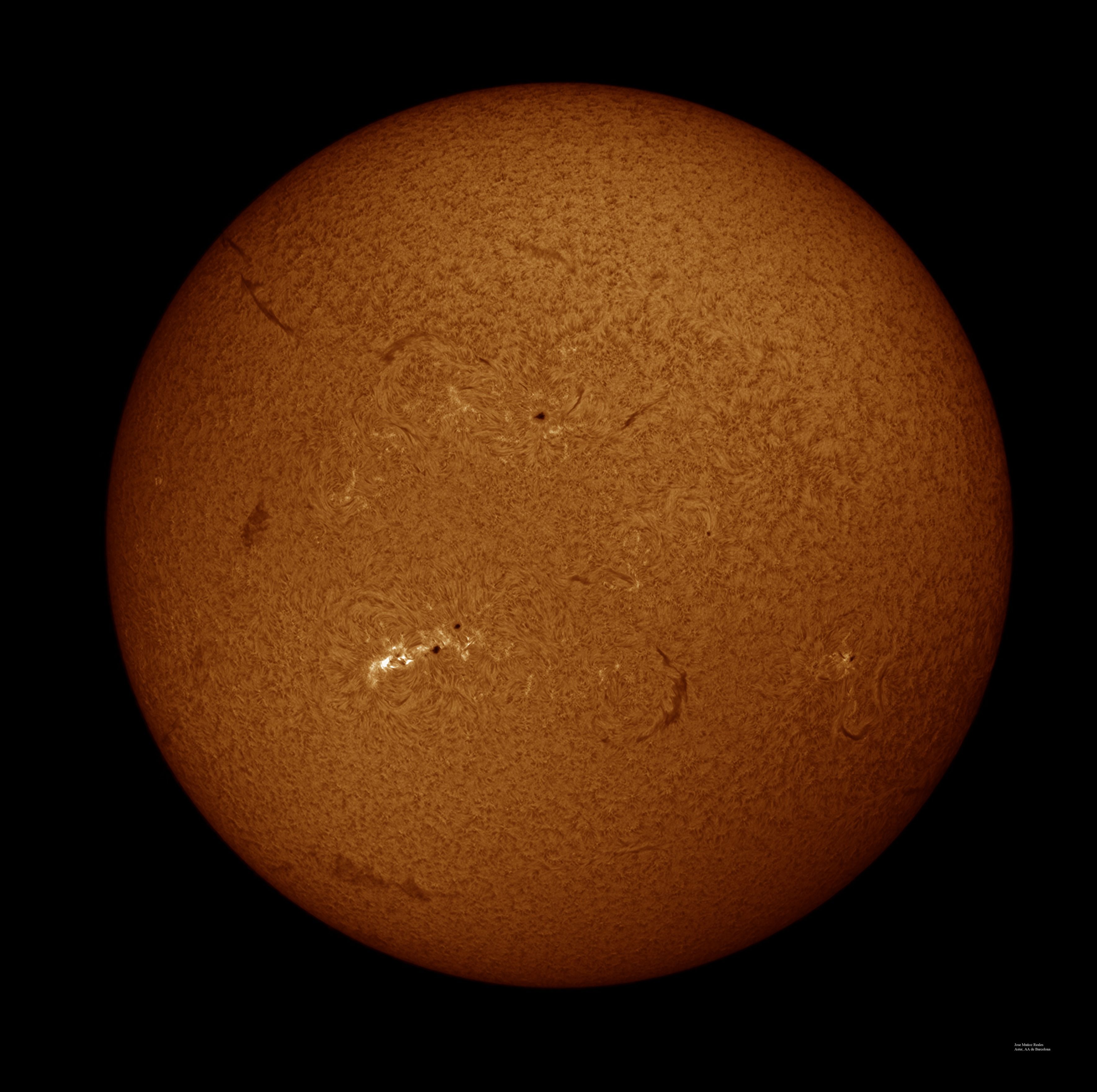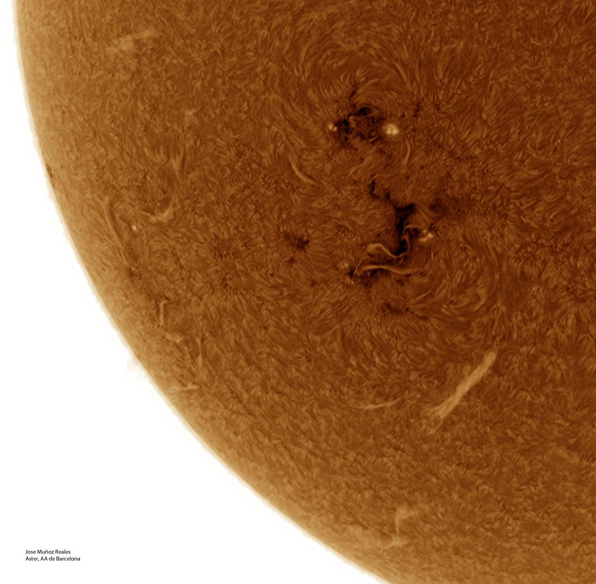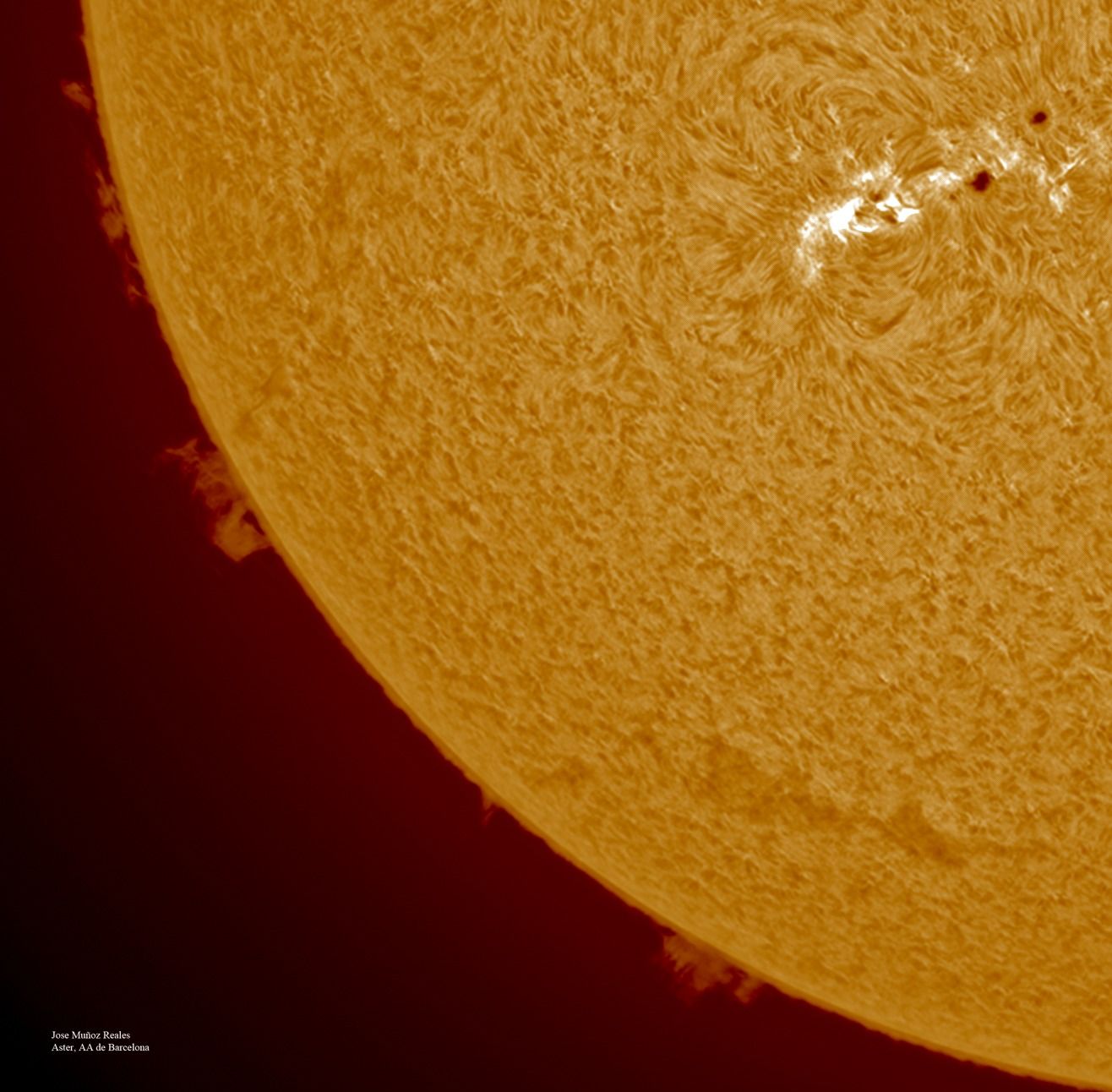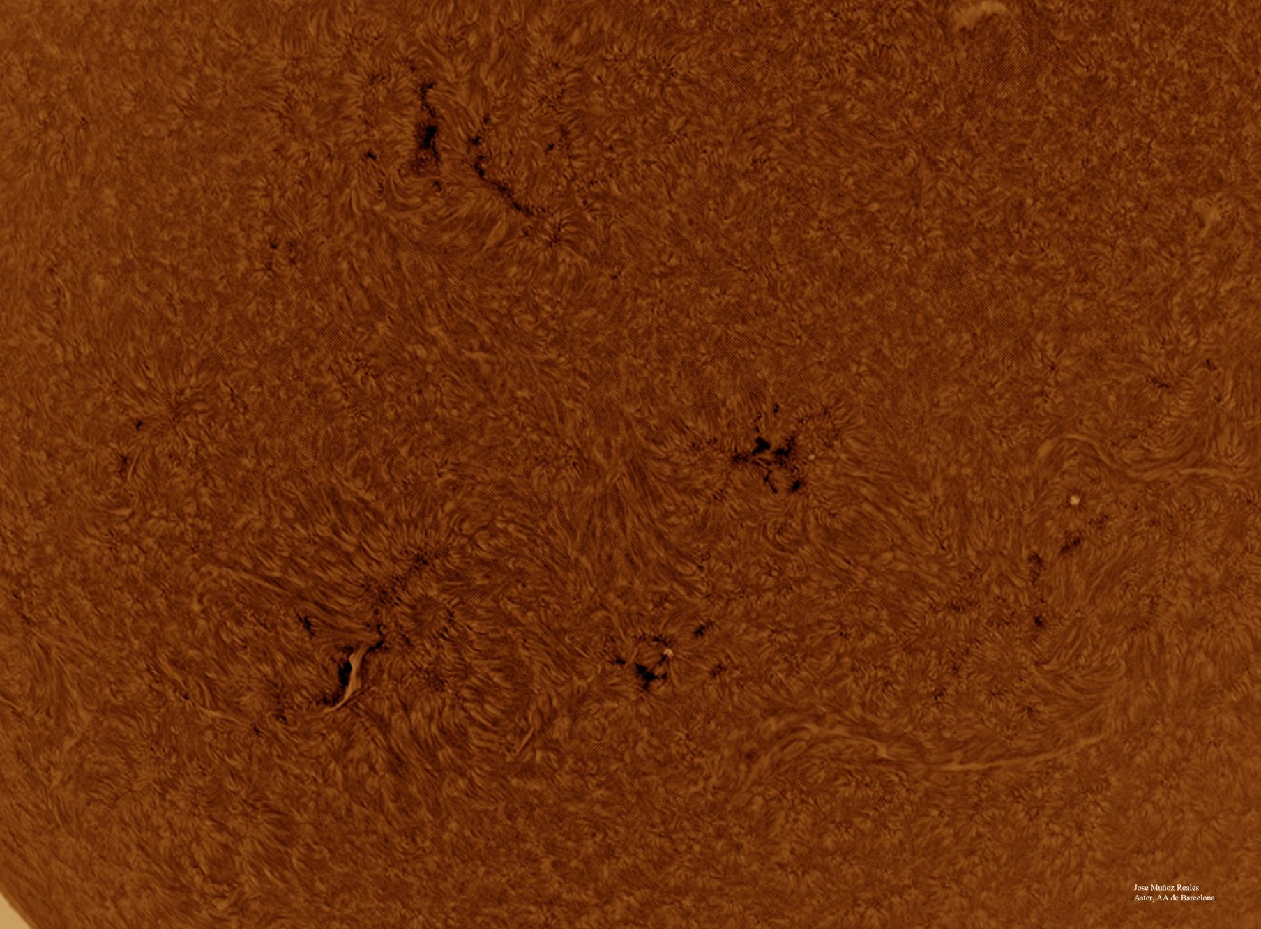 | Autor: Albert Sánchez Instrumento: - Ha: ED120 f-38 + ASI183MM + Quark H alpha - Ca: Baader K-Line - Visible: Filtro Calcio y Baader Astrosolar |