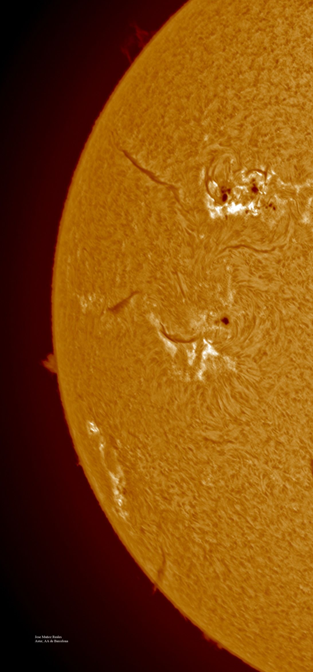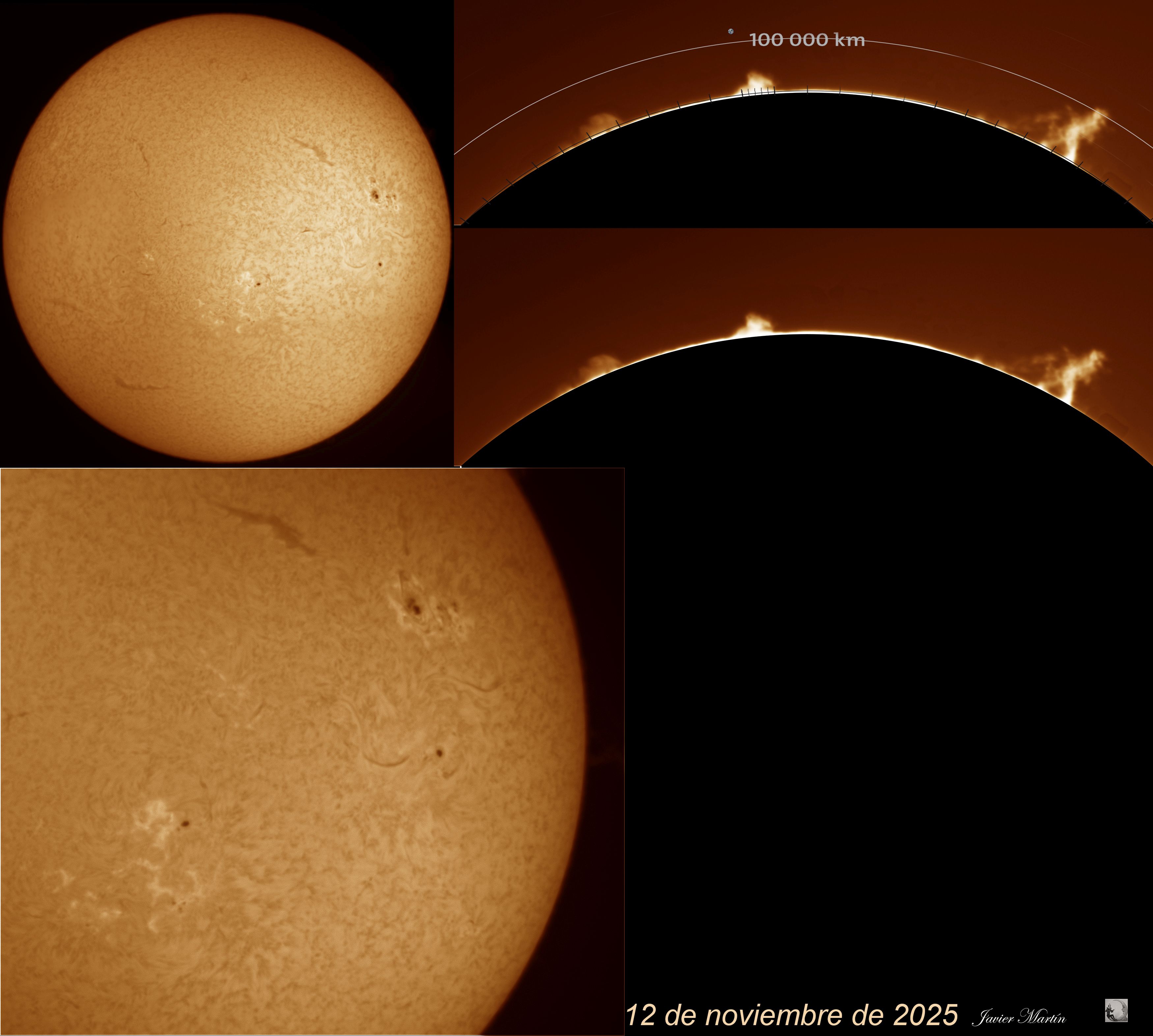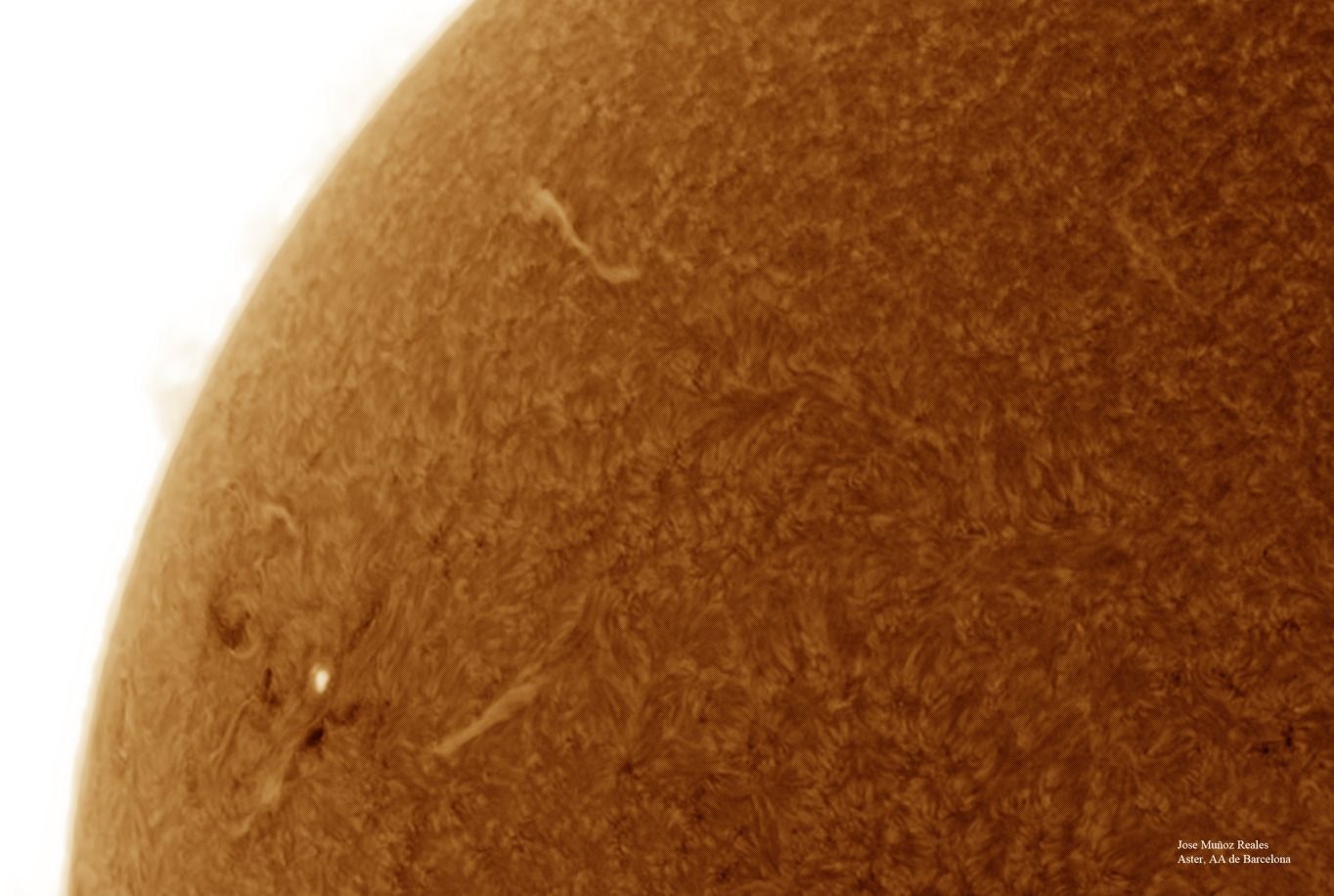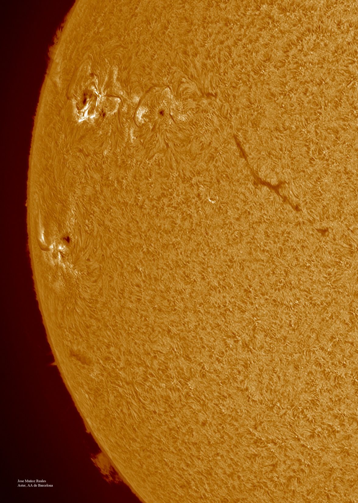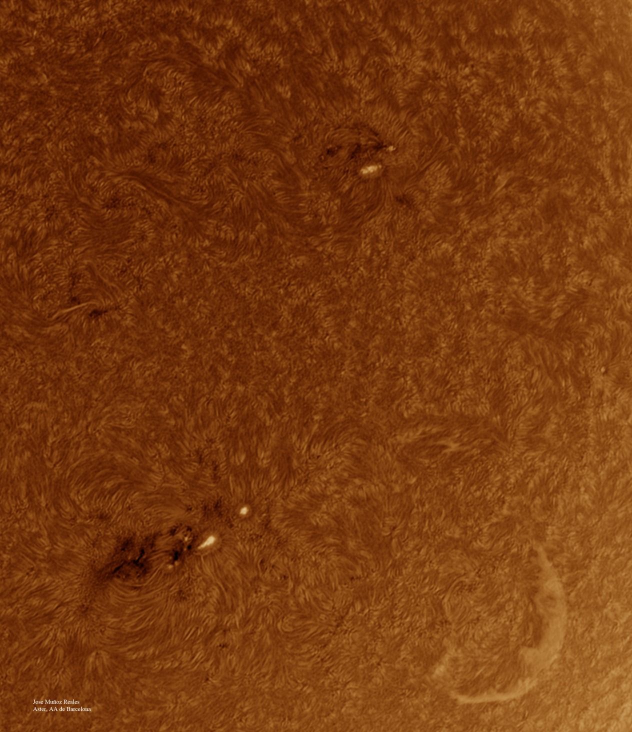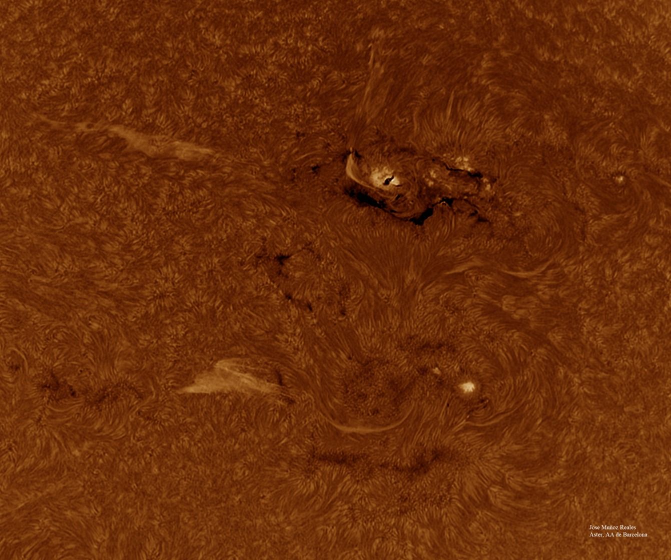 | Autor: Albert Sánchez Instrumento: - Ha: ED120 f-38 + ASI183MM + Quark H alpha - Ca: Baader K-Line - Visible: Filtro Calcio y Baader Astrosolar |
