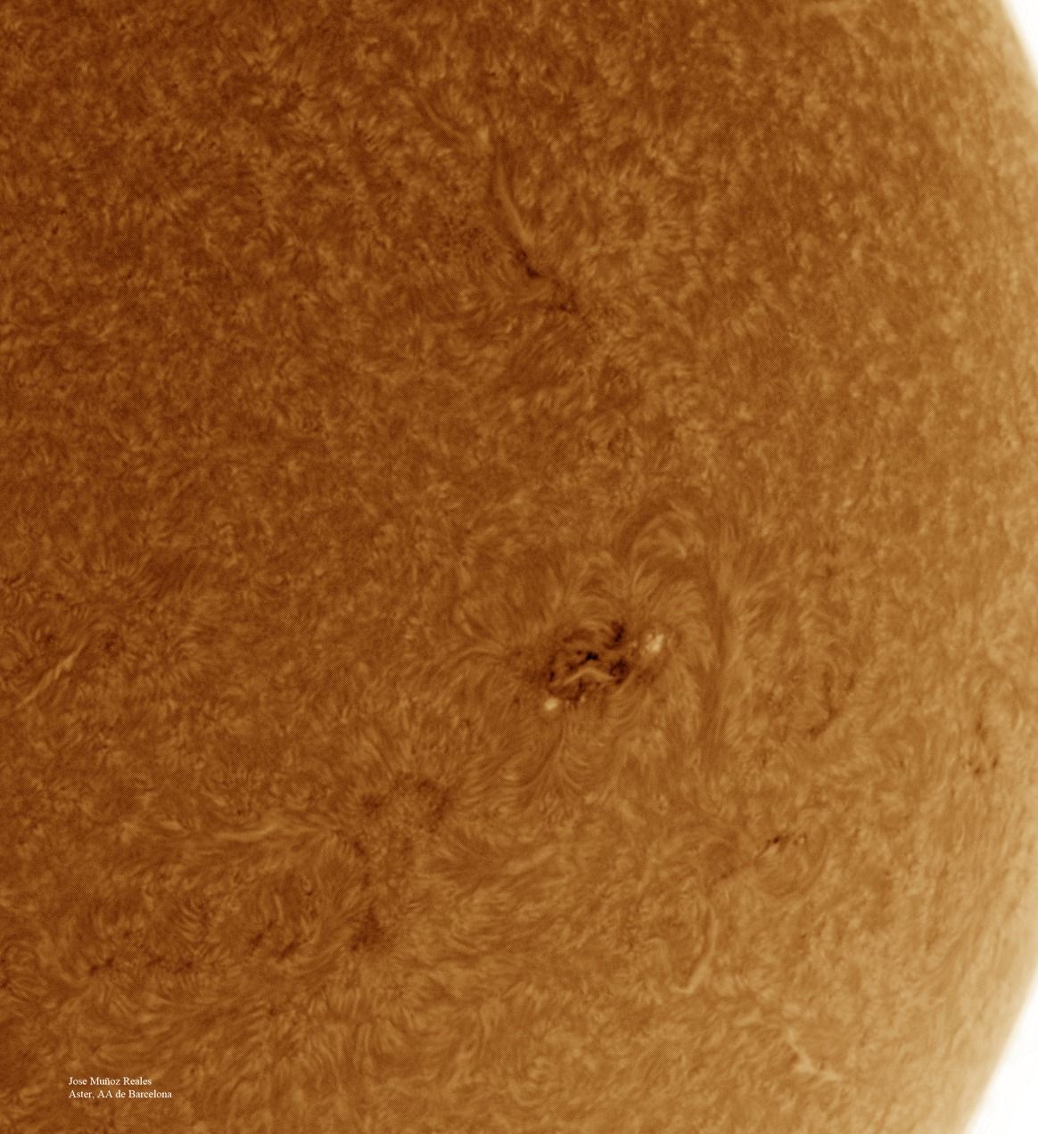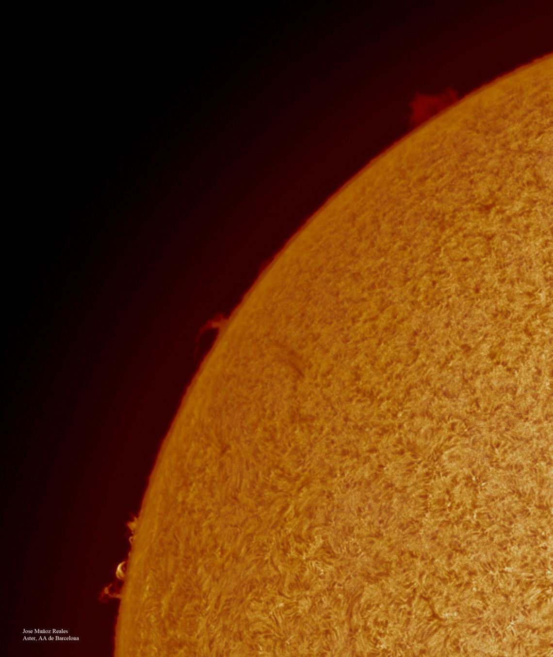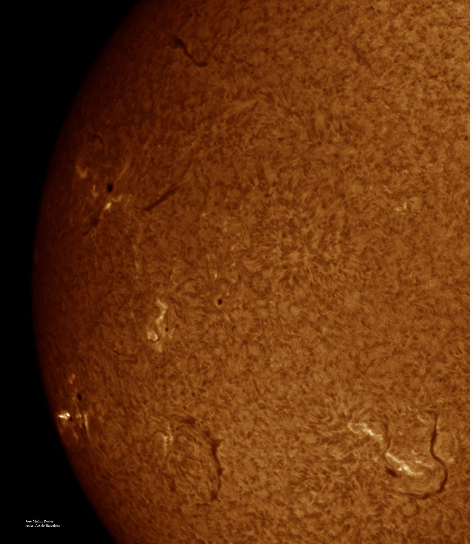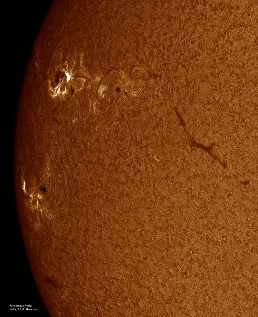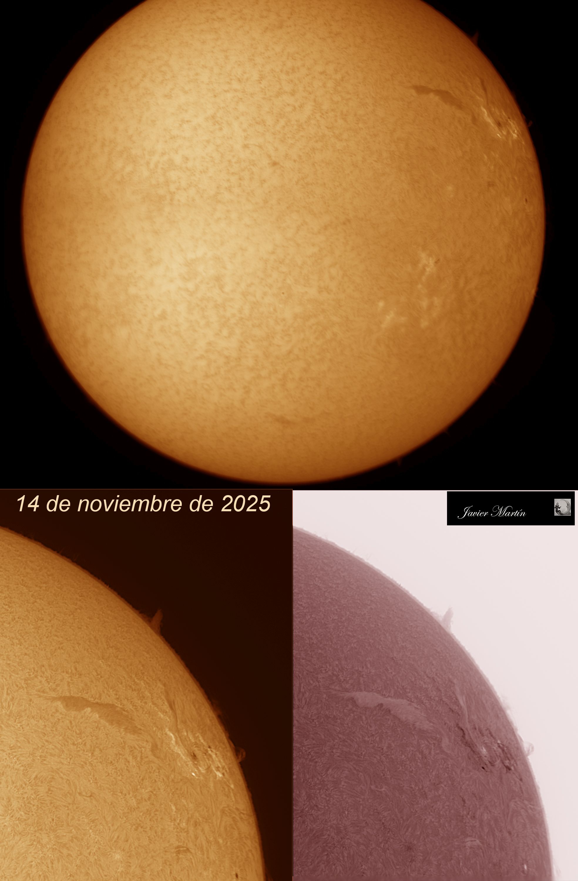 | Autor: Albert Sánchez Instrumento: - Ha: ED120 f-38 + ASI183MM + Quark H alpha - Ca: Baader K-Line - Visible: Filtro Calcio y Baader Astrosolar |