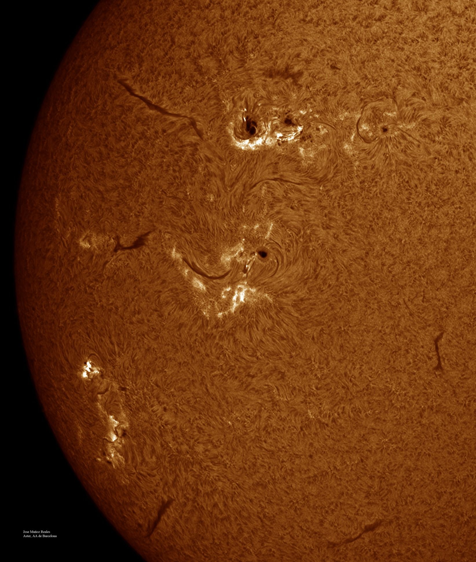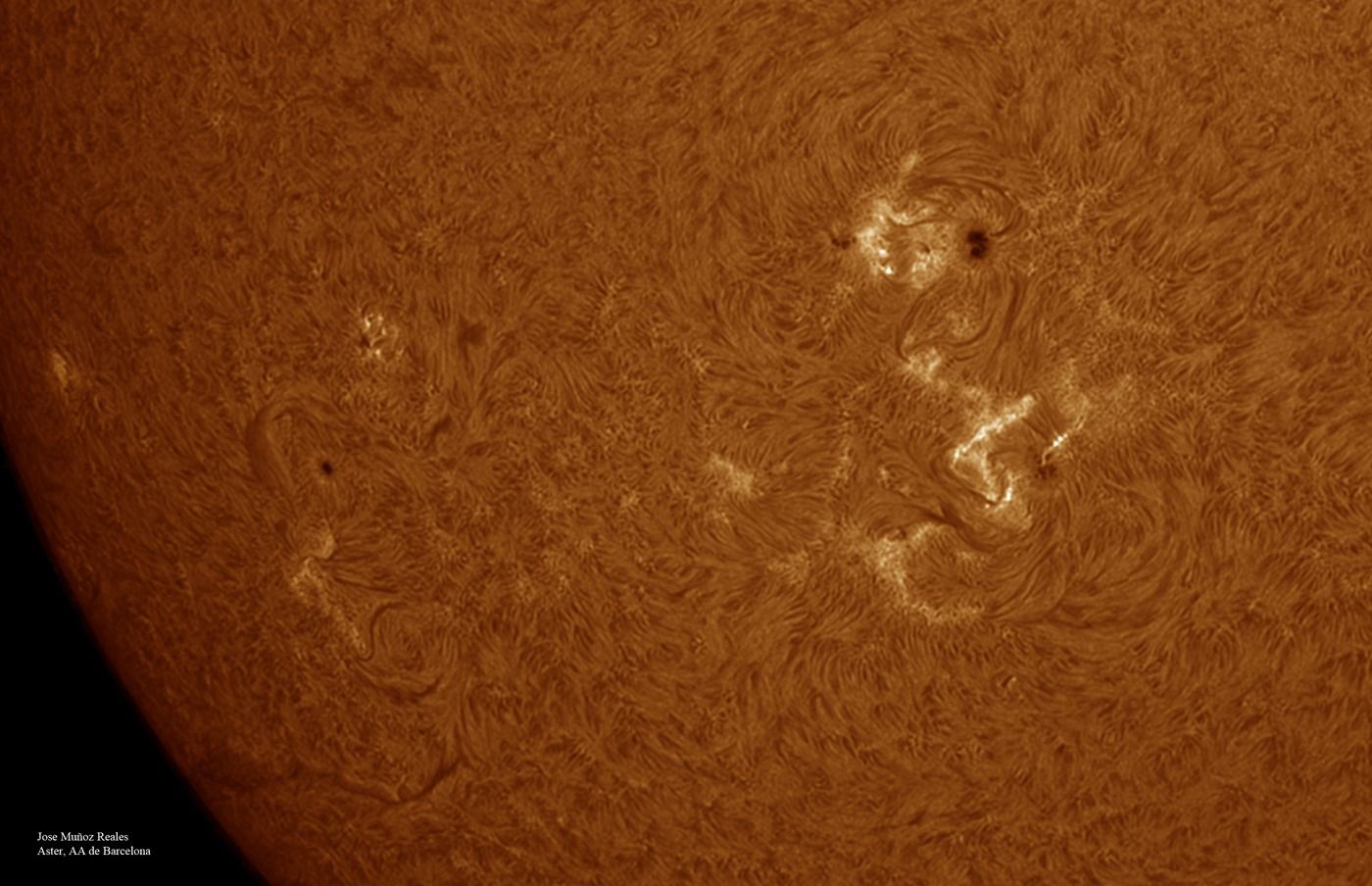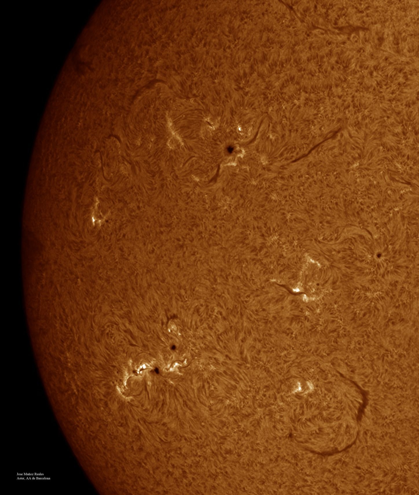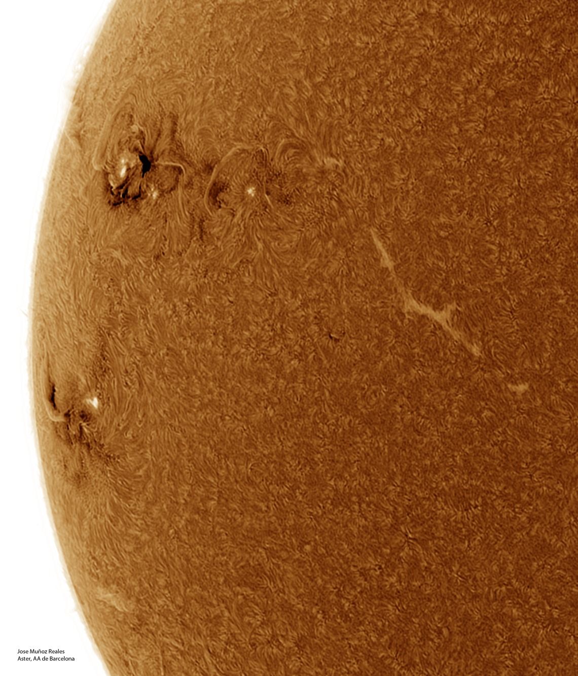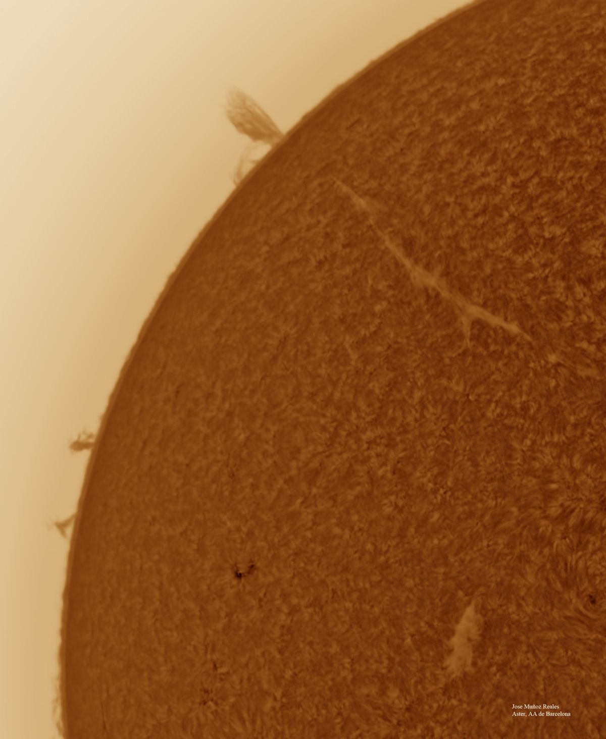 | Autor: Albert Sánchez Instrumento: - Ha: ED120 f-38 + ASI183MM + Quark H alpha - Ca: Baader K-Line - Visible: Filtro Calcio y Baader Astrosolar |