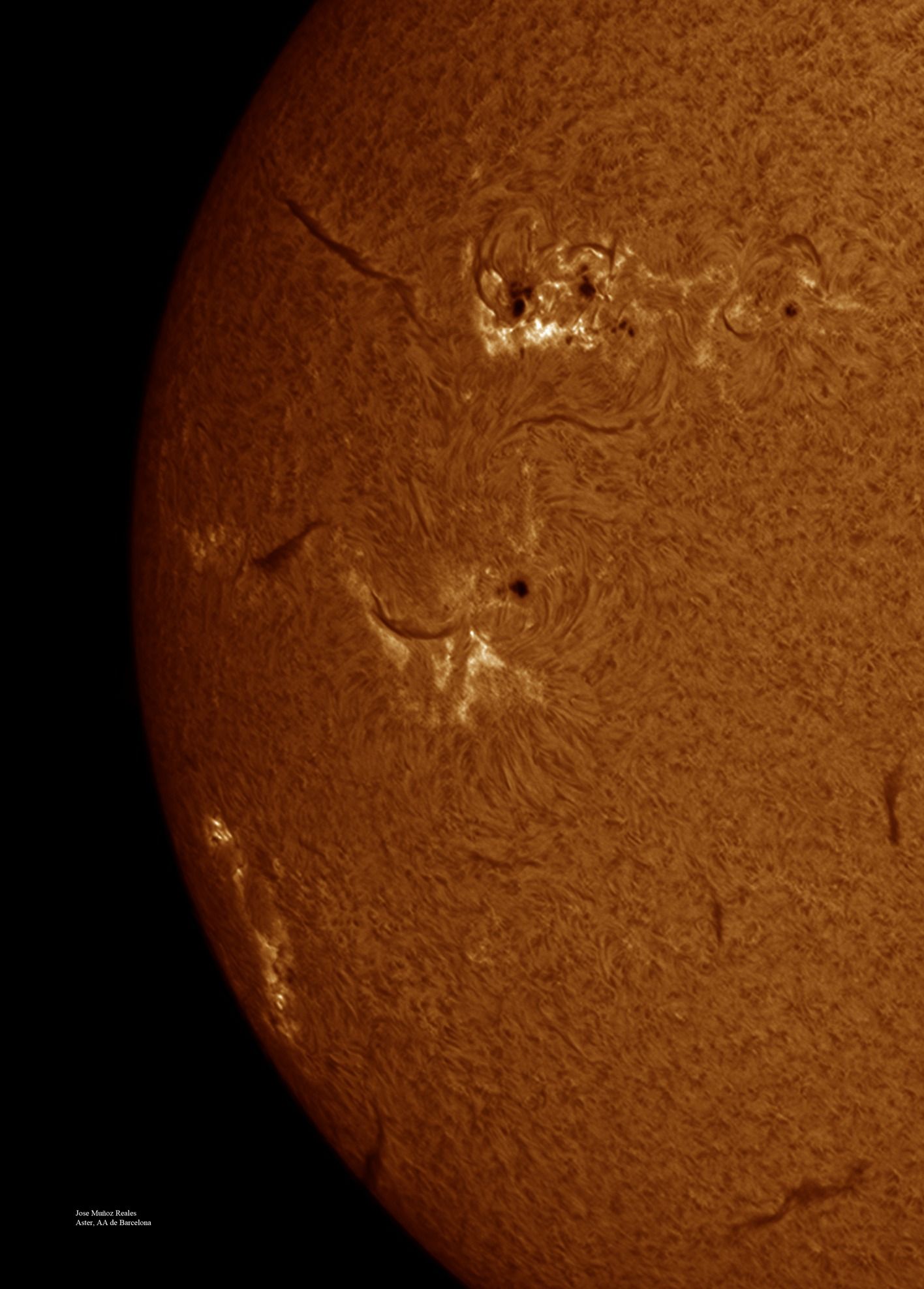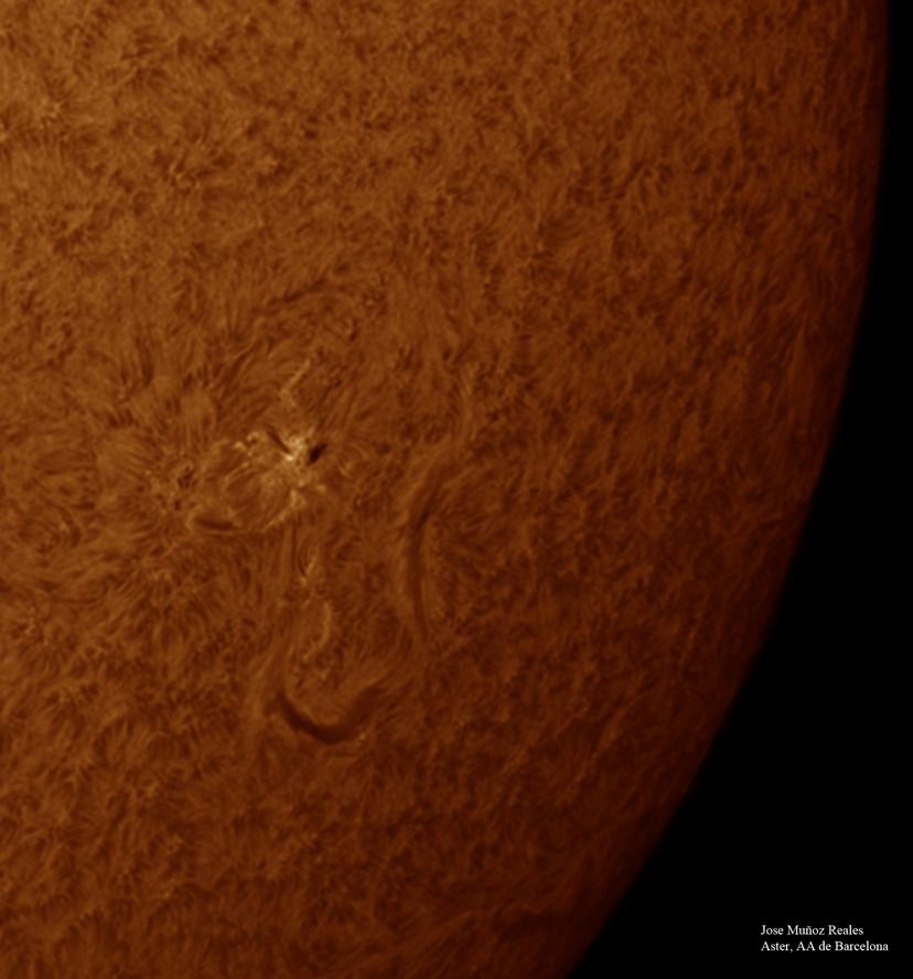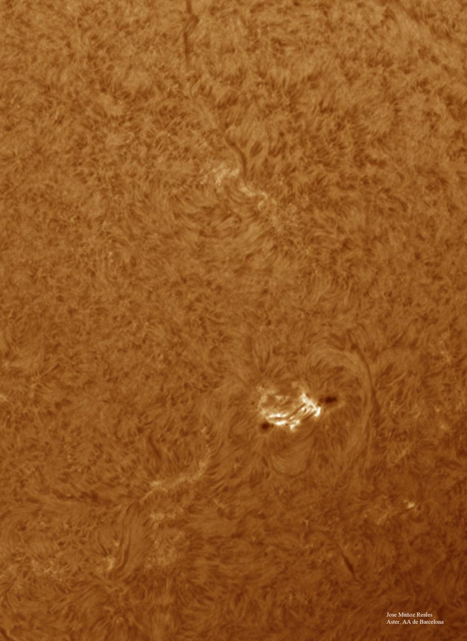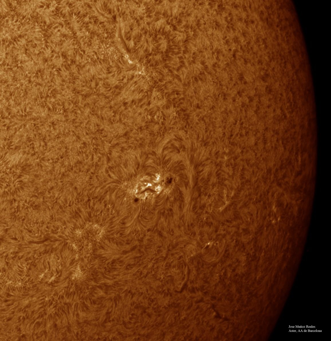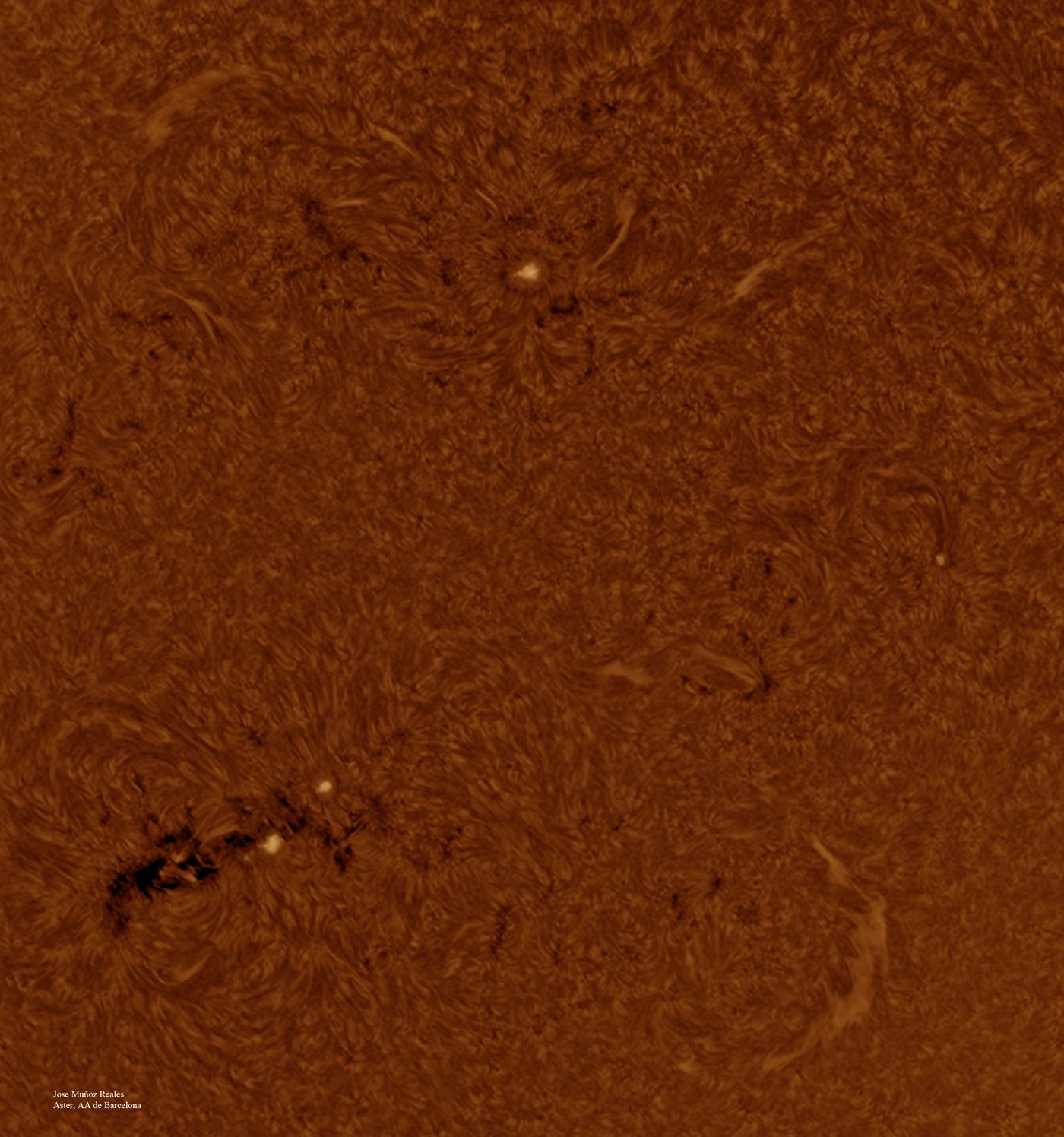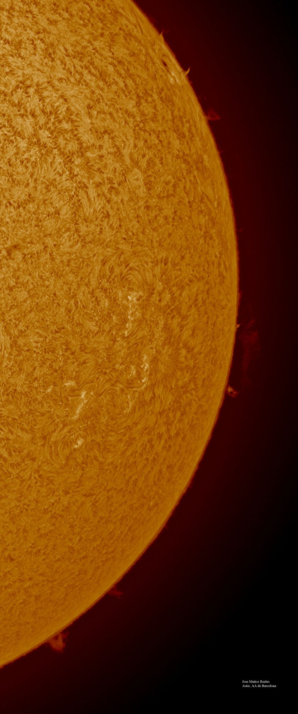 | Autor: Albert Sánchez Instrumento: - Ha: ED120 f-38 + ASI183MM + Quark H alpha - Ca: Baader K-Line - Visible: Filtro Calcio y Baader Astrosolar |