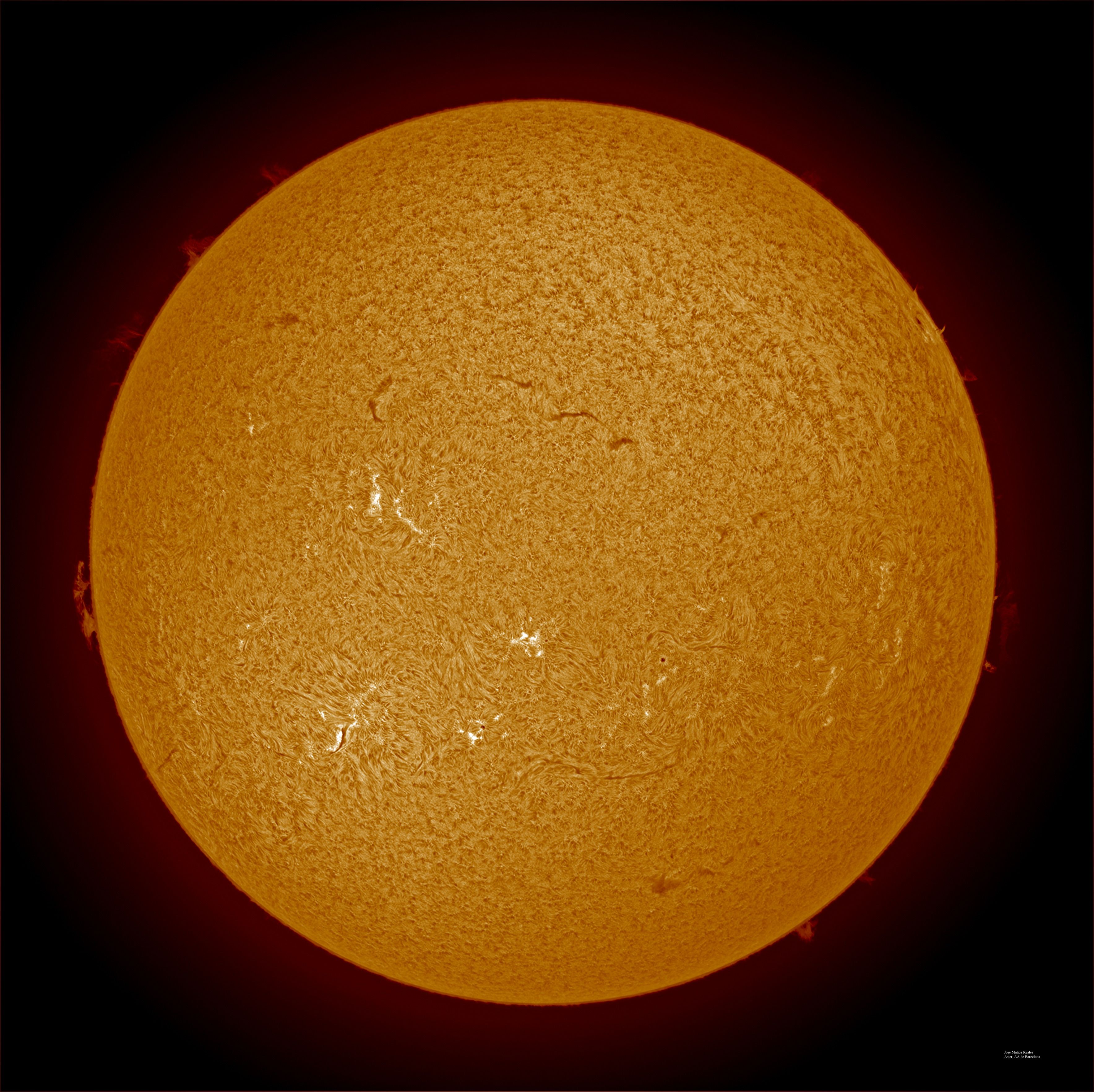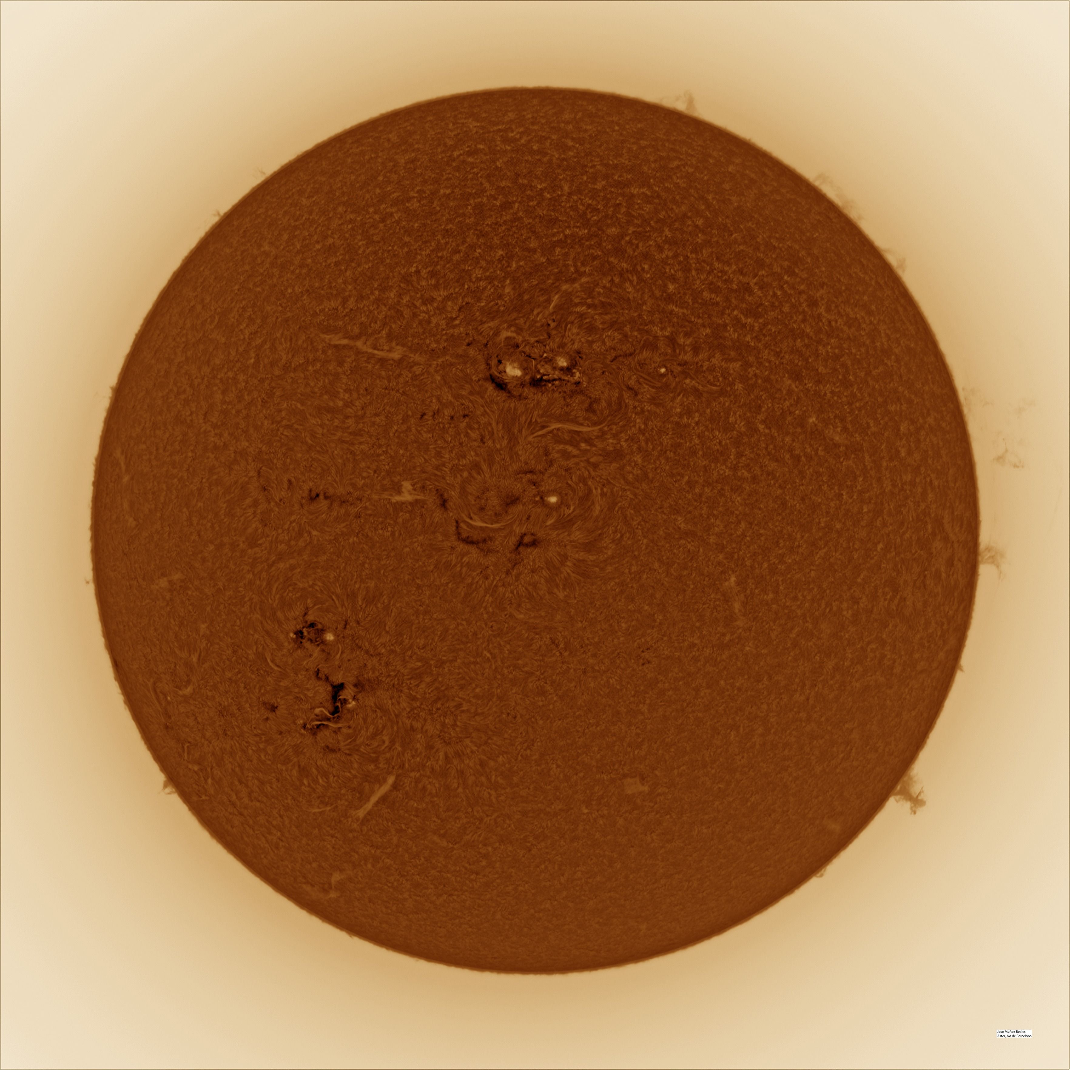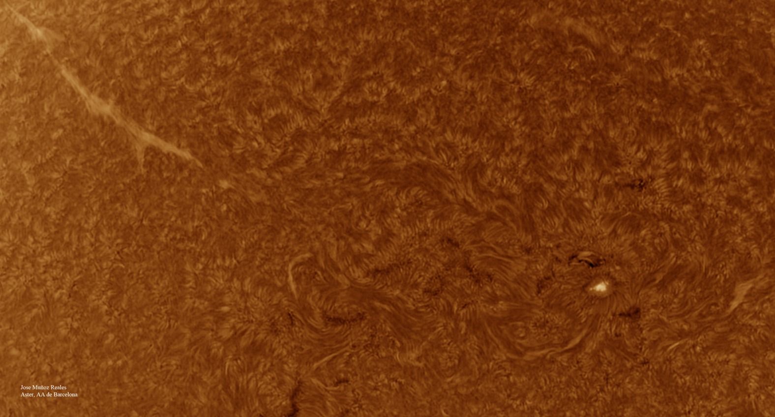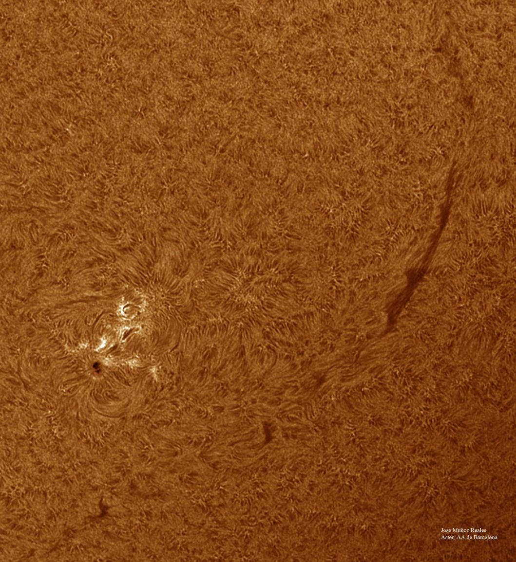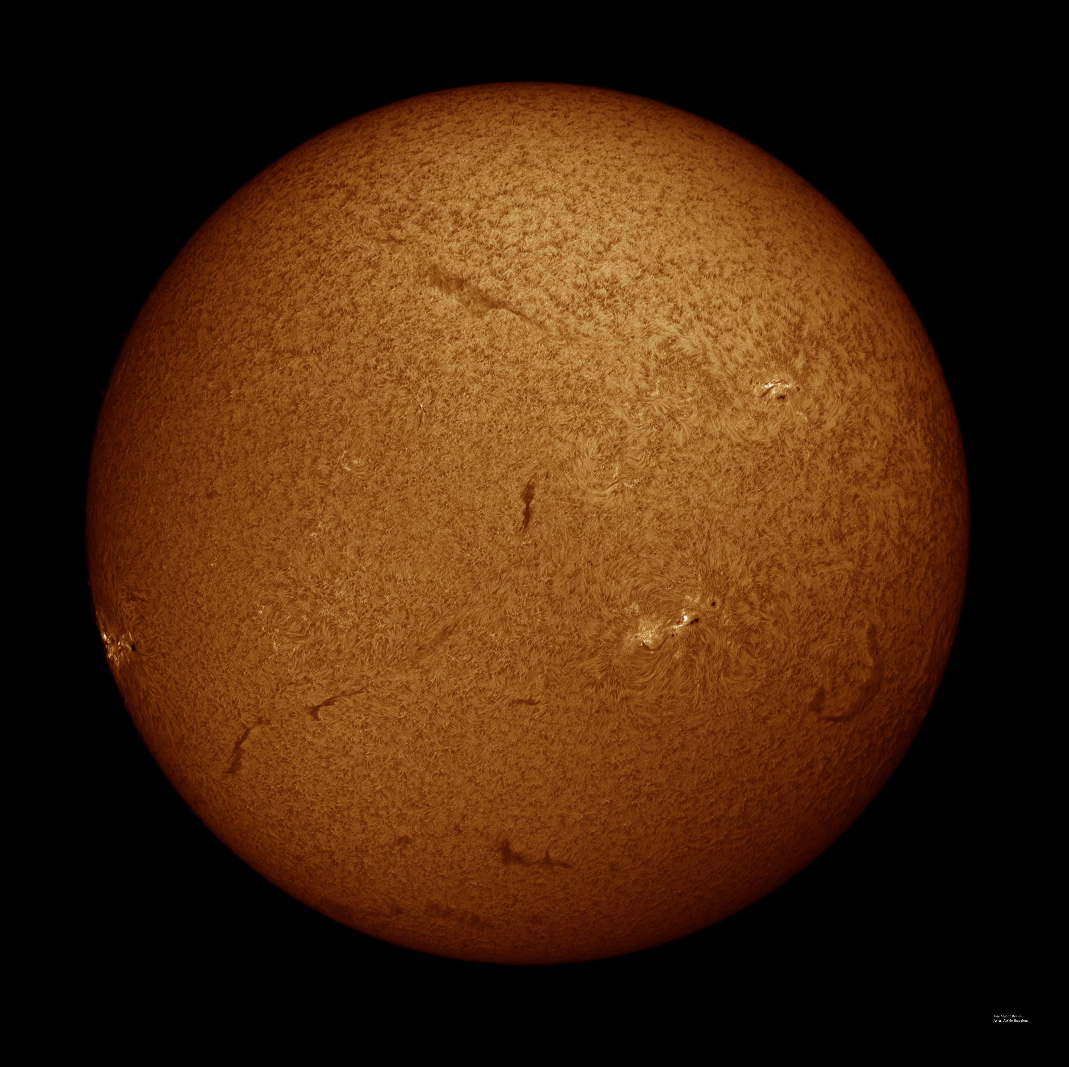 | Autor: Albert Sánchez Instrumento: - Ha: ED120 f-38 + ASI183MM + Quark H alpha - Ca: Baader K-Line - Visible: Filtro Calcio y Baader Astrosolar |