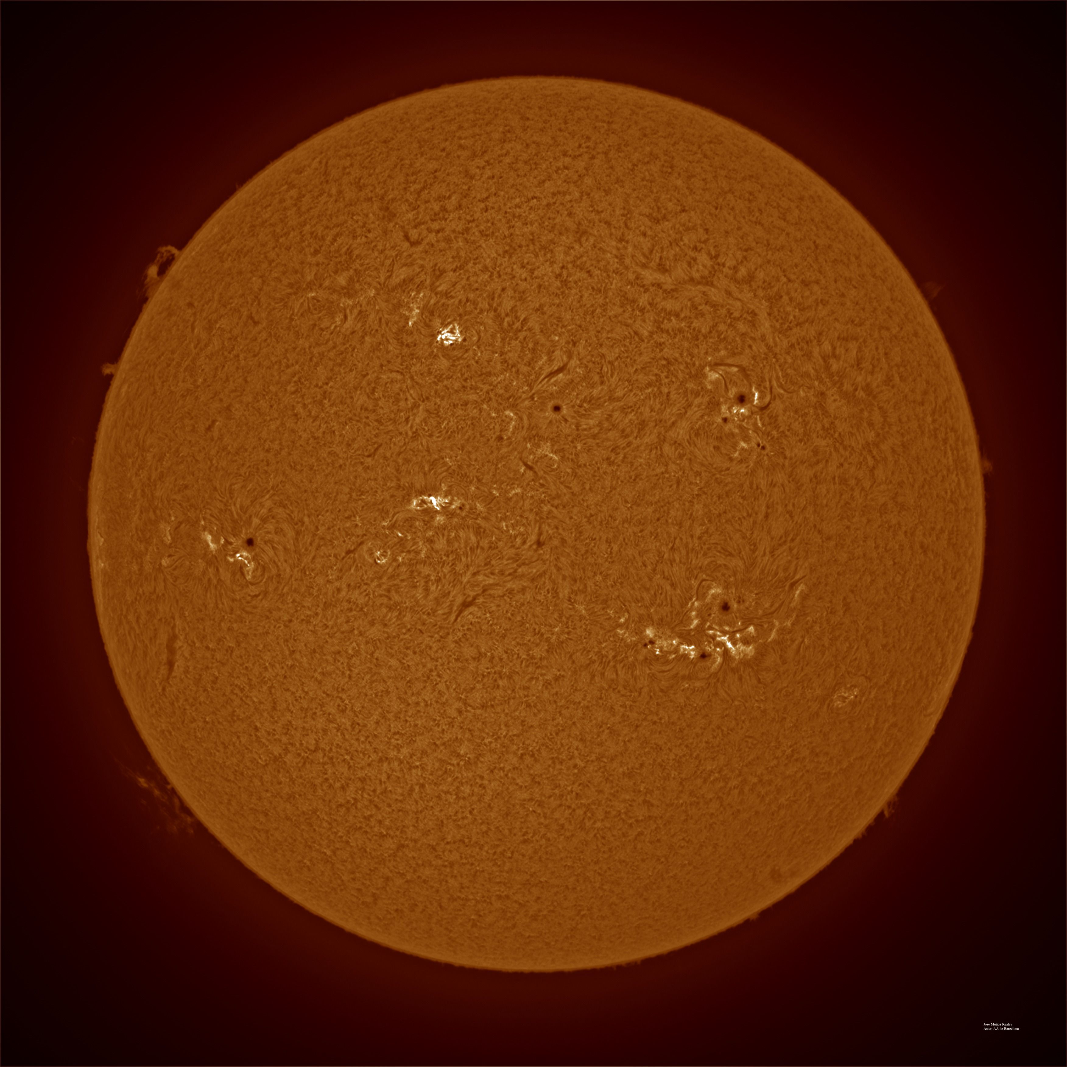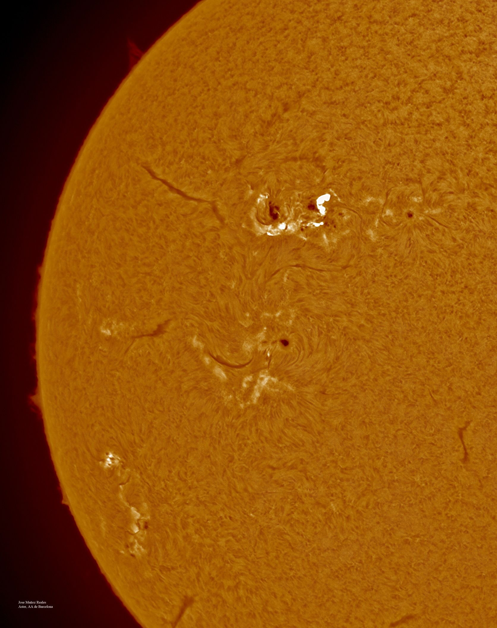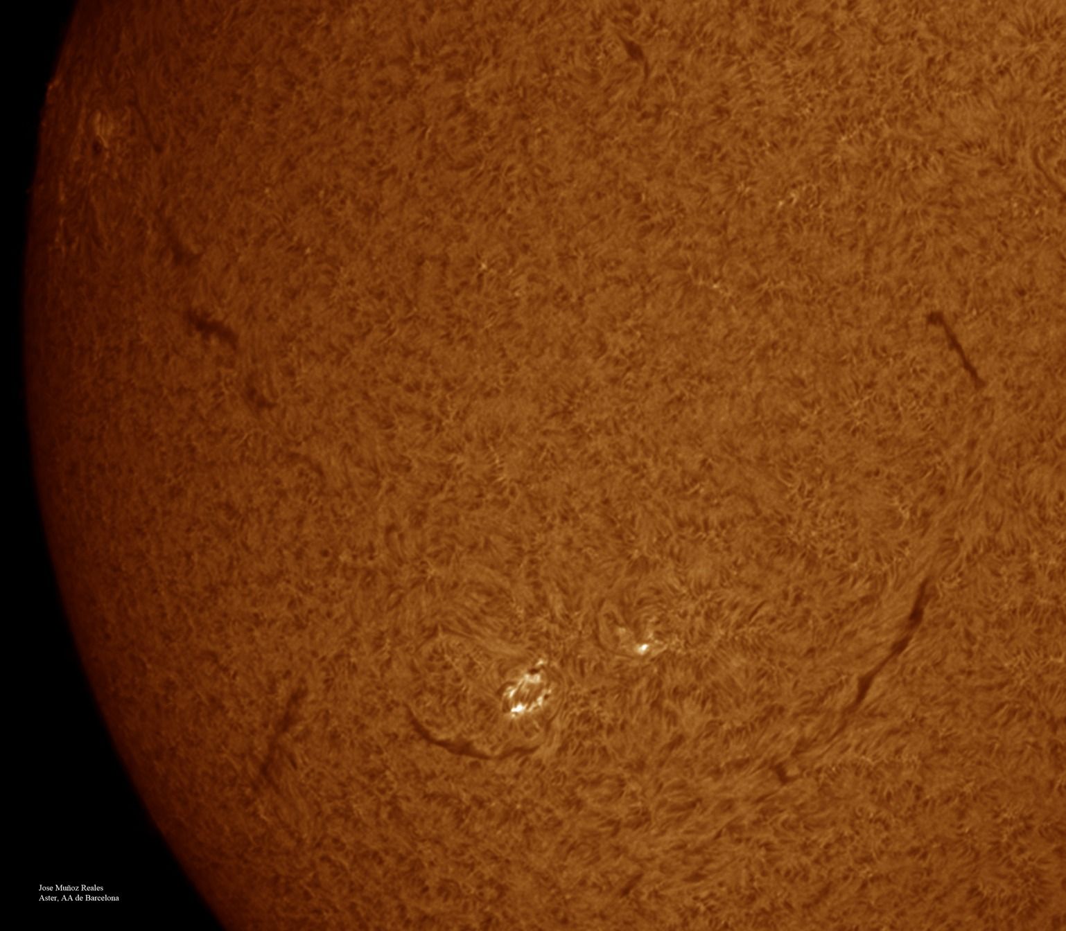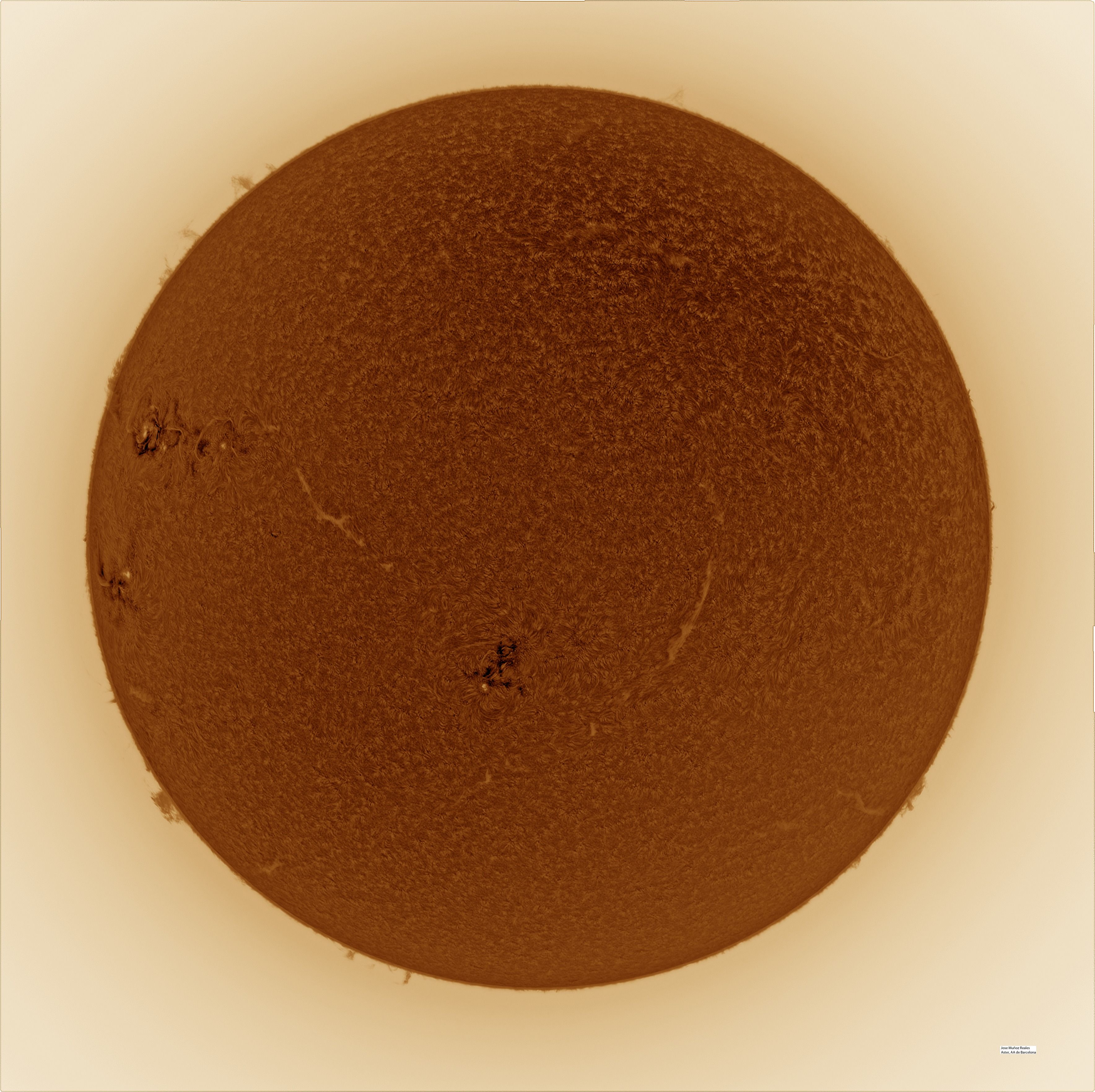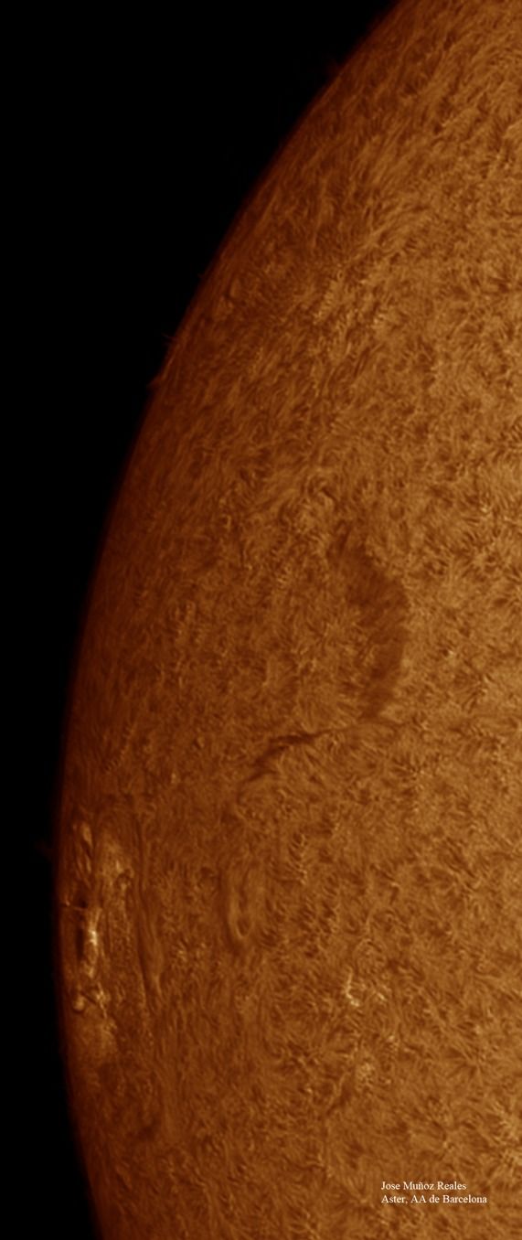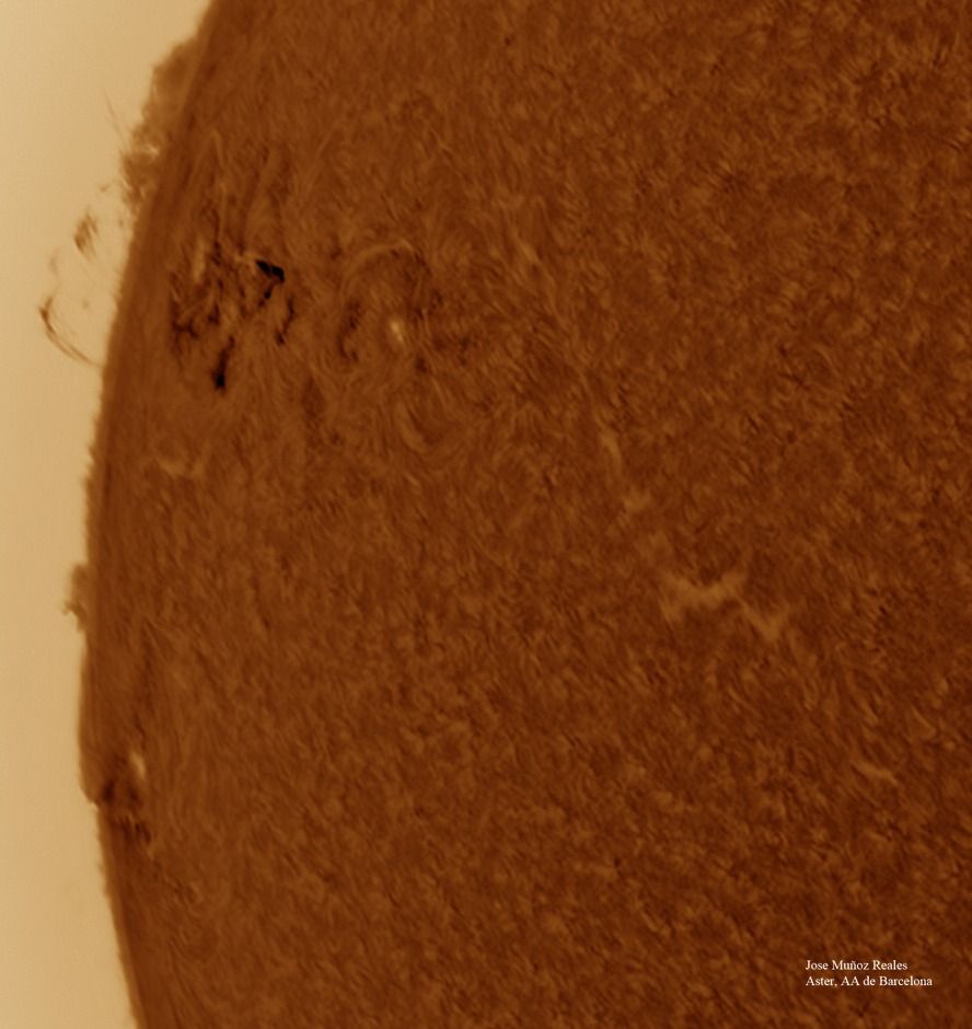 | Autor: Albert Sánchez Instrumento: - Ha: ED120 f-38 + ASI183MM + Quark H alpha - Ca: Baader K-Line - Visible: Filtro Calcio y Baader Astrosolar |