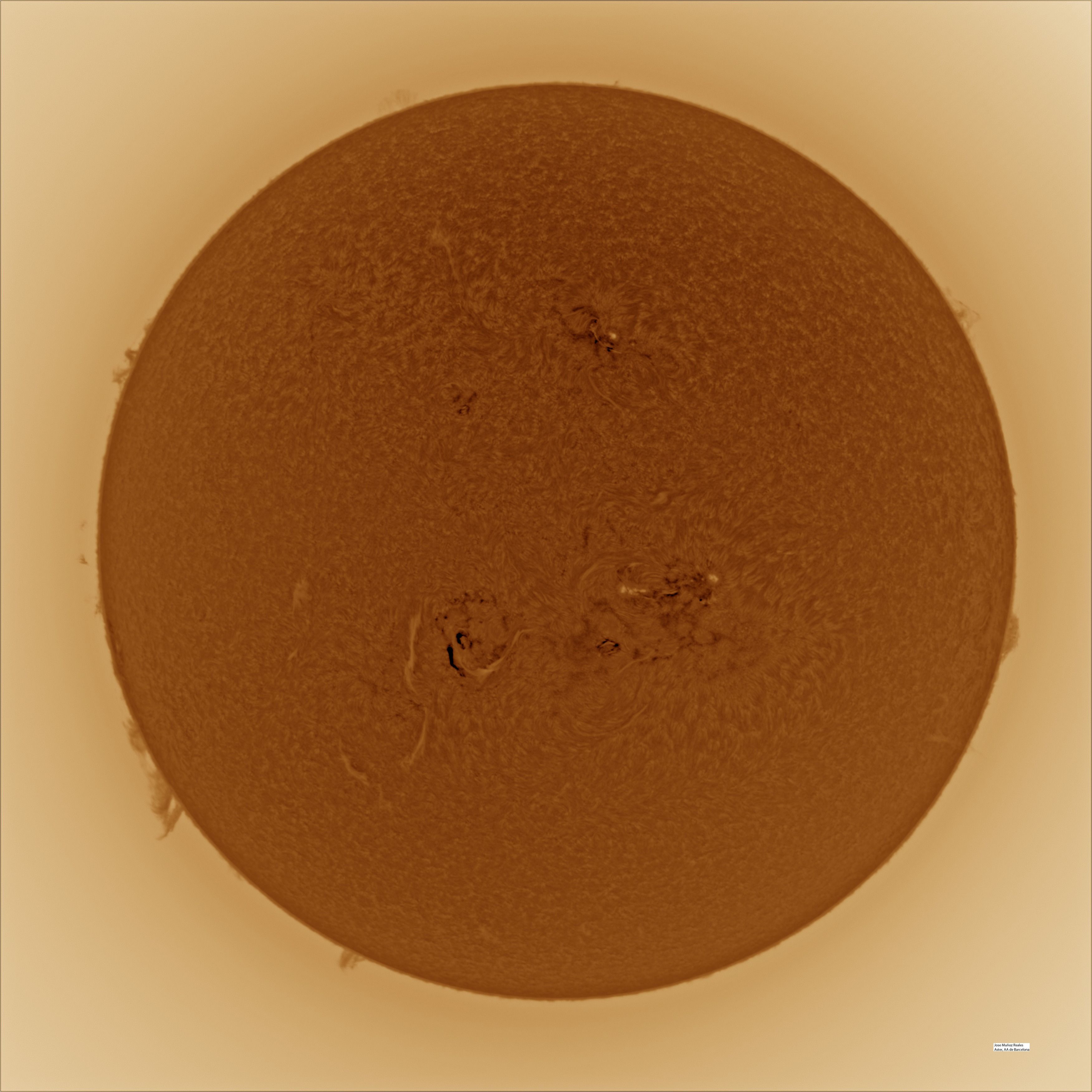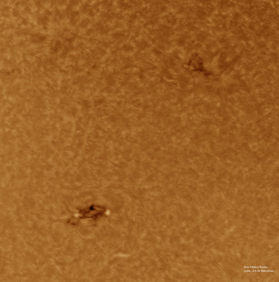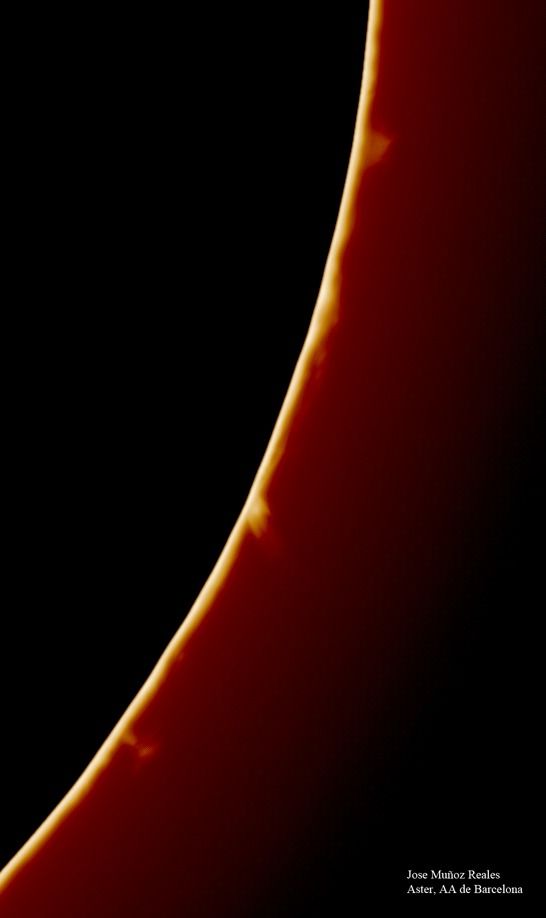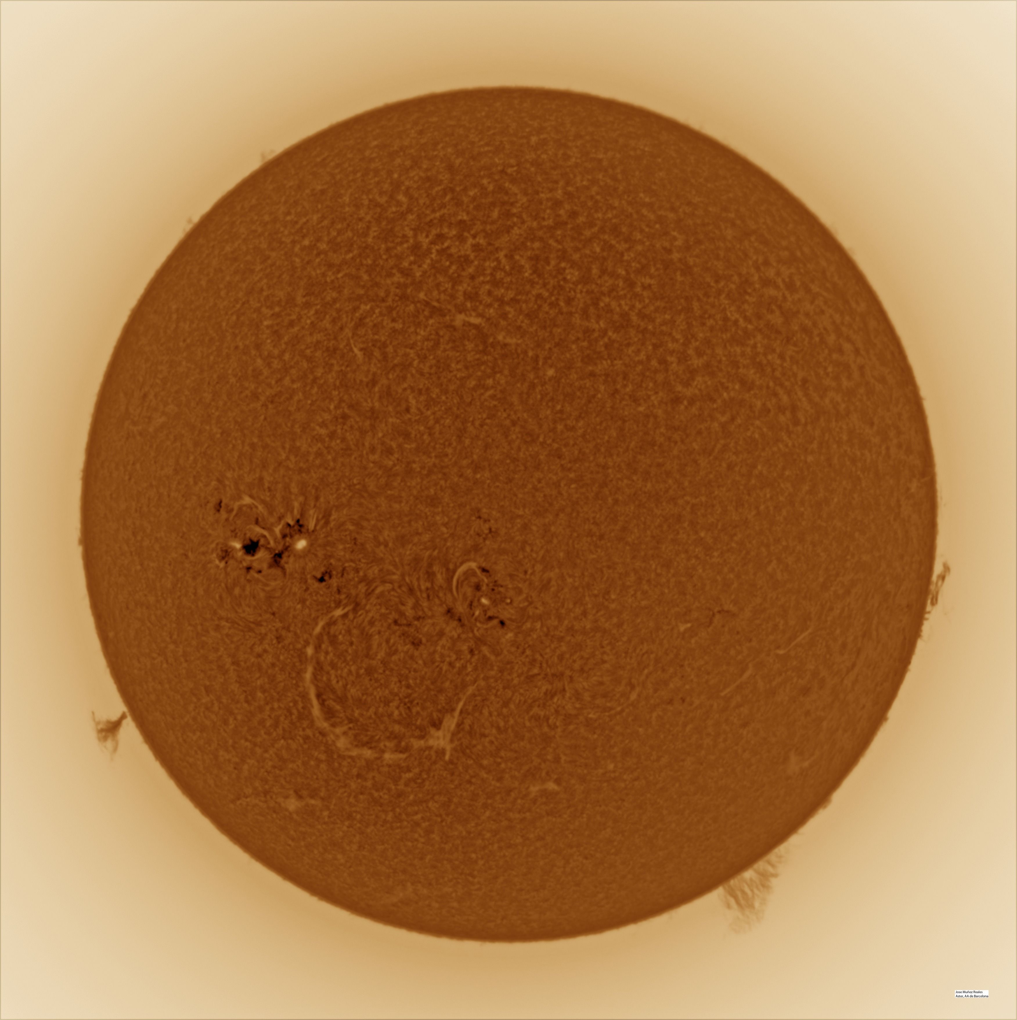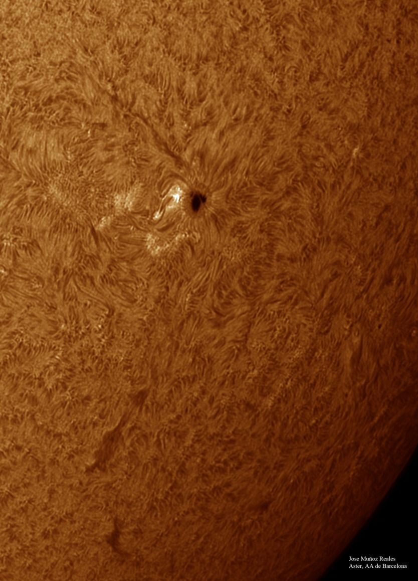 | Autor: Albert Sánchez Instrumento: - Ha: ED120 f-38 + ASI183MM + Quark H alpha - Ca: Baader K-Line - Visible: Filtro Calcio y Baader Astrosolar |