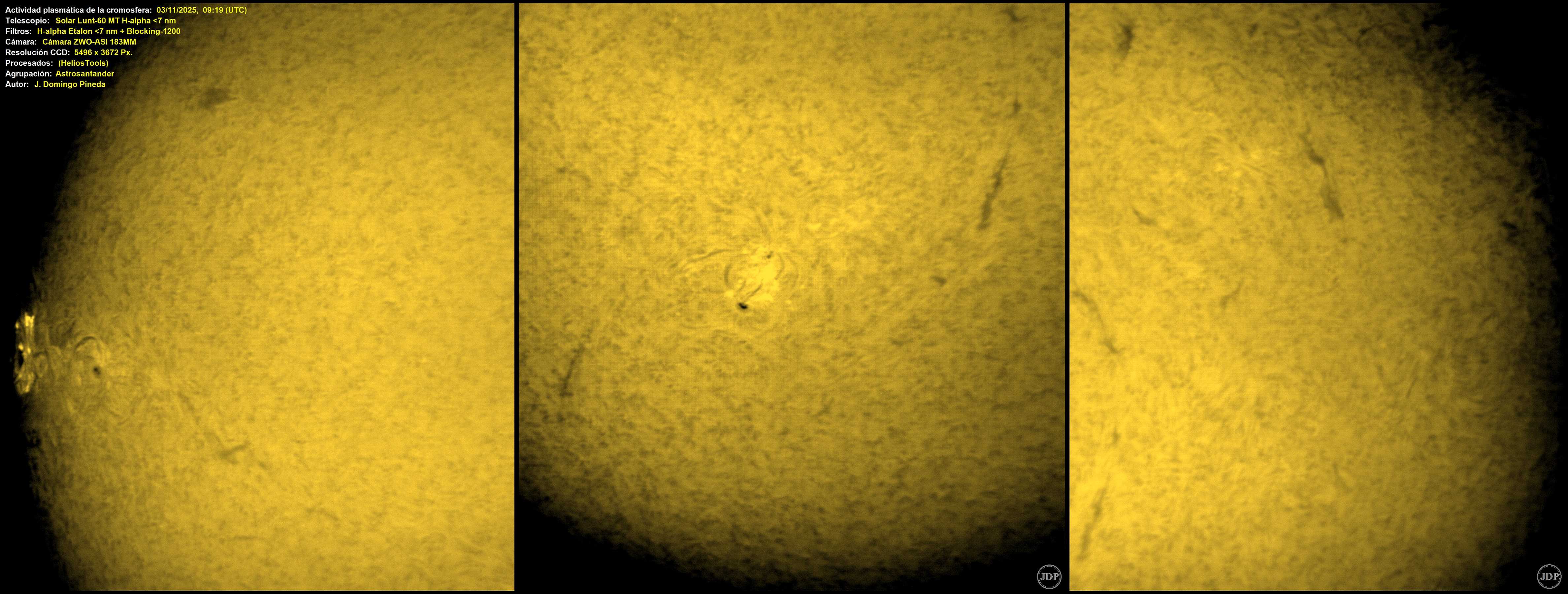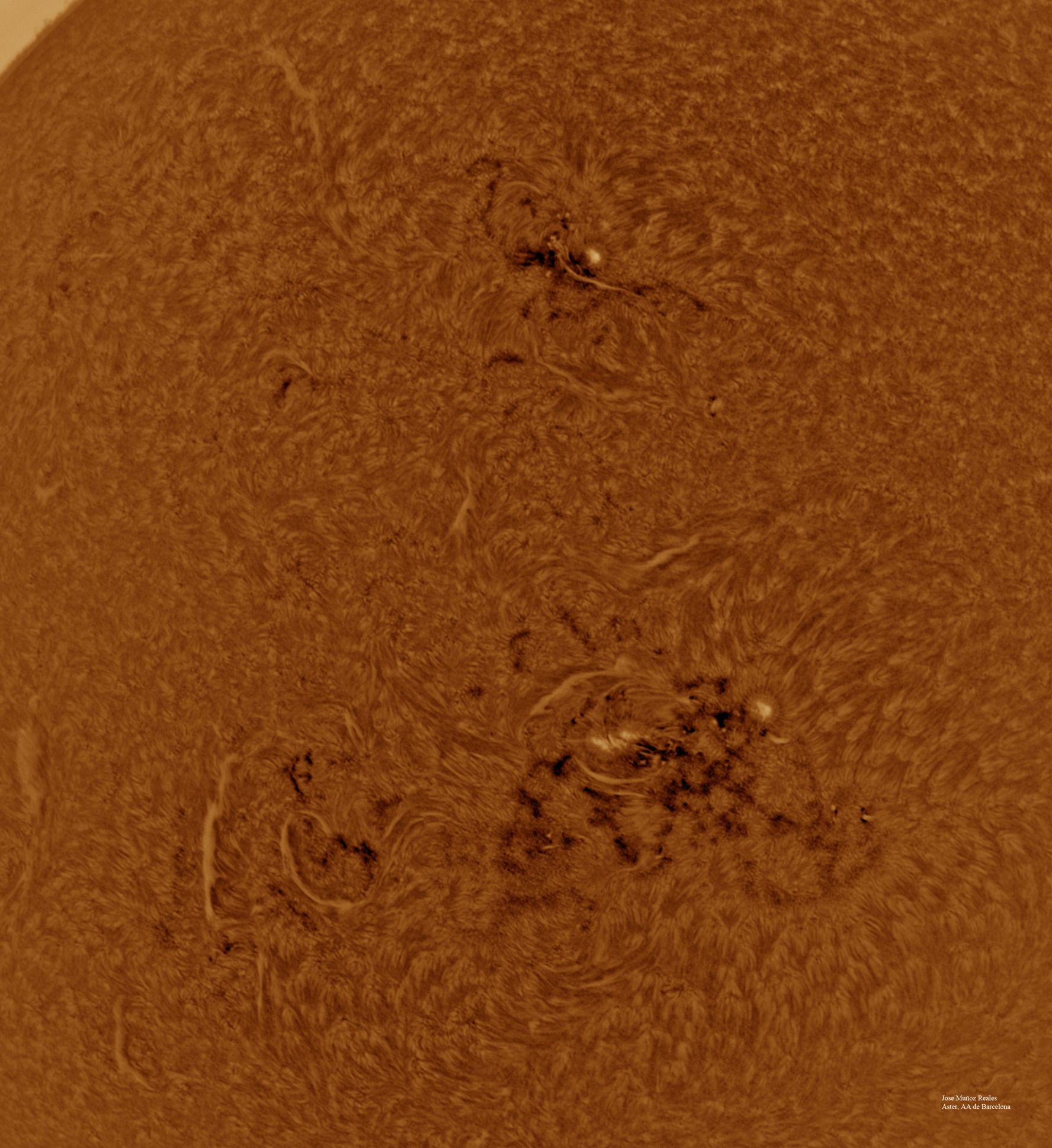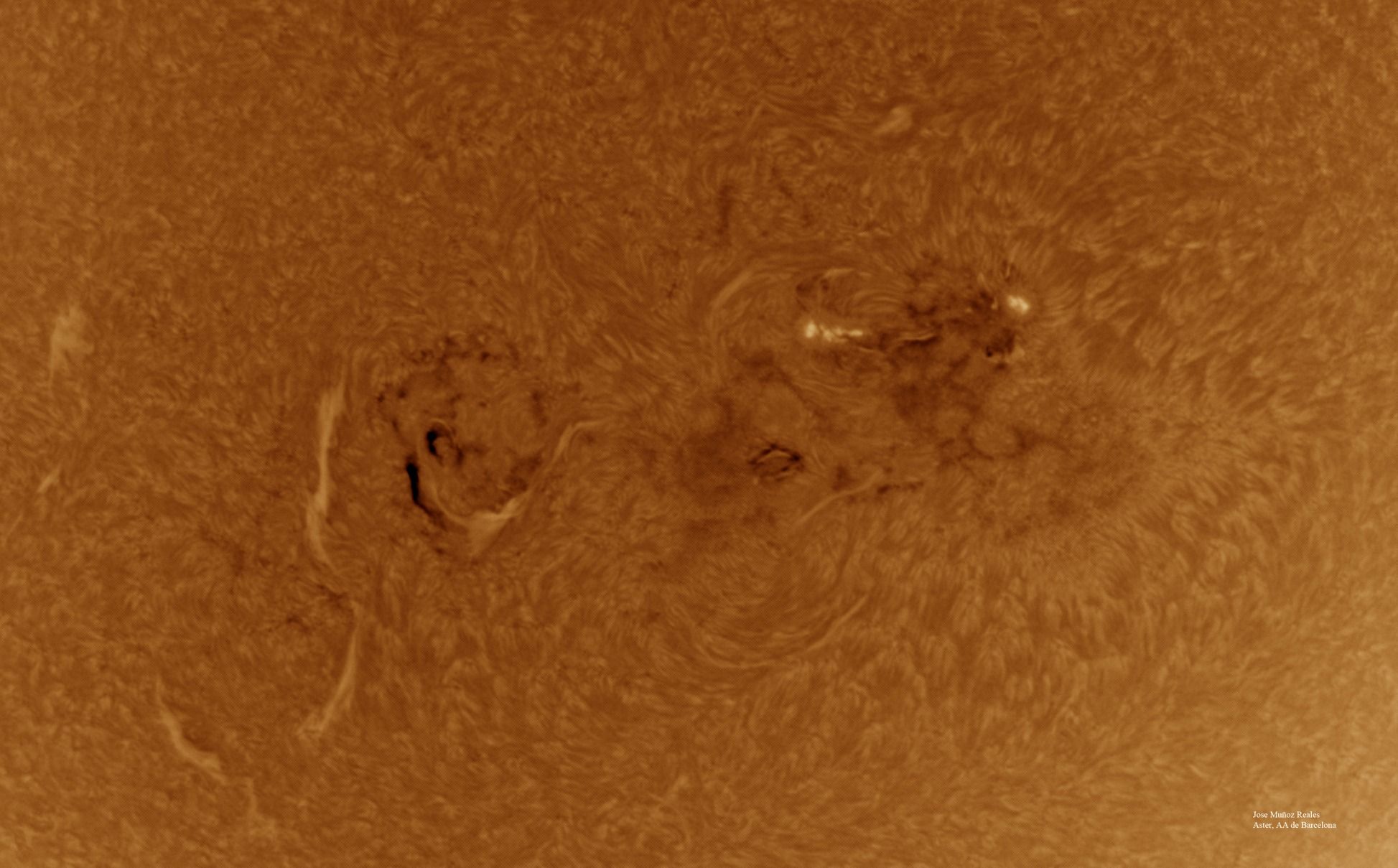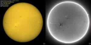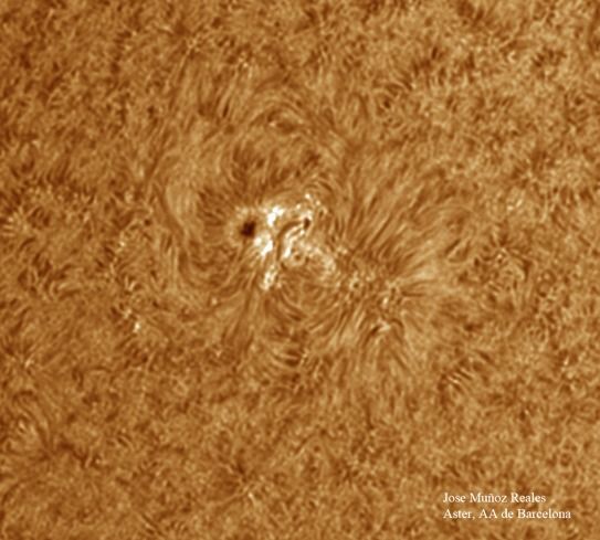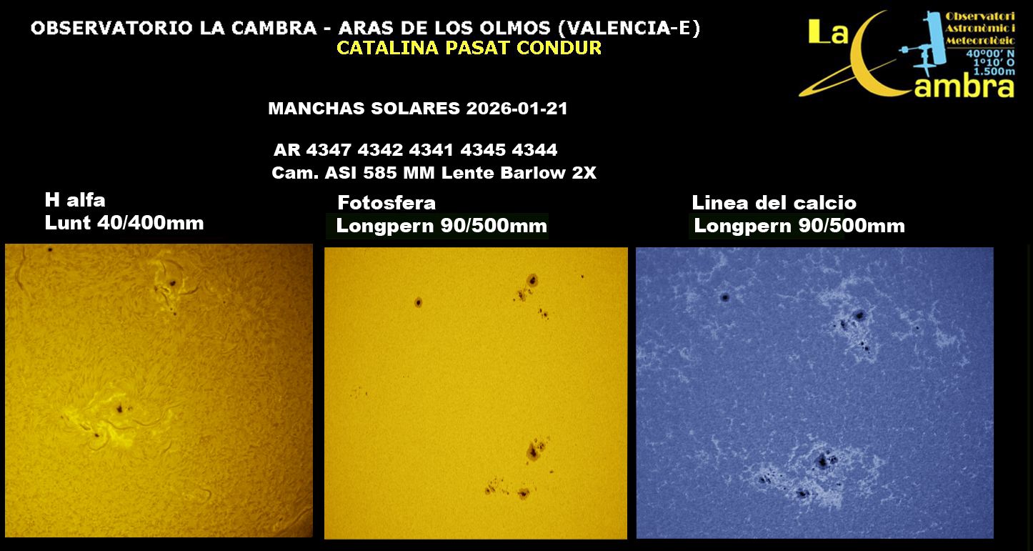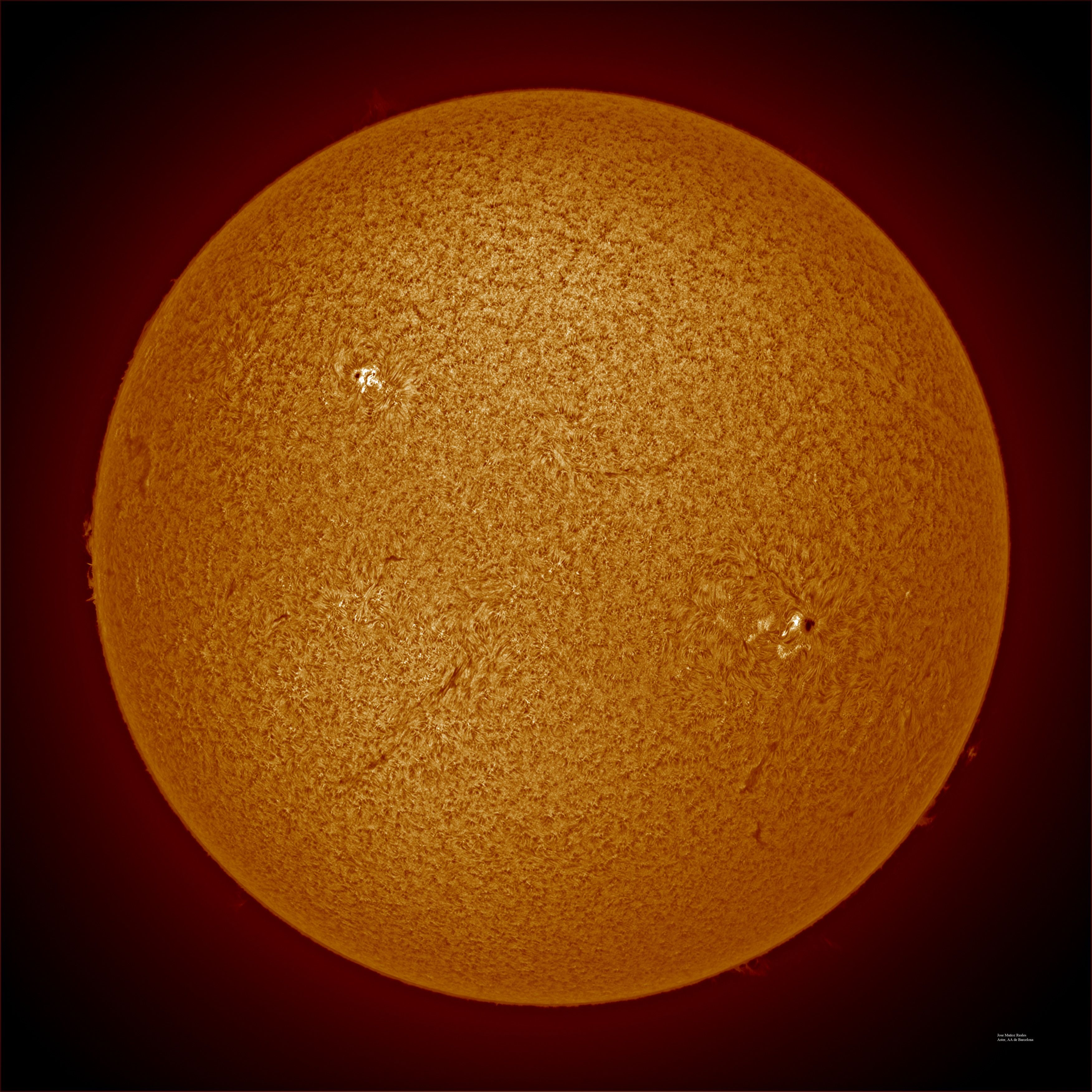 | Autor: Albert Sánchez Instrumento: - Ha: ED120 f-38 + ASI183MM + Quark H alpha - Ca: Baader K-Line - Visible: Filtro Calcio y Baader Astrosolar |