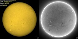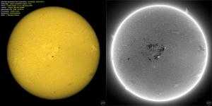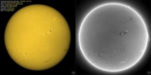 | Autor: Luis Farinós Luz blanca: Astrosolar + Skywatcher Evolux 62ED + Solar Continuum Ca: Skywatcher Evolux 62ED + Módulo Ca Lunt B600 Ha: Lunt LS40tha B500 Cámara: ZWO ASI290MM |