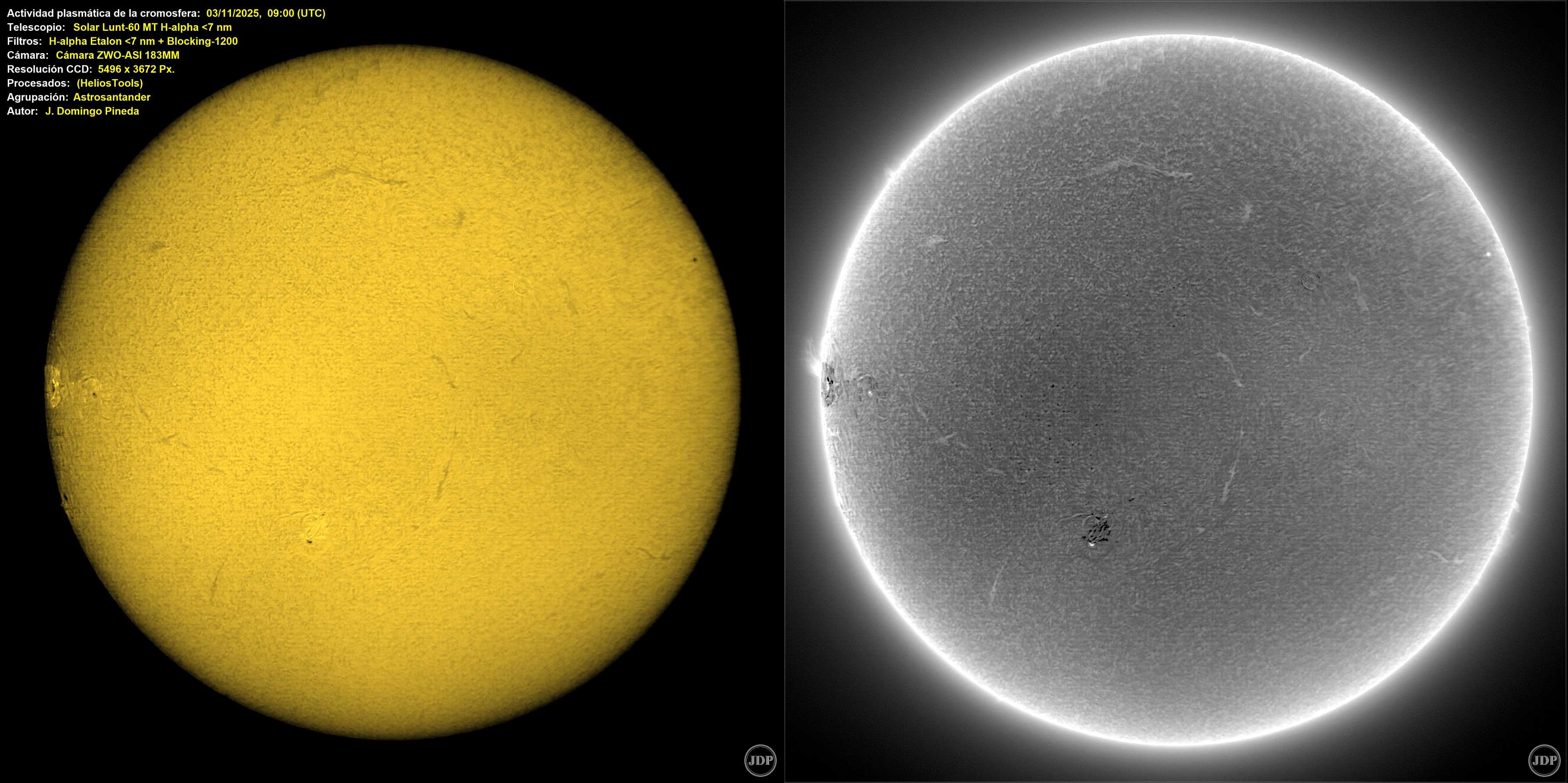 | Autor: José Domingo Pineda Instrumentos: Maksutov-180 DF-2700, Lunt-60MT <7 nm Cámaras: RisingCam ATR3 cooling -40, ZWO-ASI 183-MM |