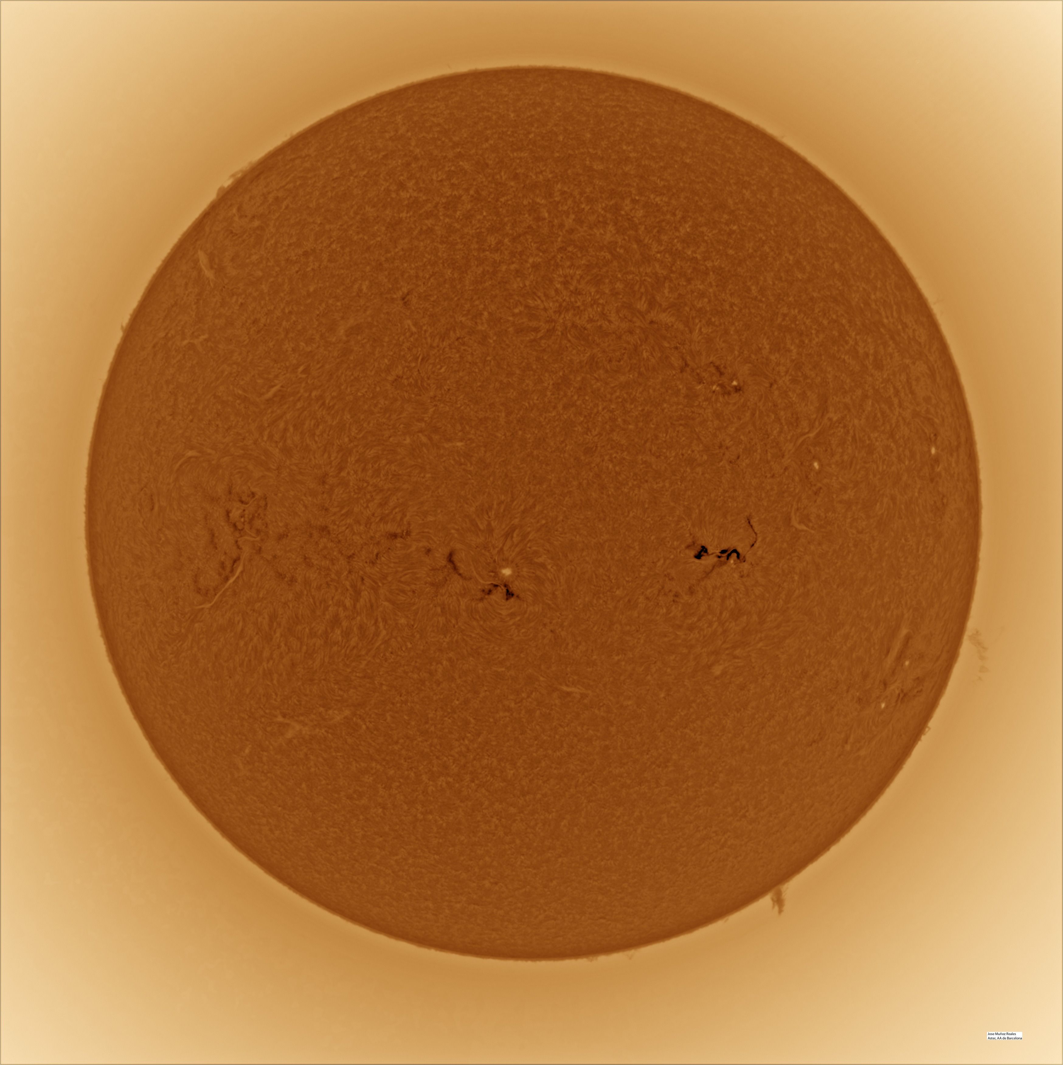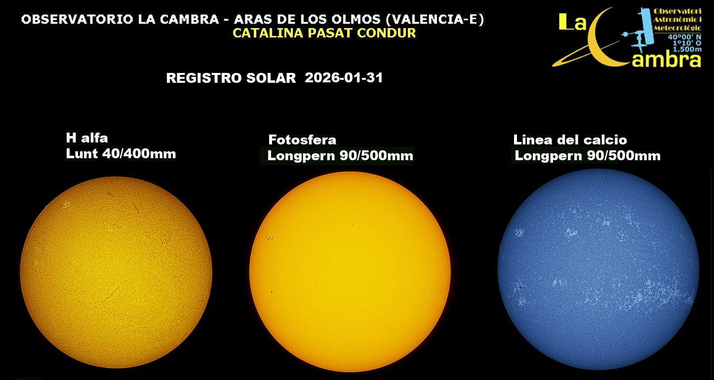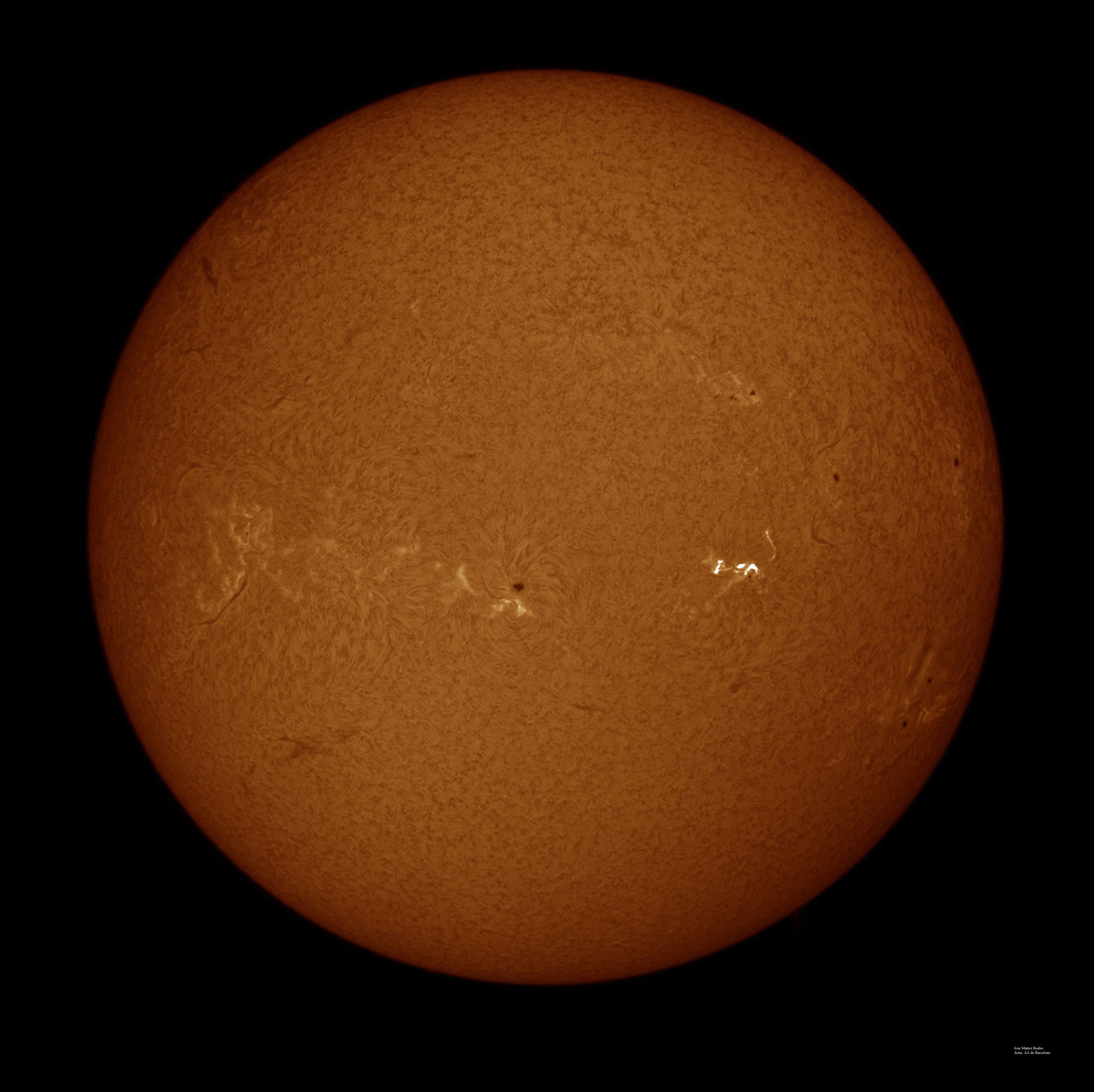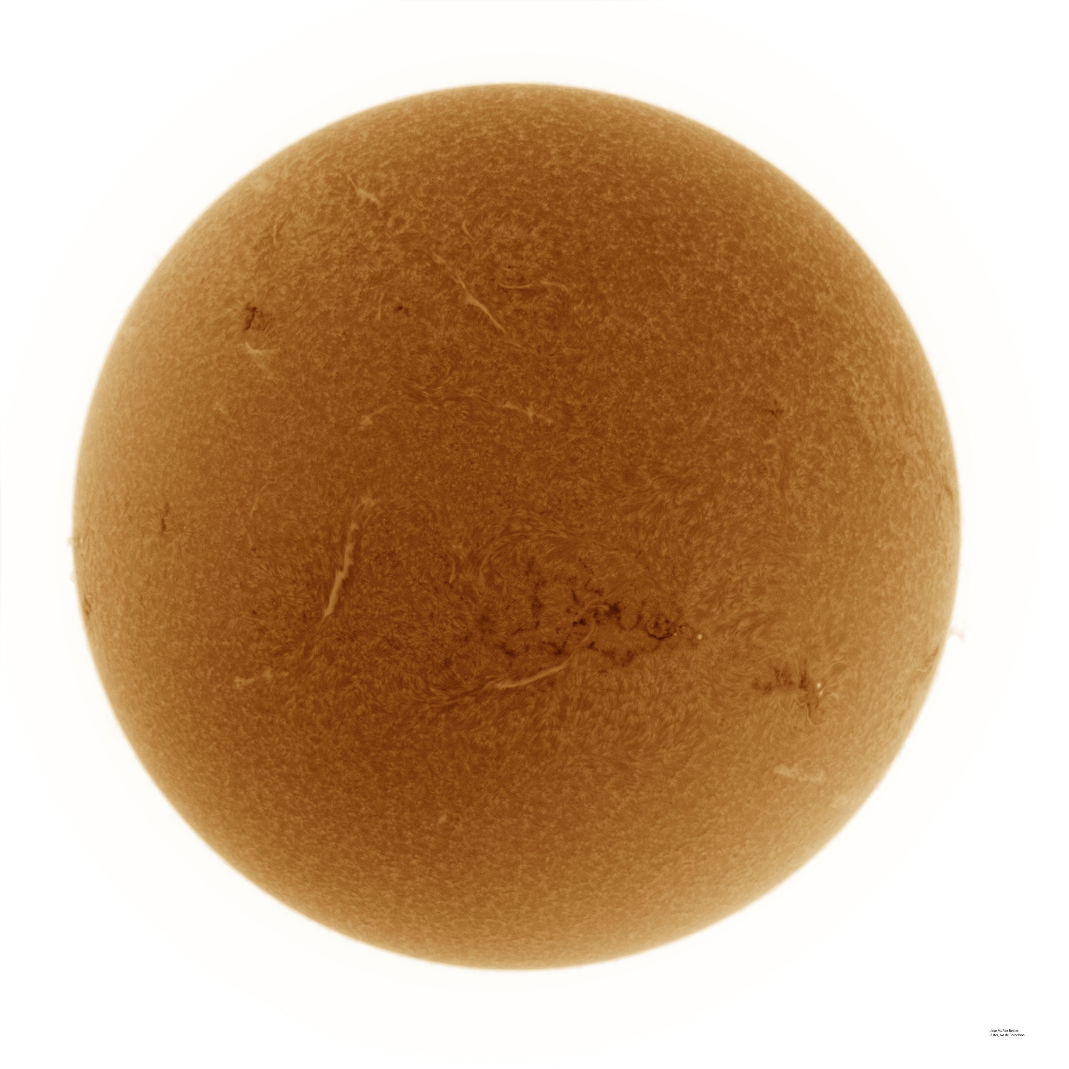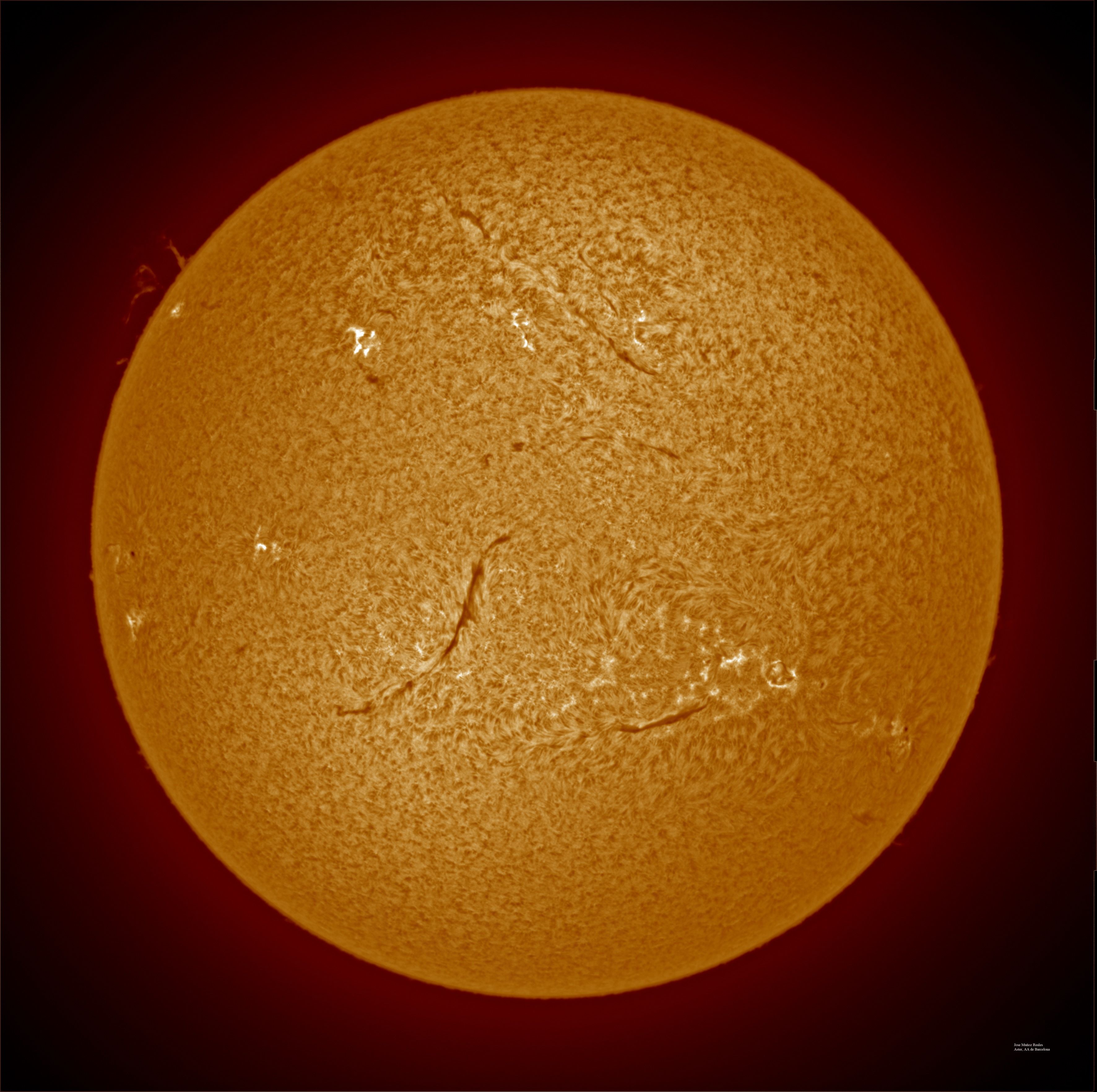 | Autor: Albert Sánchez Instrumento: - Ha: ED120 f-38 + ASI183MM + Quark H alpha - Ca: Baader K-Line - Visible: Filtro Calcio y Baader Astrosolar |