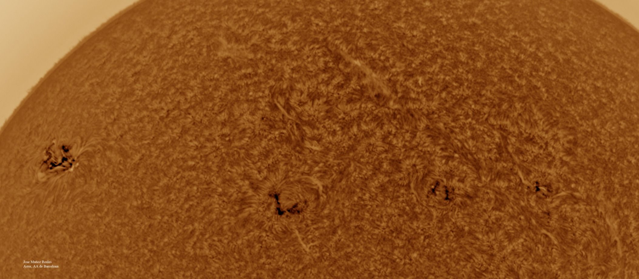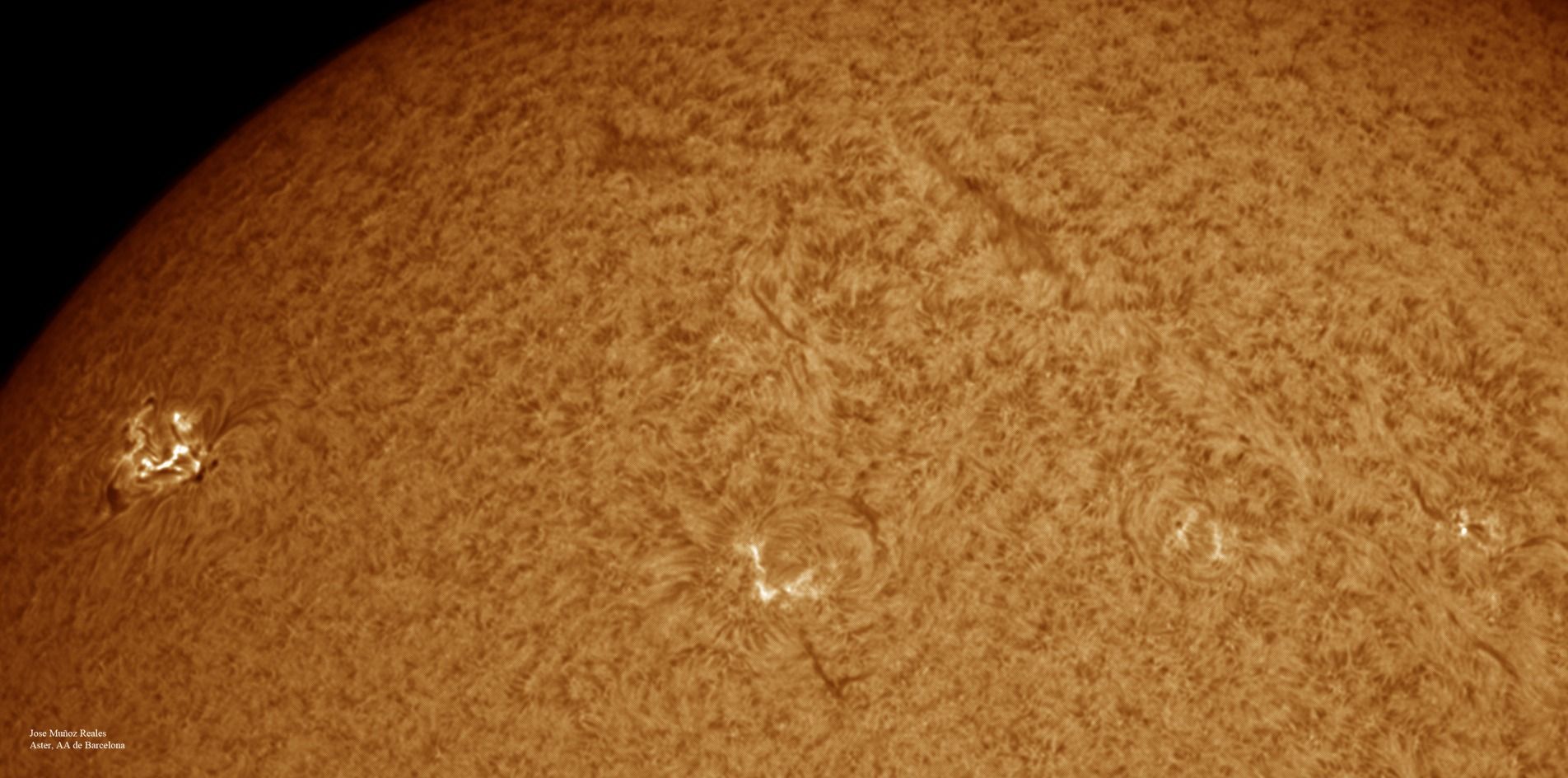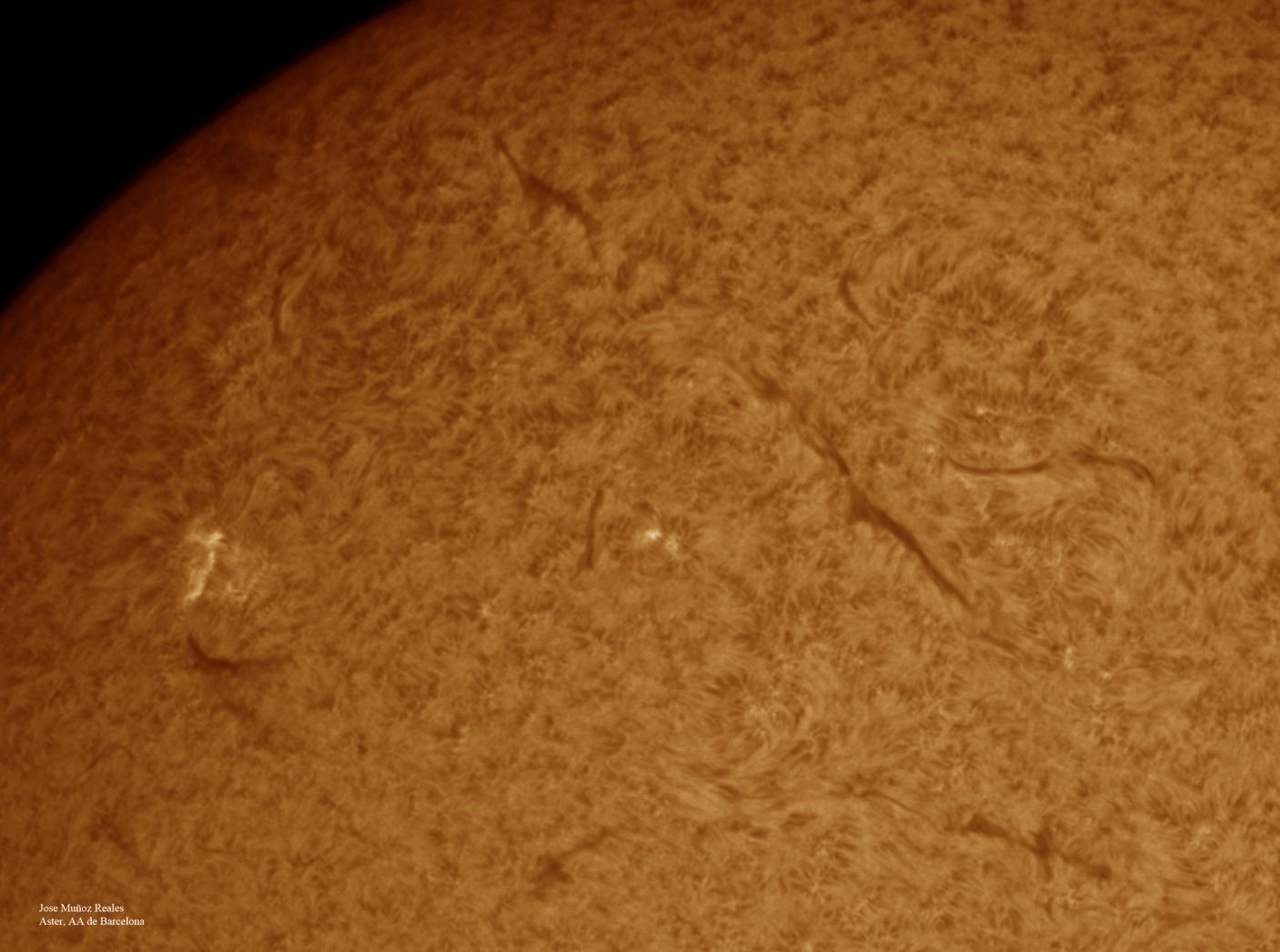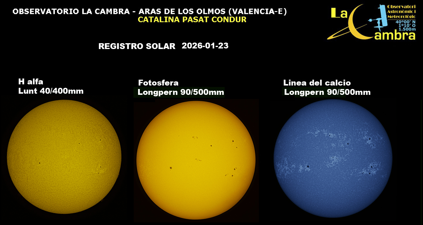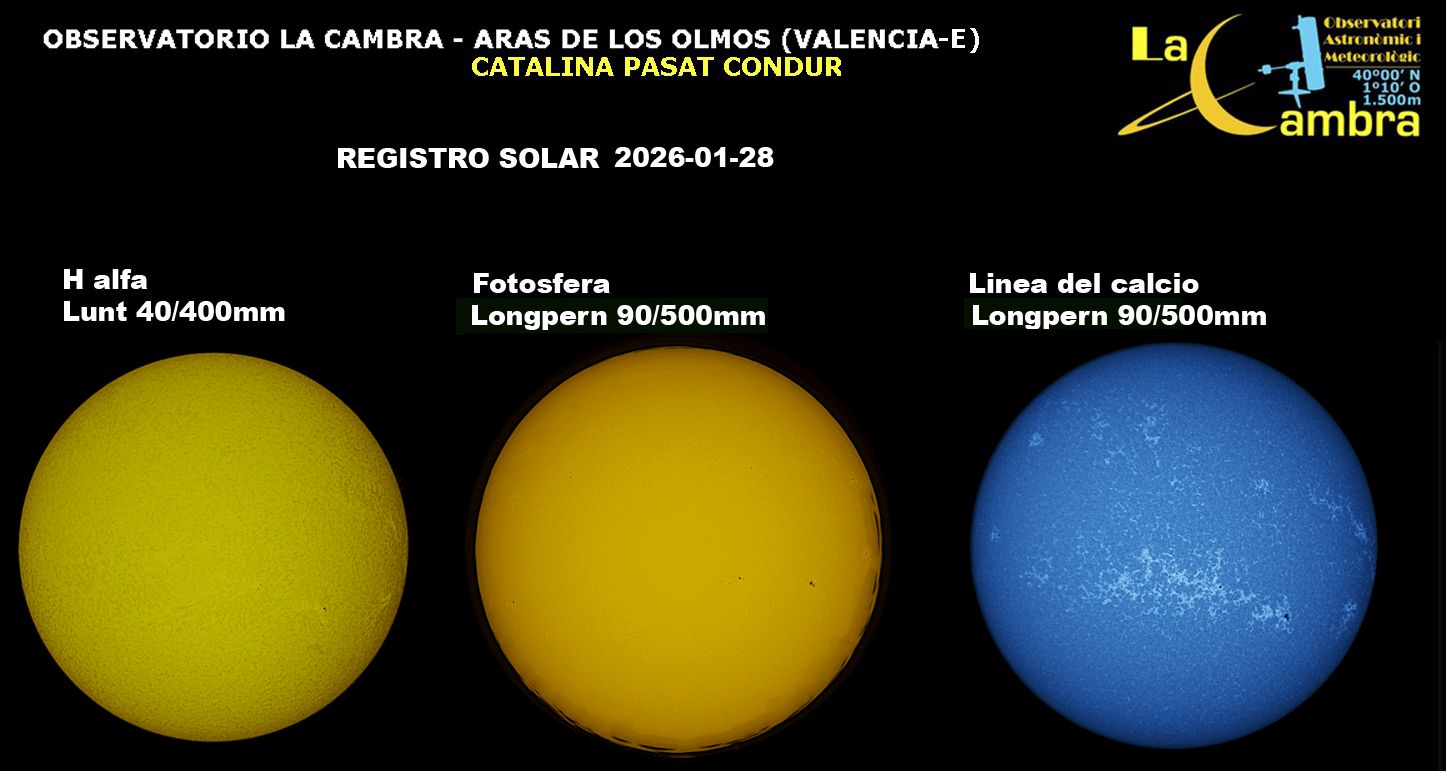 | Autor: Albert Sánchez Instrumento: - Ha: ED120 f-38 + ASI183MM + Quark H alpha - Ca: Baader K-Line - Visible: Filtro Calcio y Baader Astrosolar |