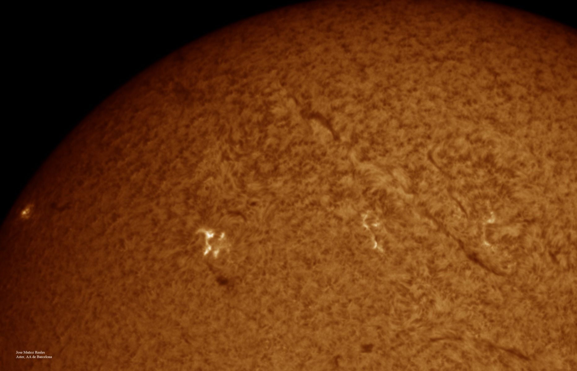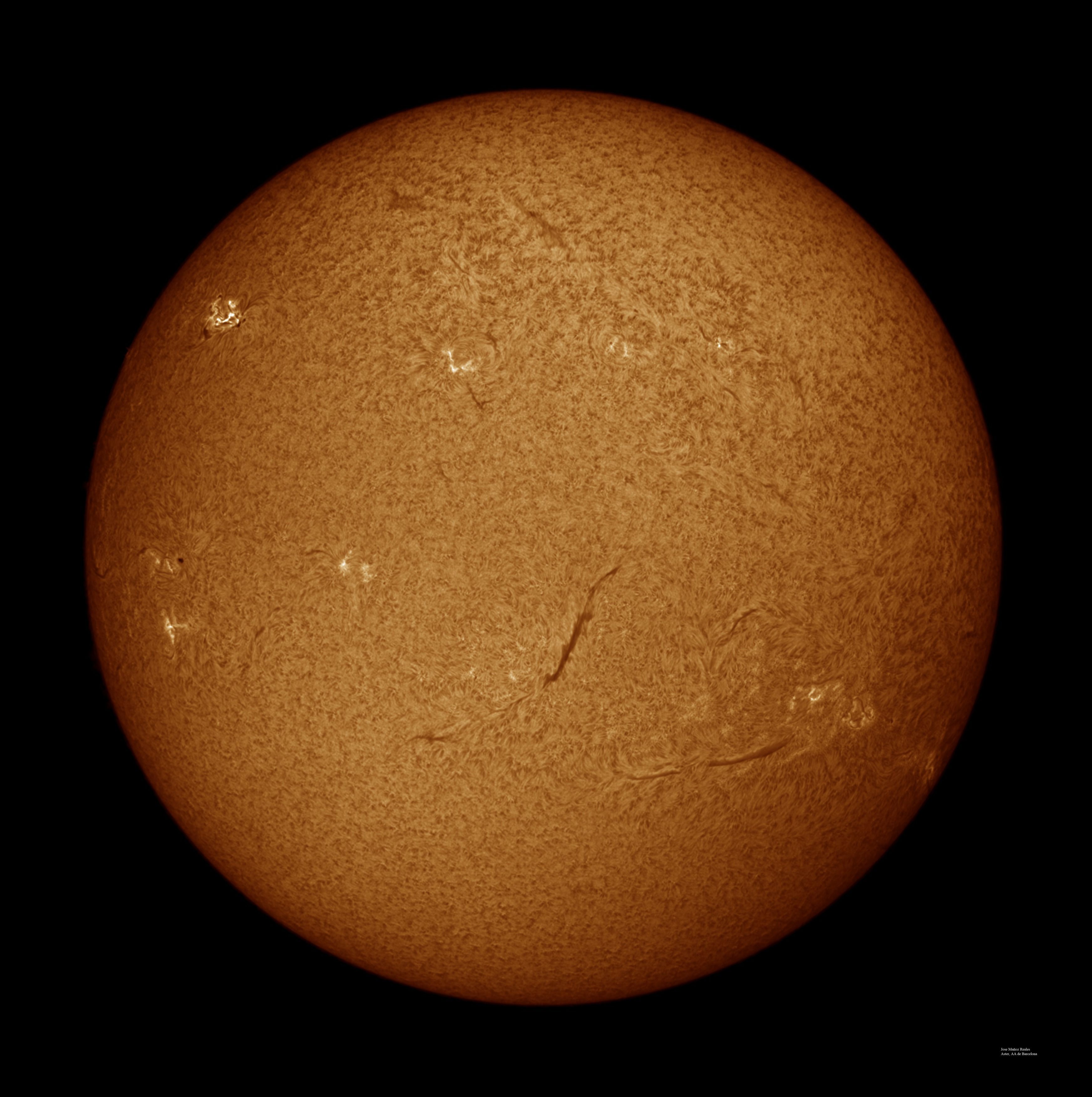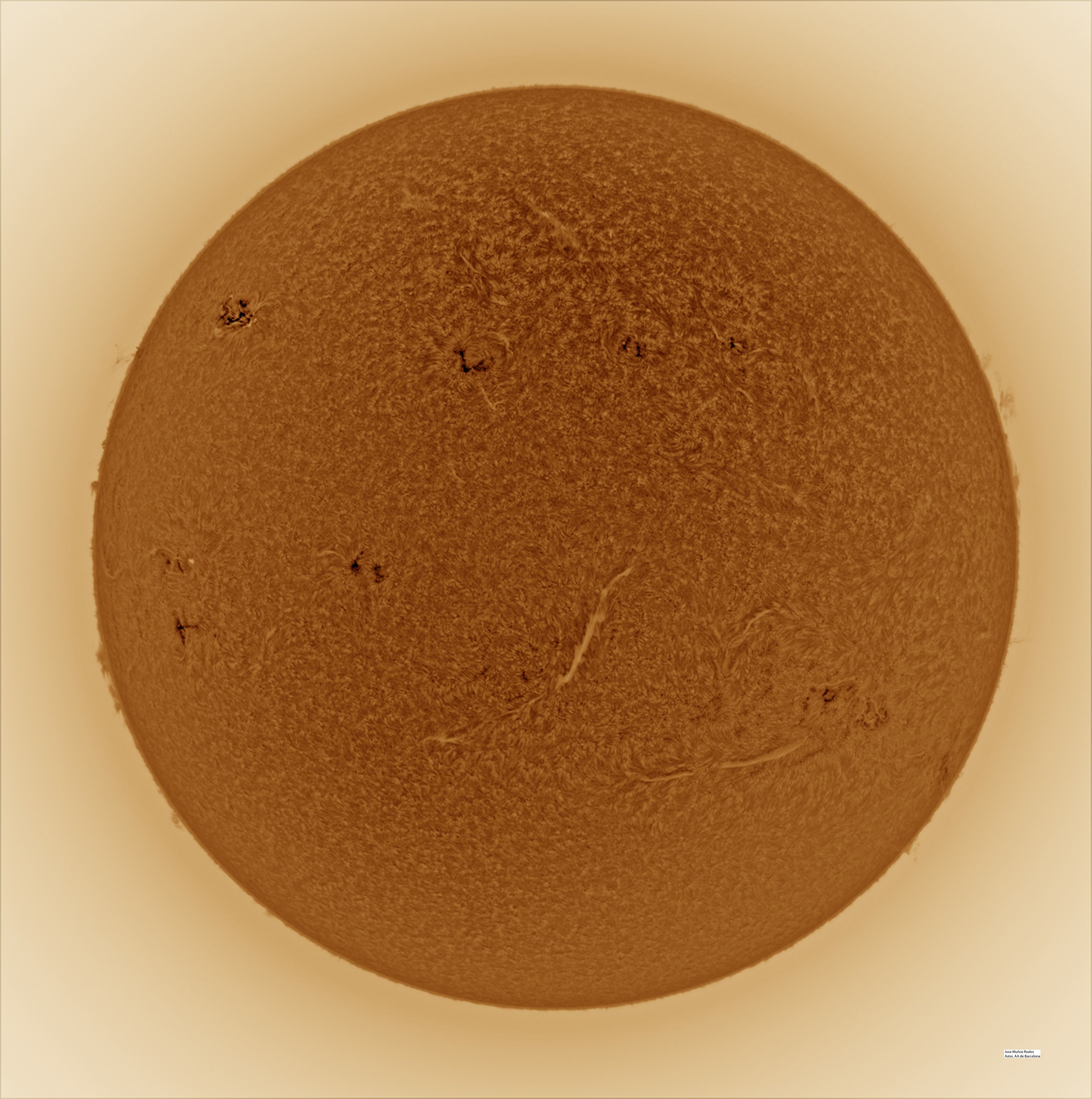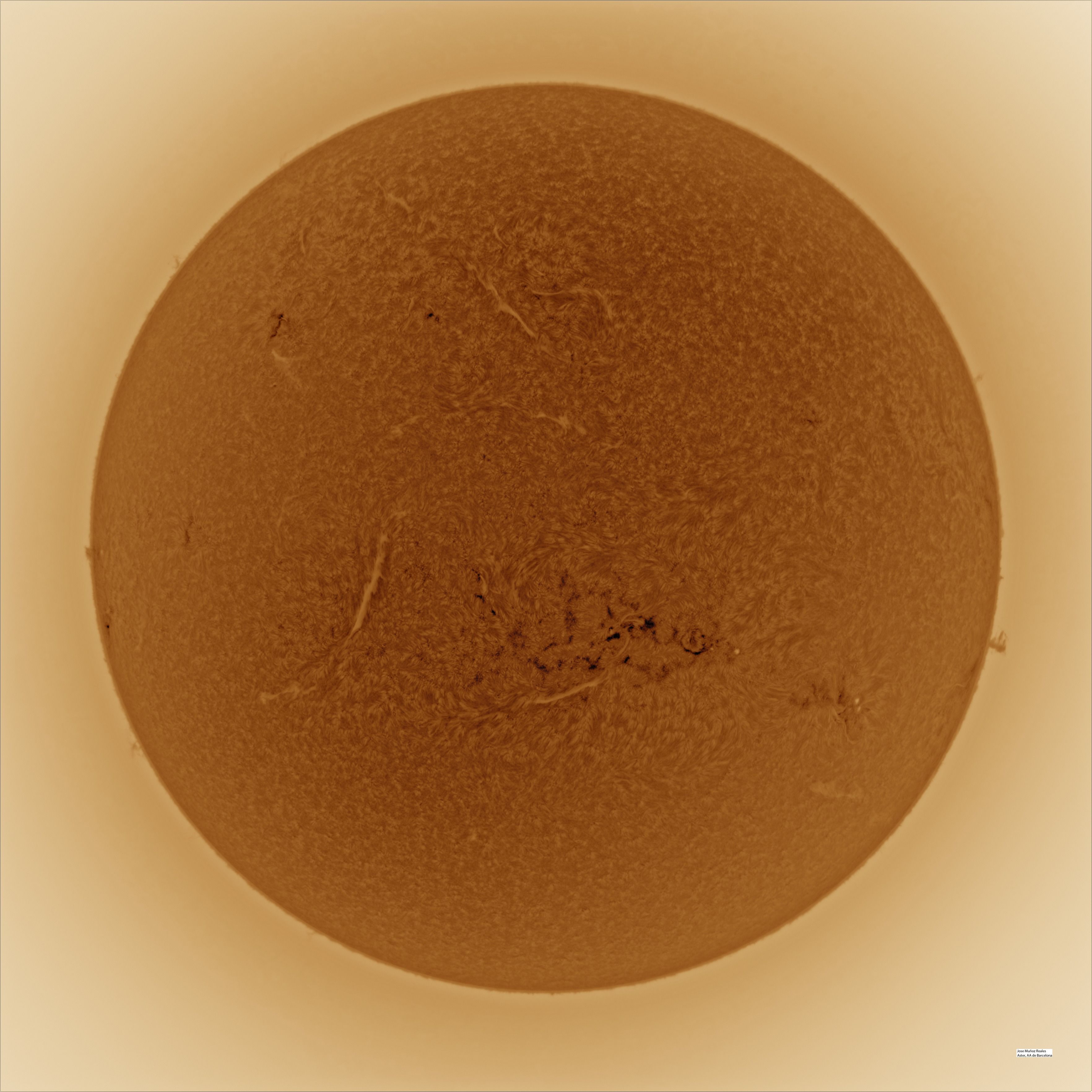 | Autor: Albert Sánchez Instrumento: - Ha: ED120 f-38 + ASI183MM + Quark H alpha - Ca: Baader K-Line - Visible: Filtro Calcio y Baader Astrosolar |