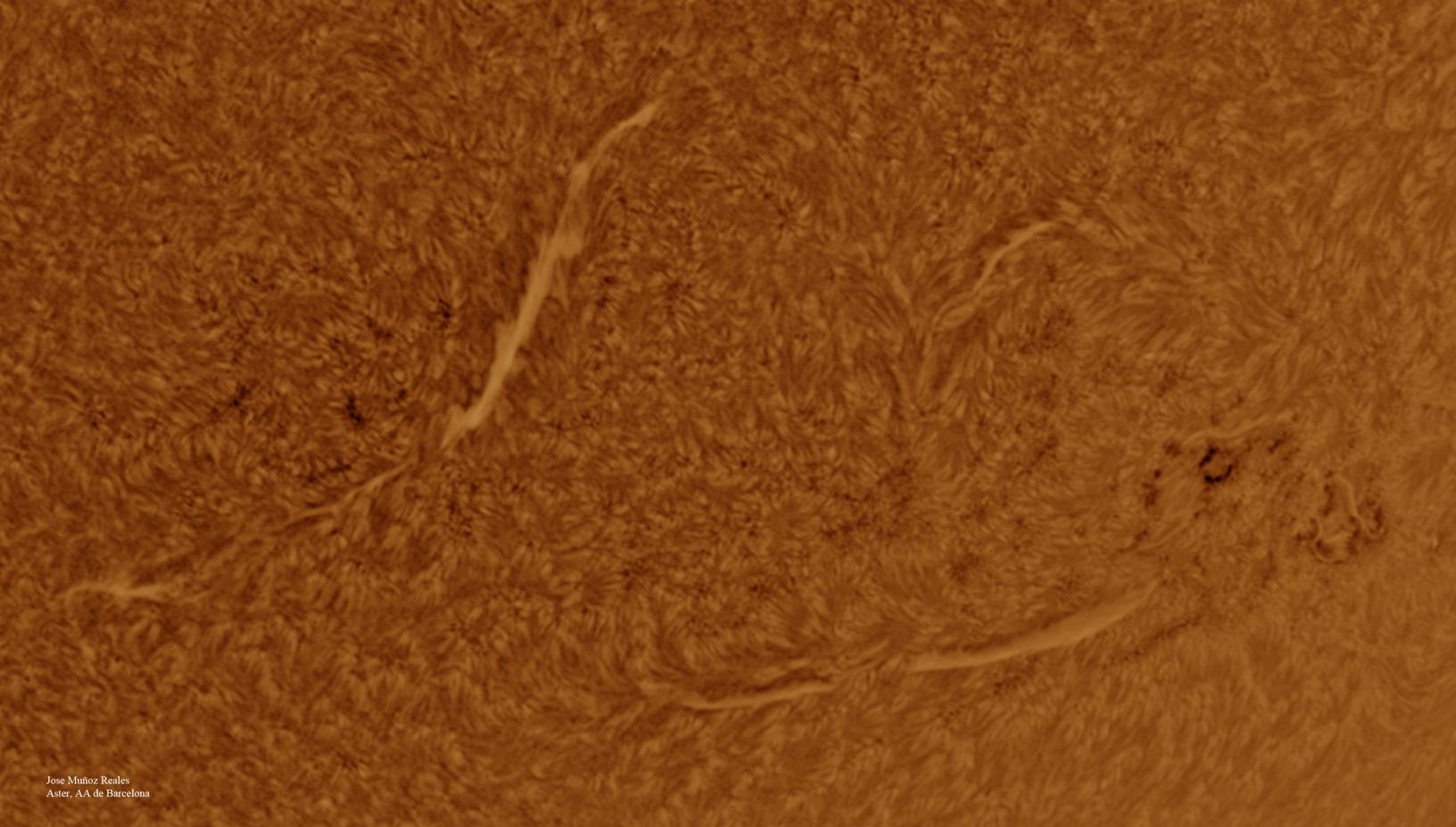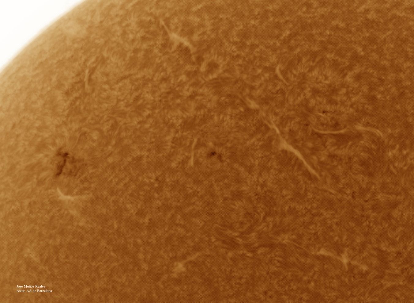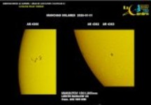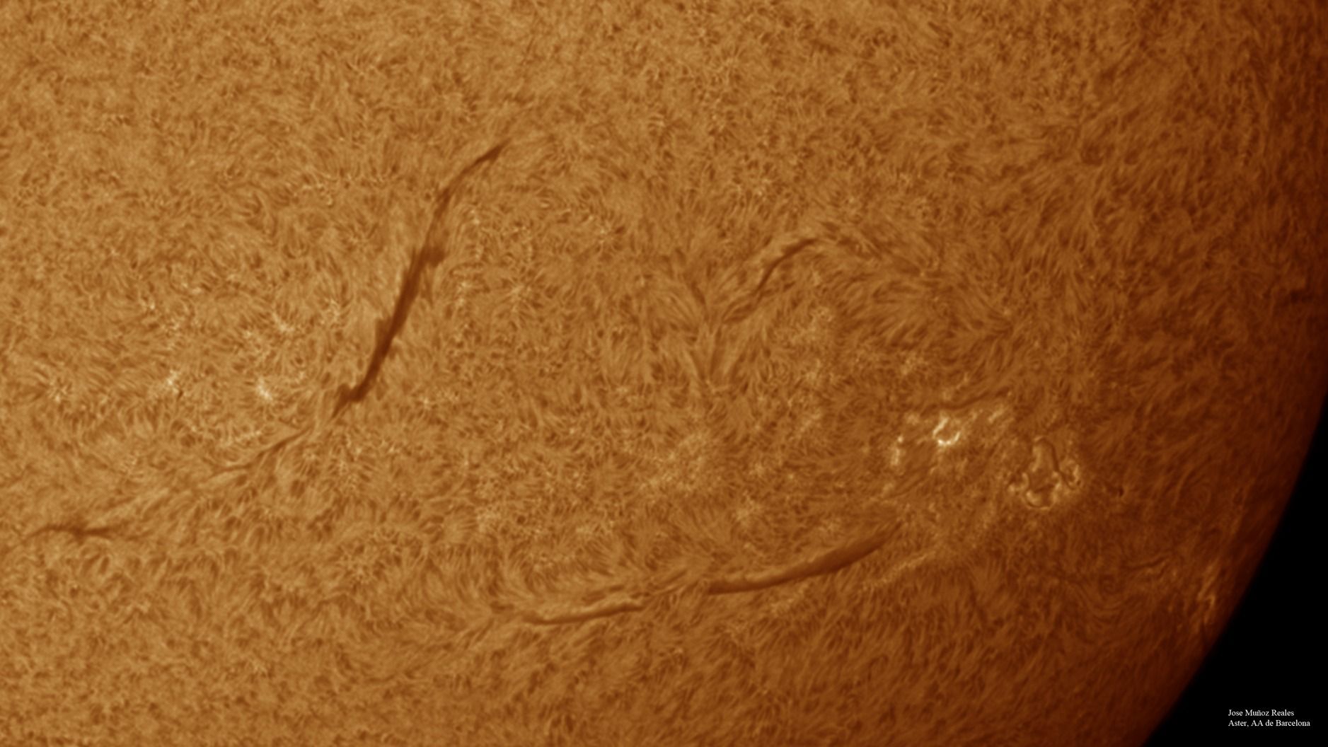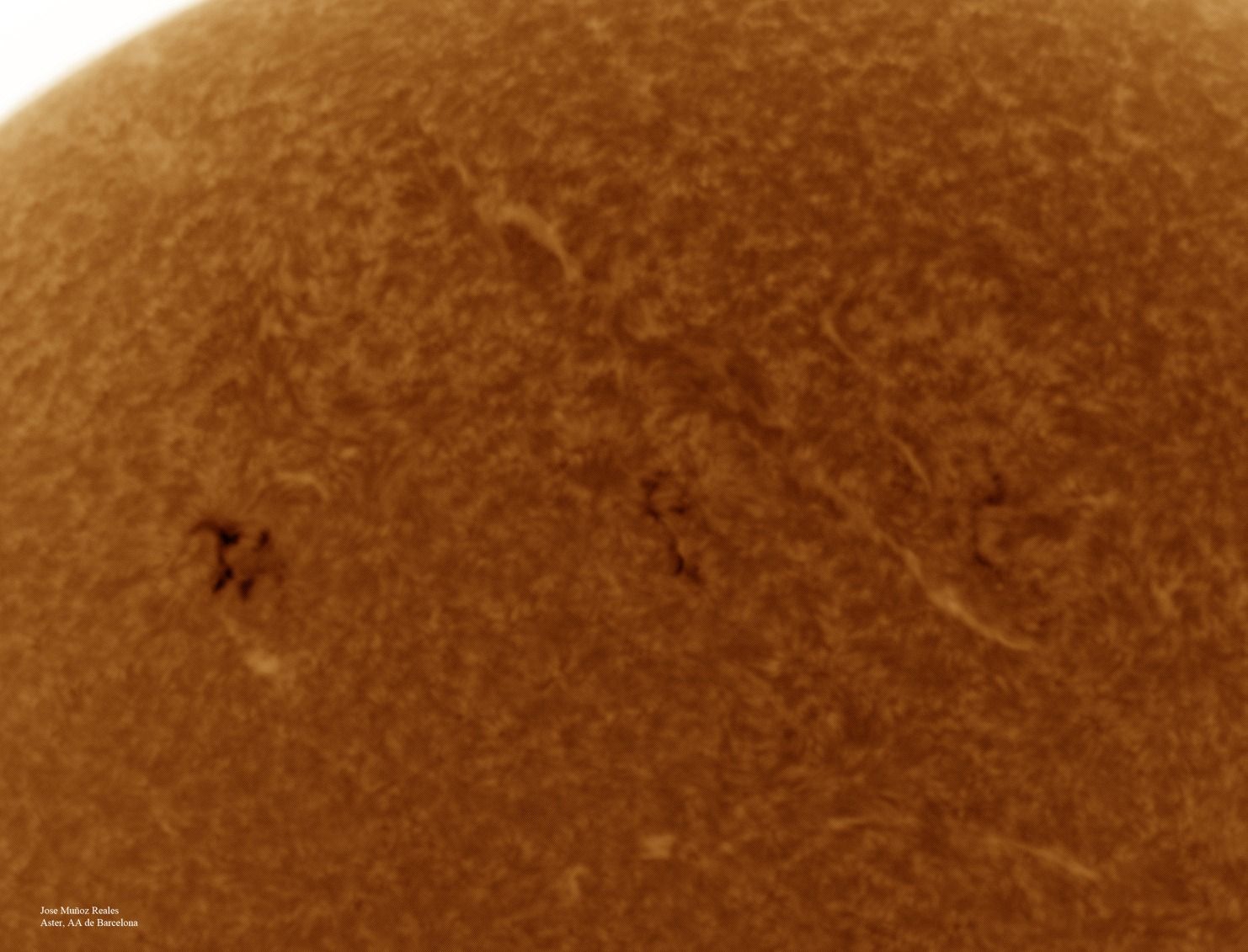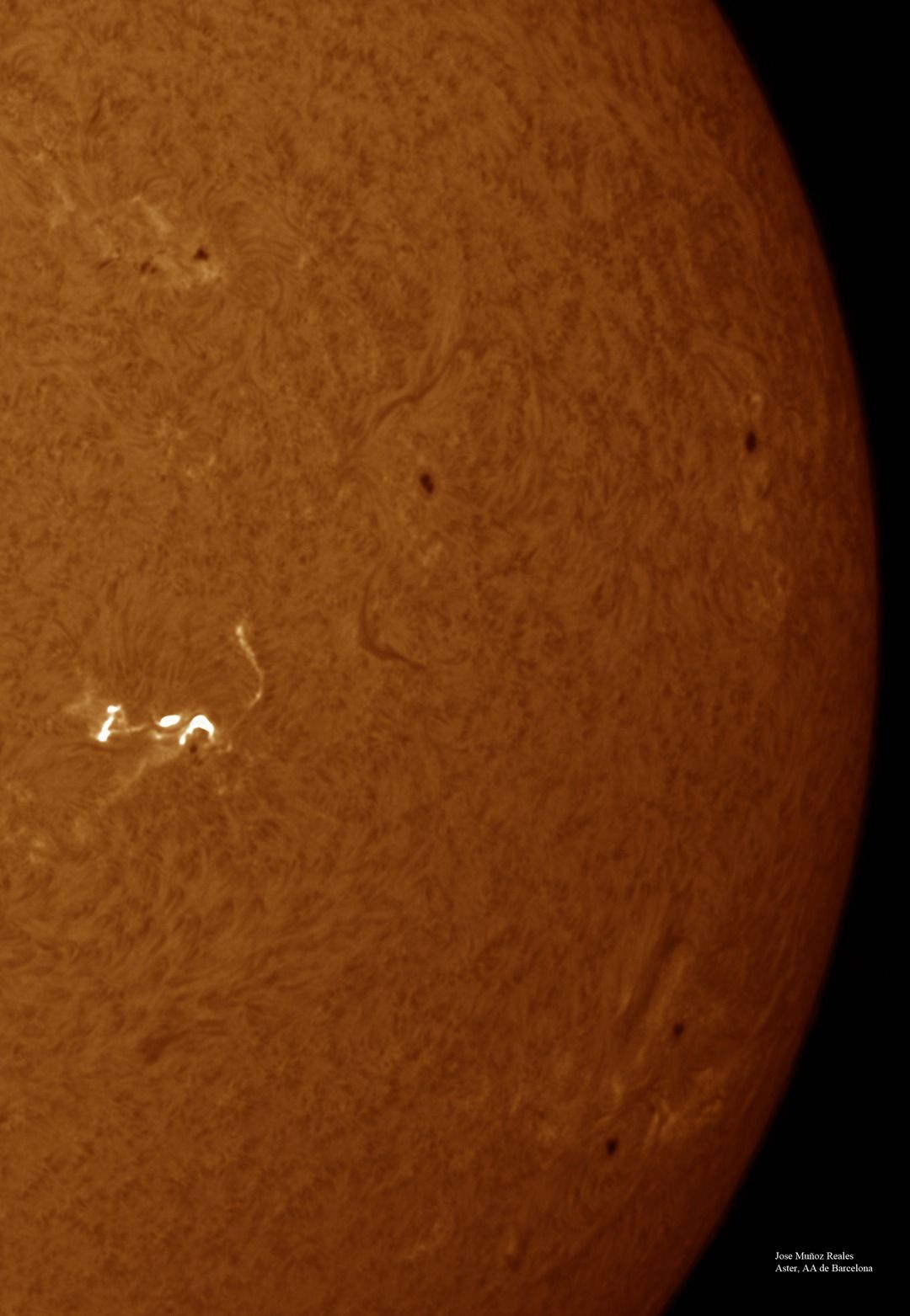 | Autor: Albert Sánchez Instrumento: - Ha: ED120 f-38 + ASI183MM + Quark H alpha - Ca: Baader K-Line - Visible: Filtro Calcio y Baader Astrosolar |